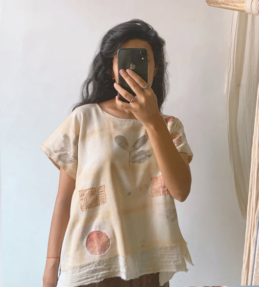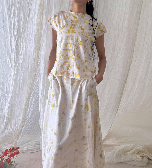 Every eco-printed piece celebrates the harmonious relationship between human creativity and the environment and serves as a reminder of our communication and collaboration with nature. This elaborate process can take up to 2-3 days to dye one garment, and always results in unique, one-of-kind results, where no two pieces are alike, yet all beautiful in their own right.