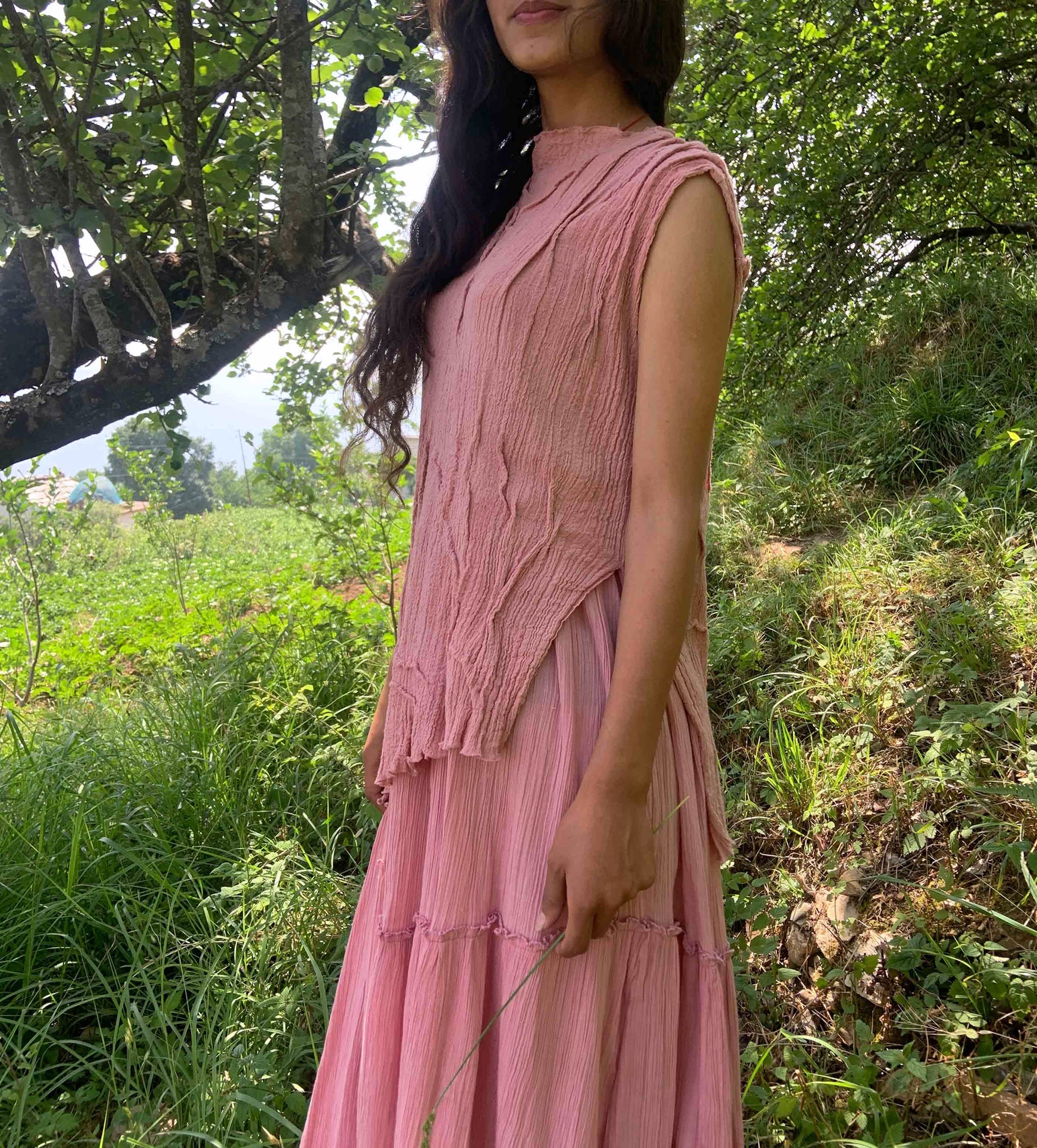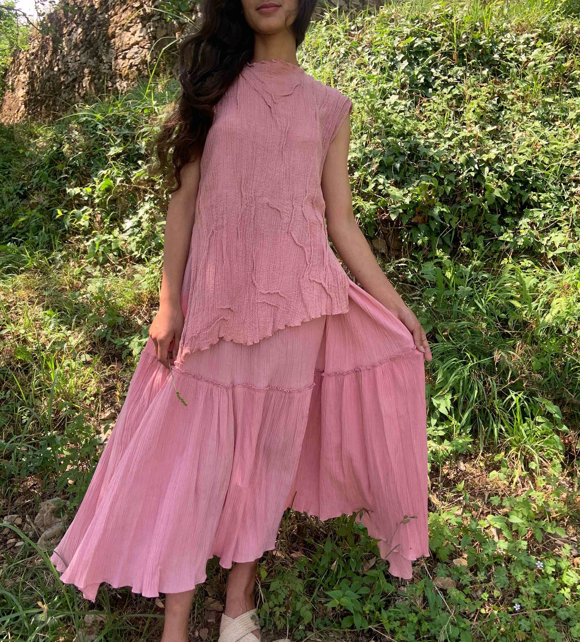 A blouse for slow summer days that easily transitions as a layering piece over shirts or tunics. Its soft fabric gently hugs the body and takes shape for easy movement.