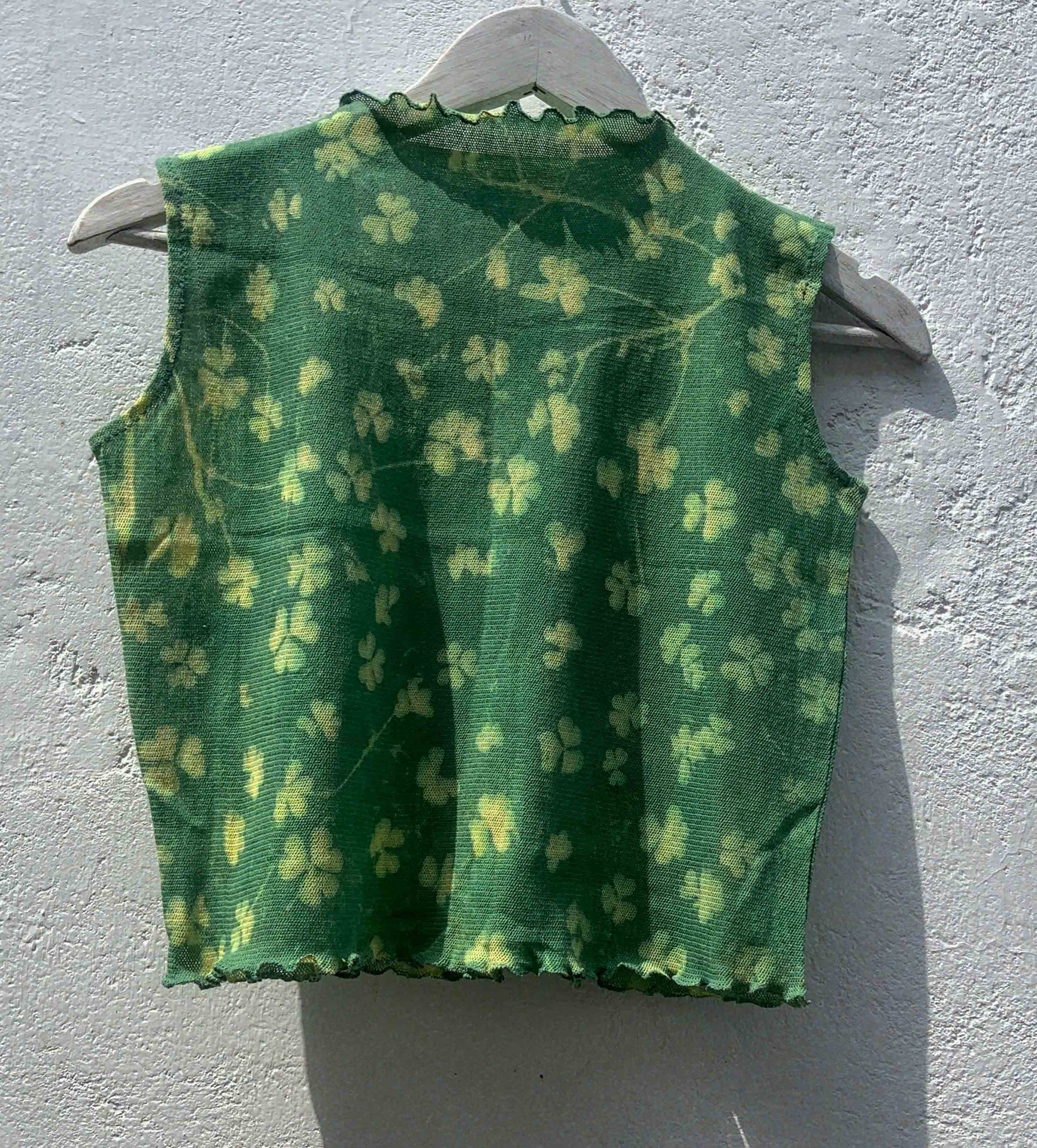 Clovers and ferns springing on this pair. The top is made in sheer and stretchy cotton knit. The pants come in a relaxed shape, both eco-printed with a bright green color, derived from mineral dyeing.