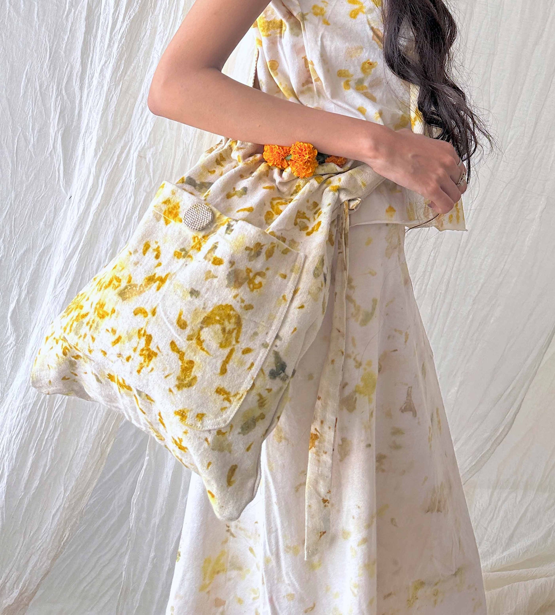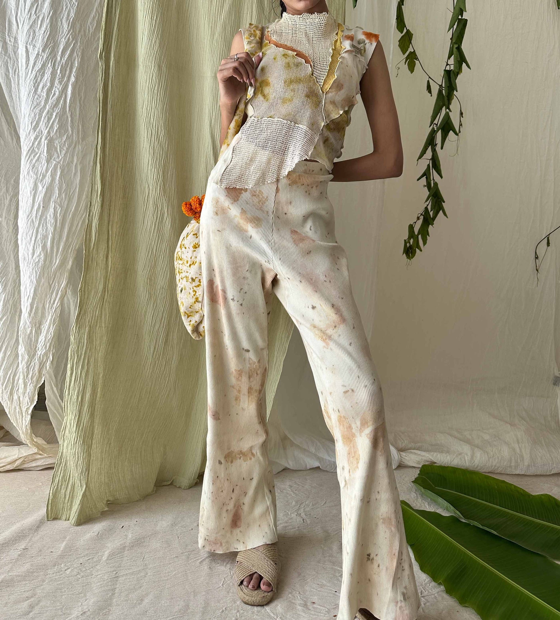 An ode to spring. Bringing varied stretchy and sheer knits together to create a one-of-a-kind blouse, paired with comfortable cotton ribbed pants, colored using marigold flowers. Completed with a bag in recycled canvas, dyed using temple flowers.