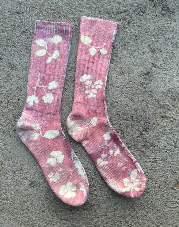 Floral socks, hand-dyed by rural women, using foraged leaves from our garden.