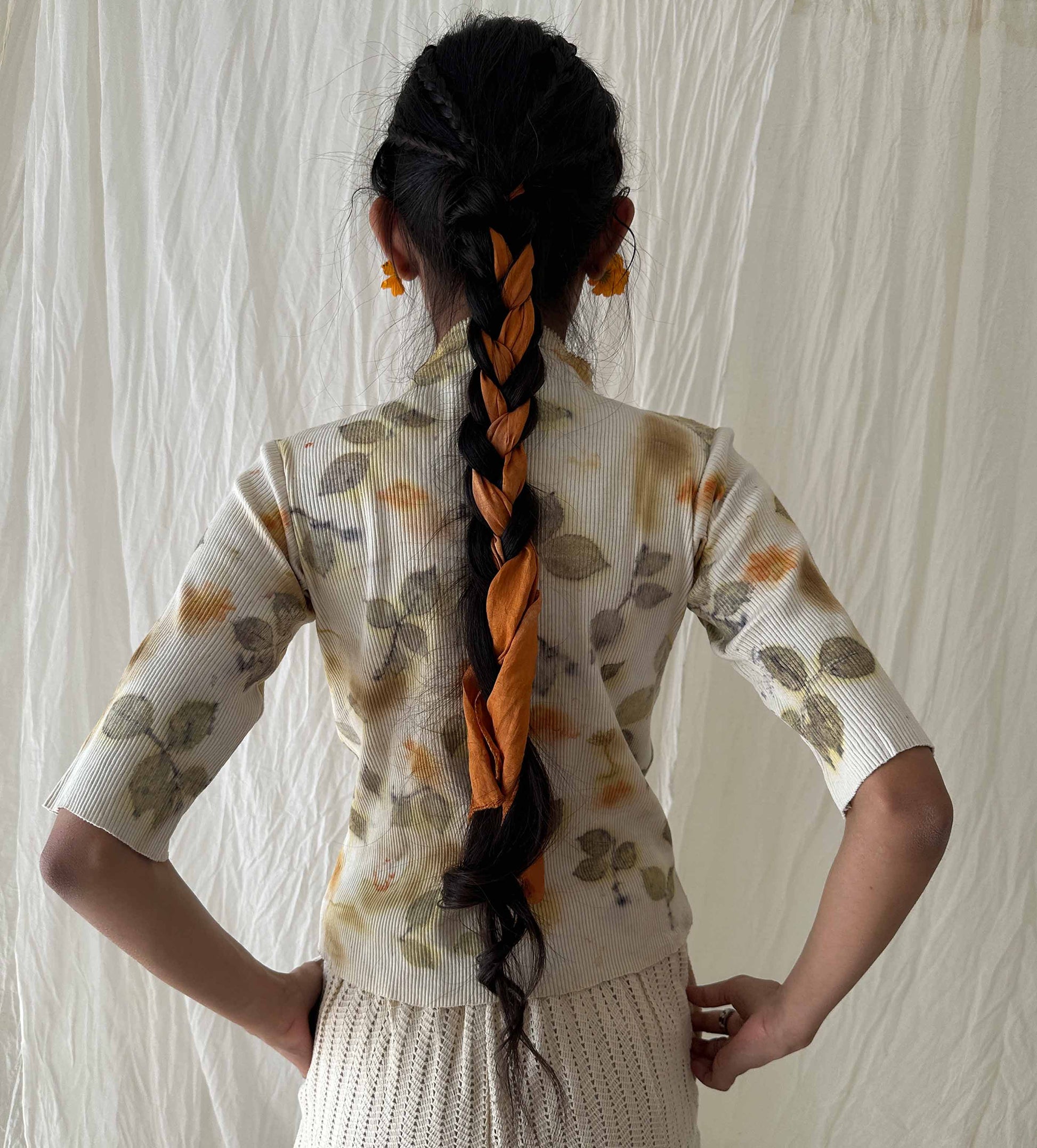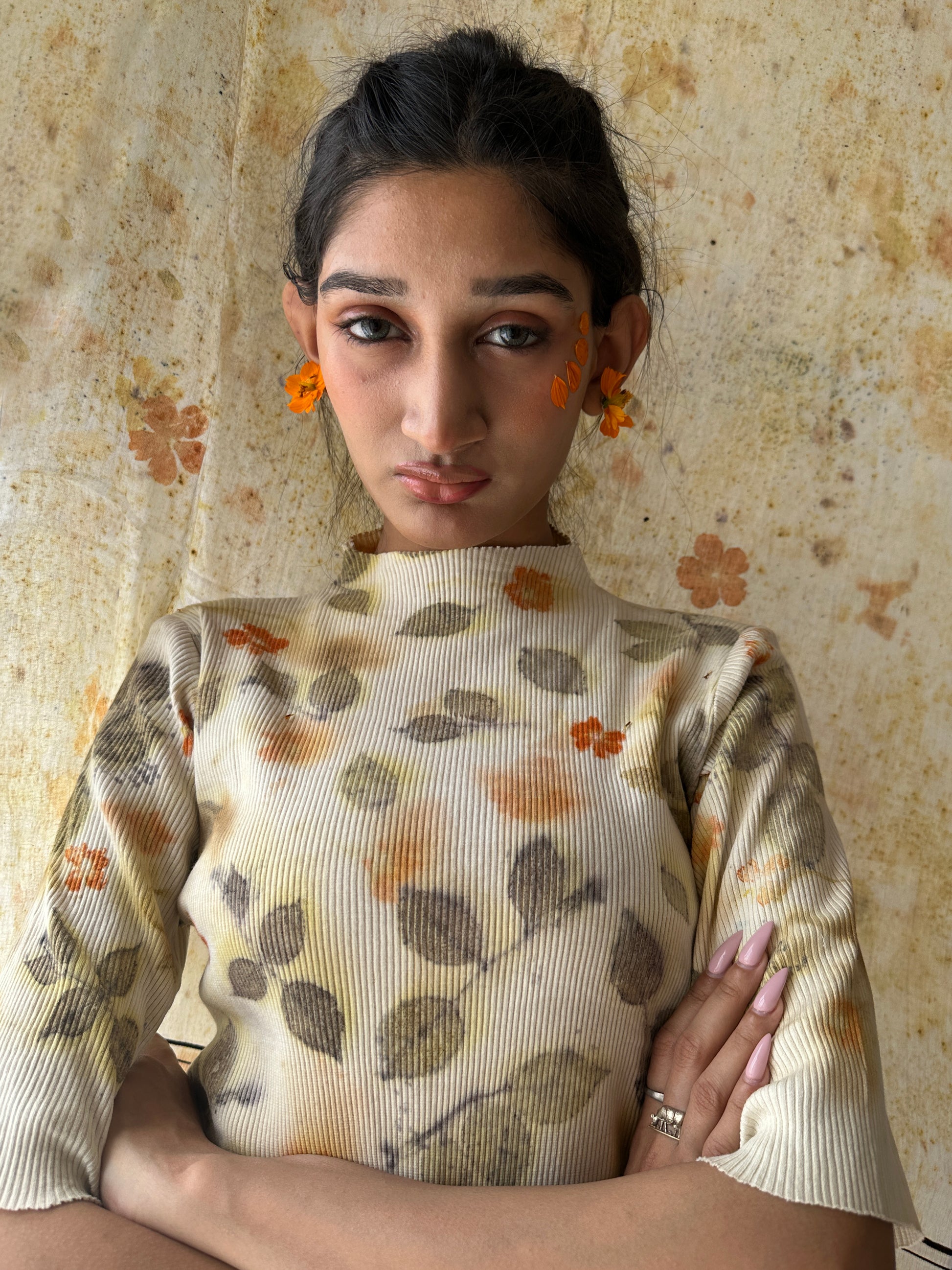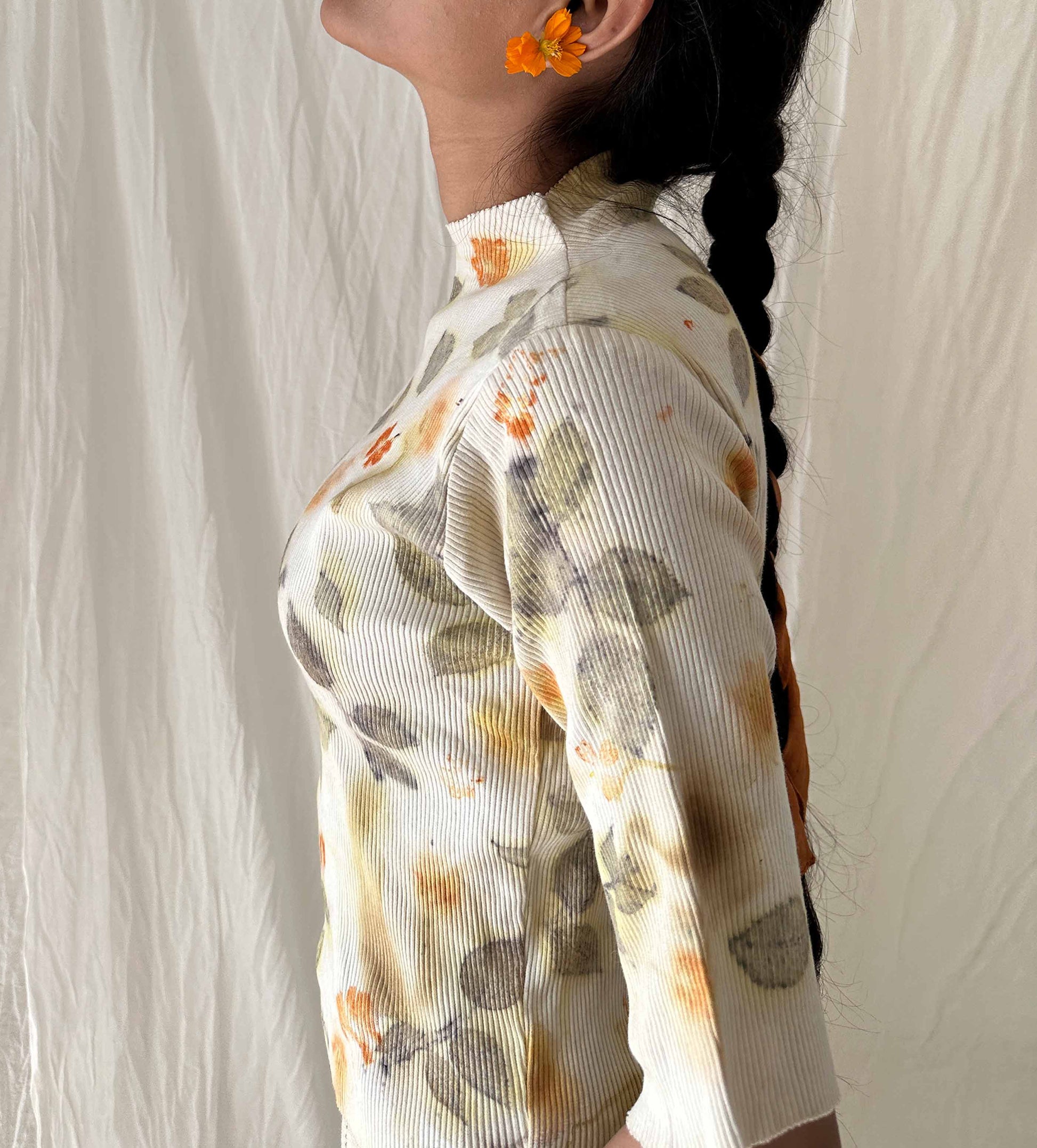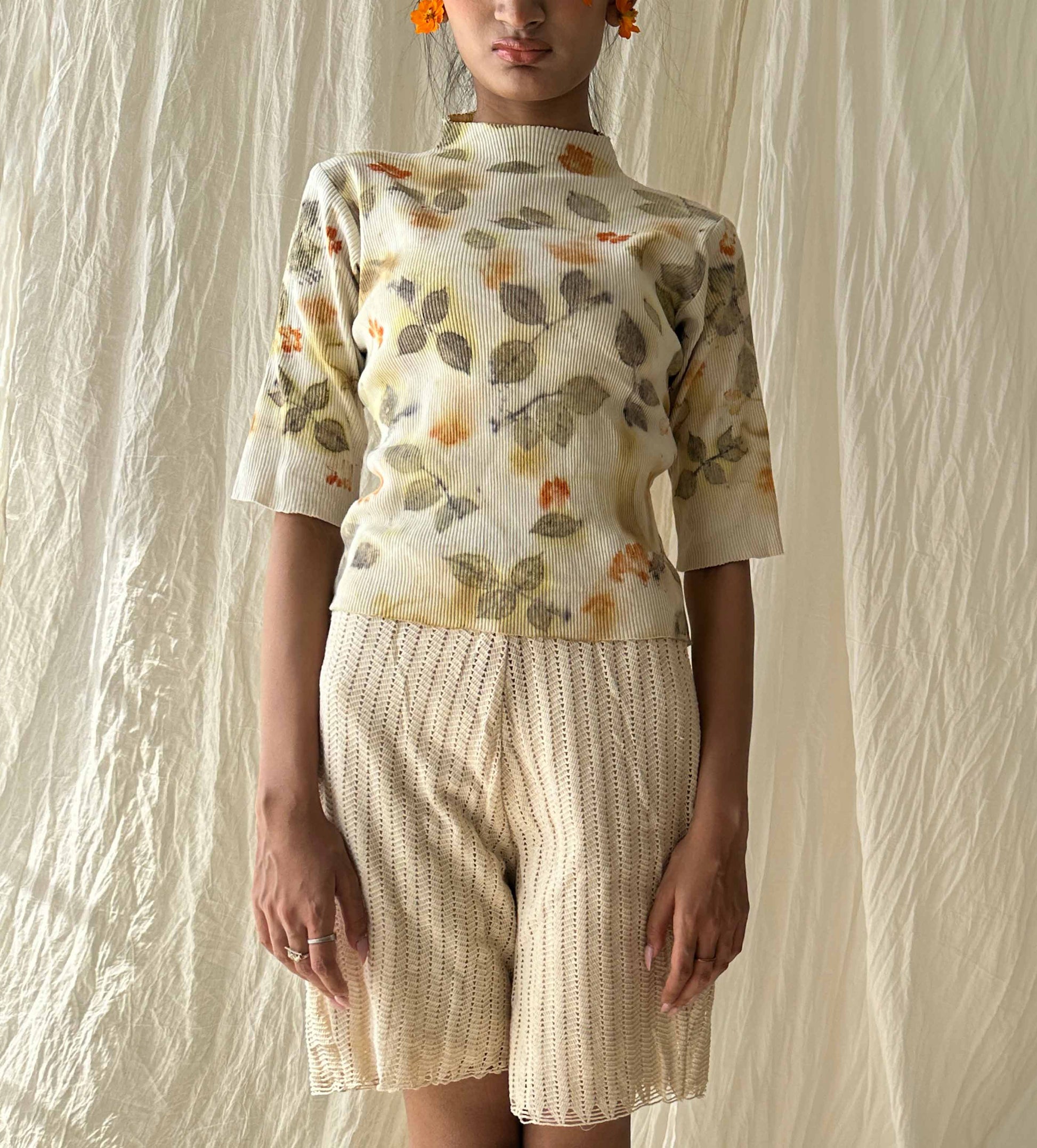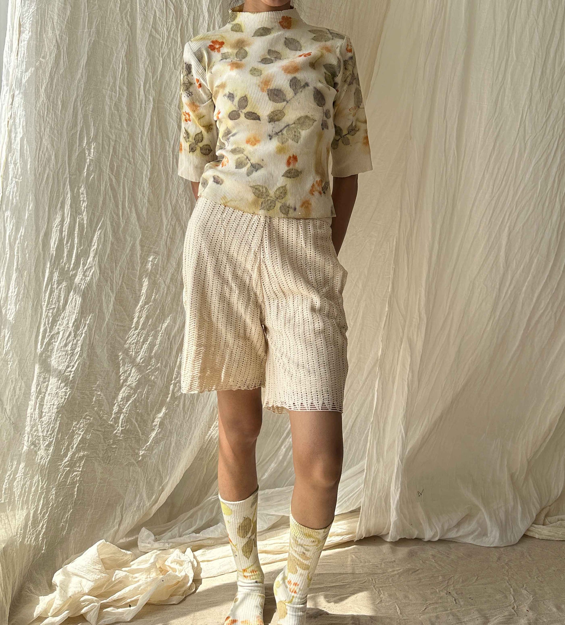 A snug, cotton knit rib top that celebrates spring, with rose leaves and seasonal flowers from our garden.