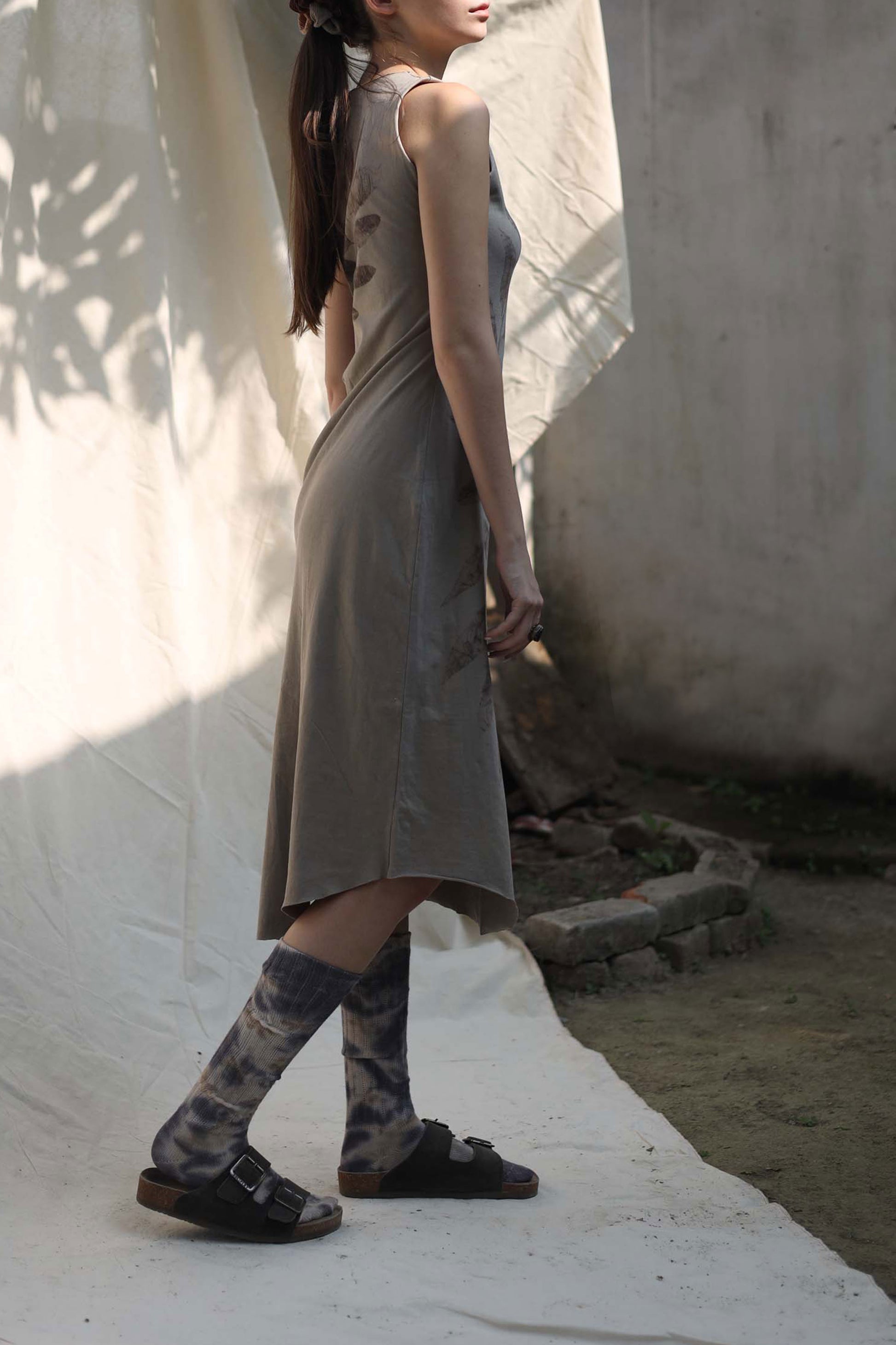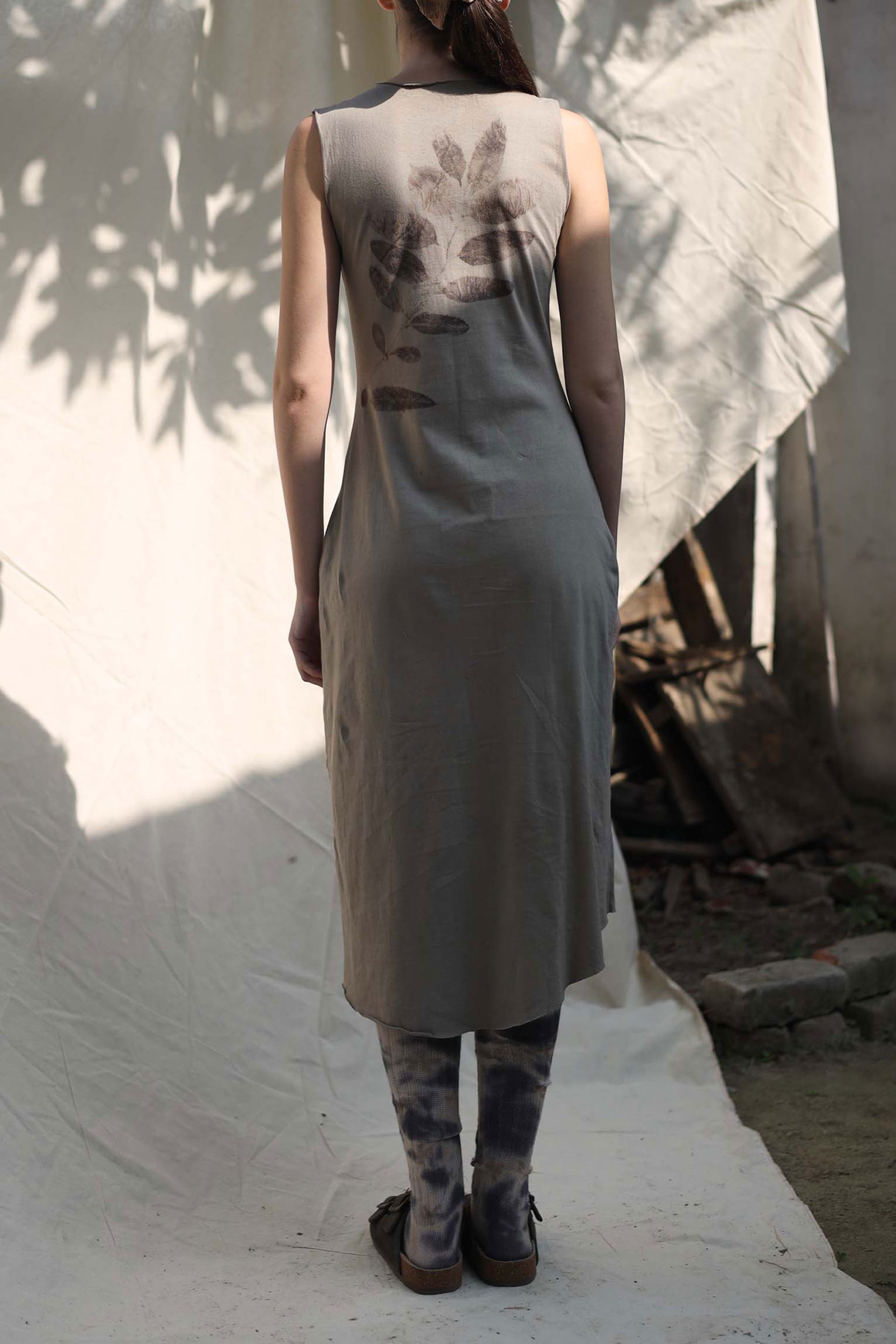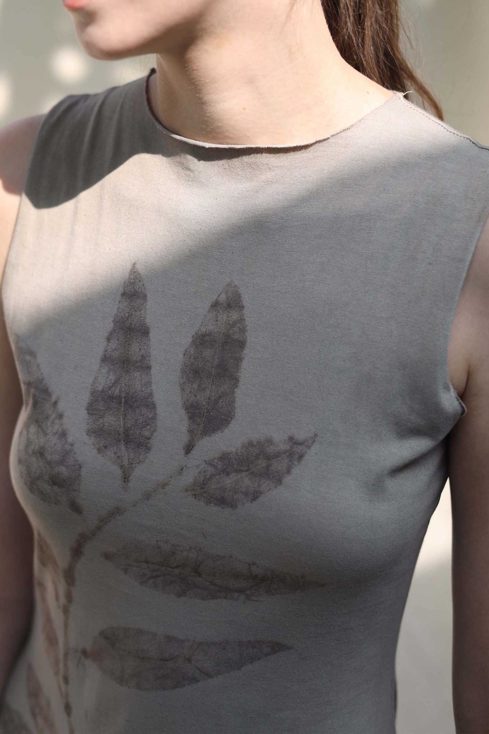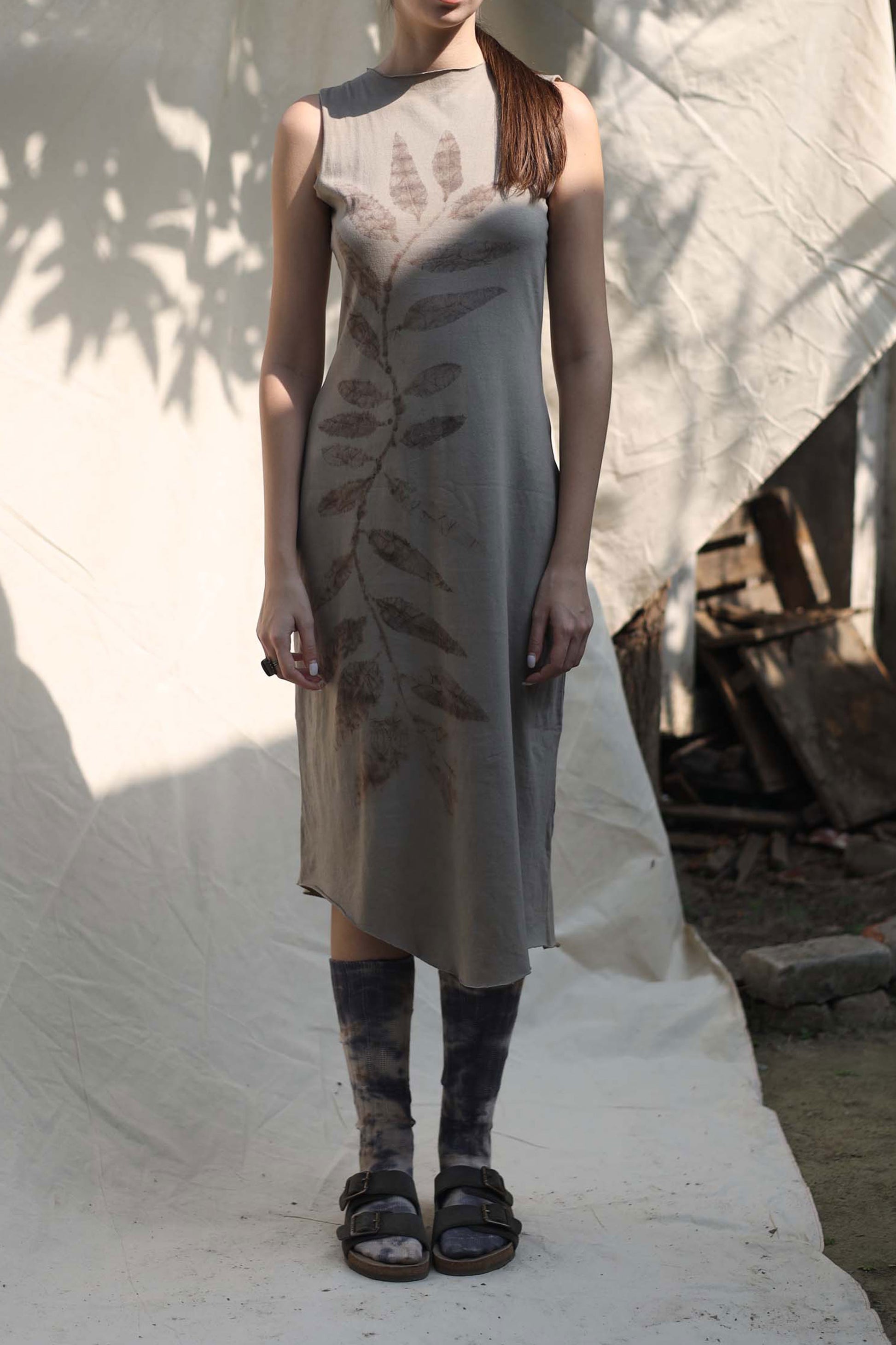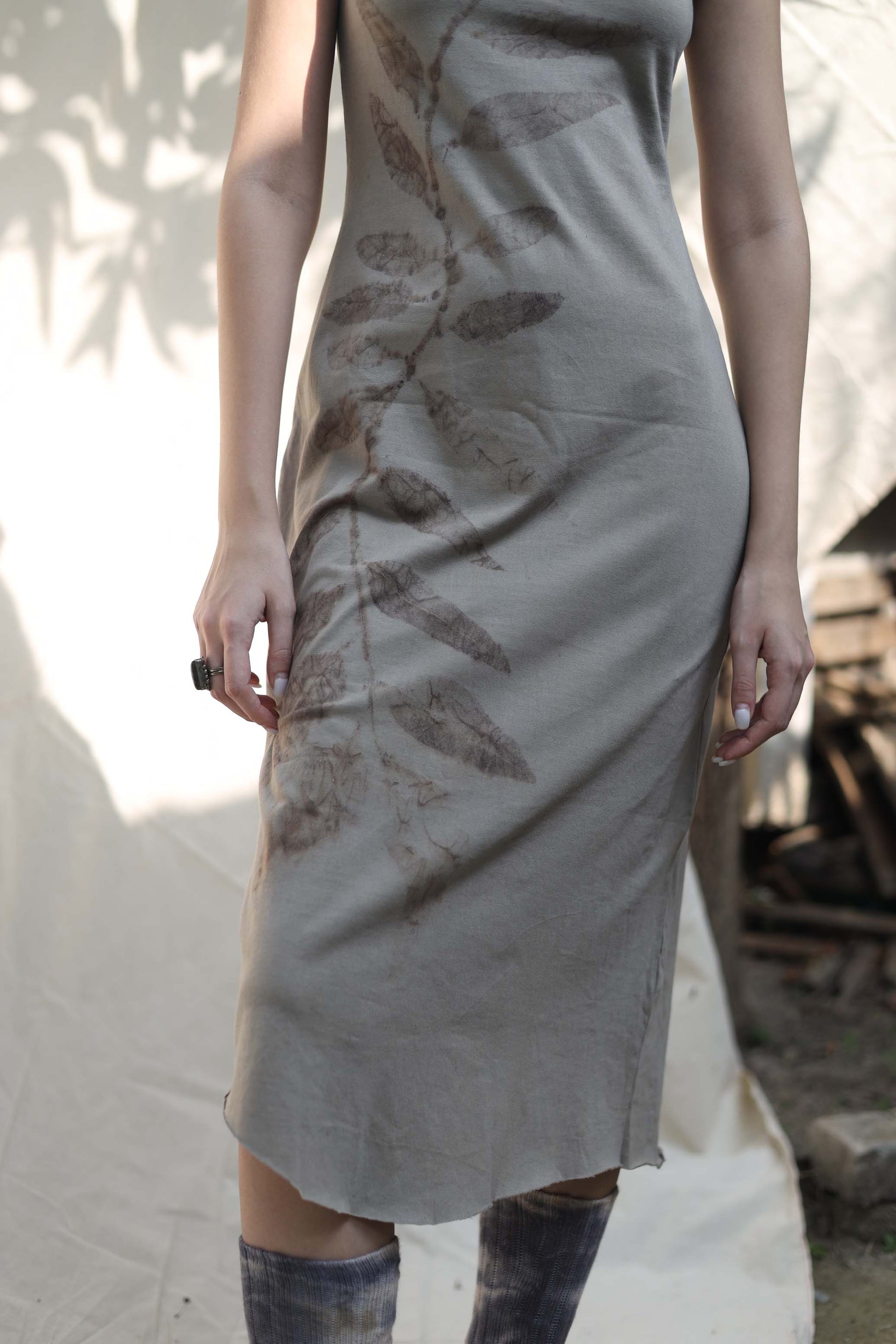 Each dress is individually printed, with real leaves. Each branch is handpicked and laid down for further printing process. It takes several hours and many hands, just to print one garment.