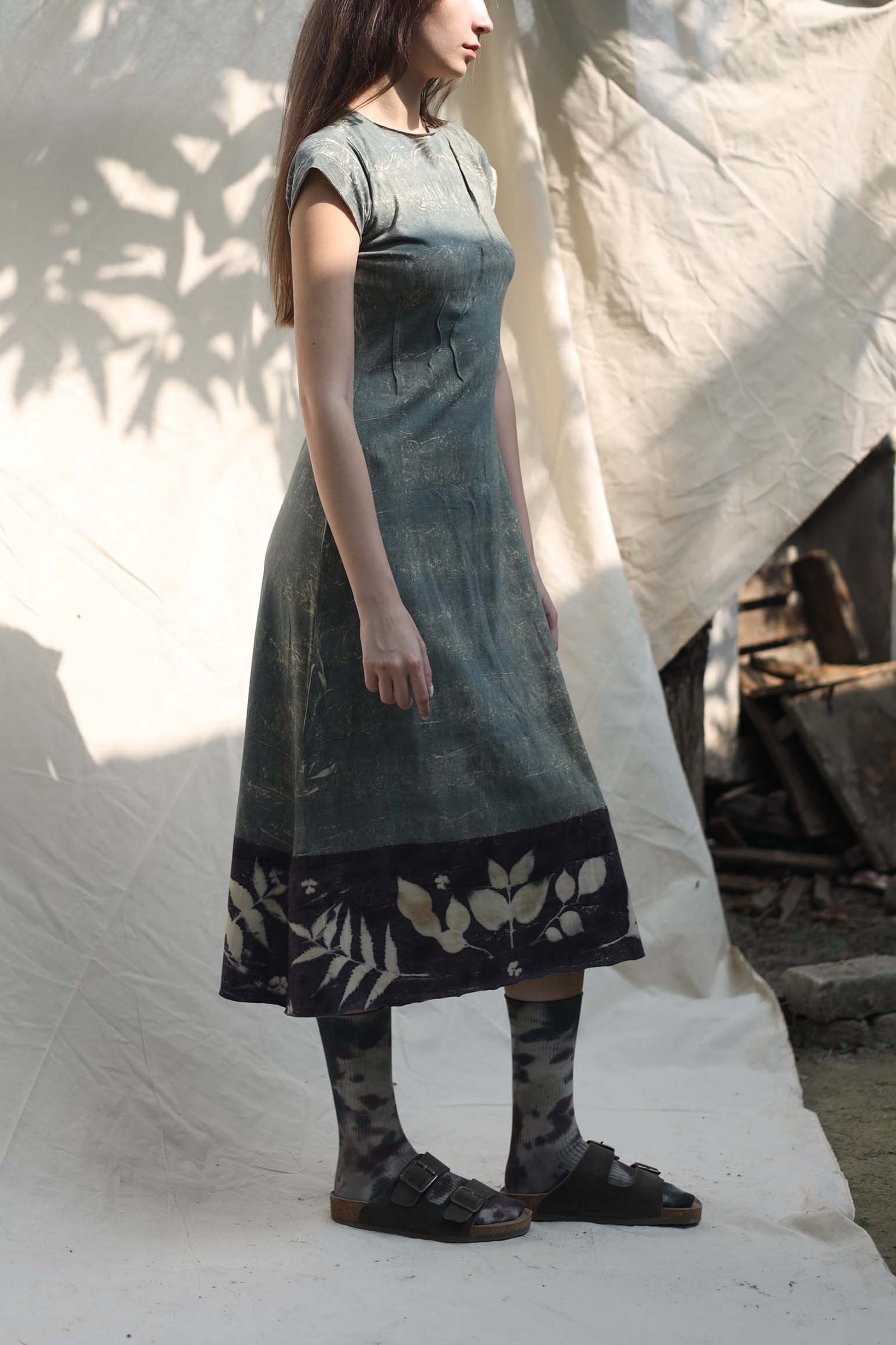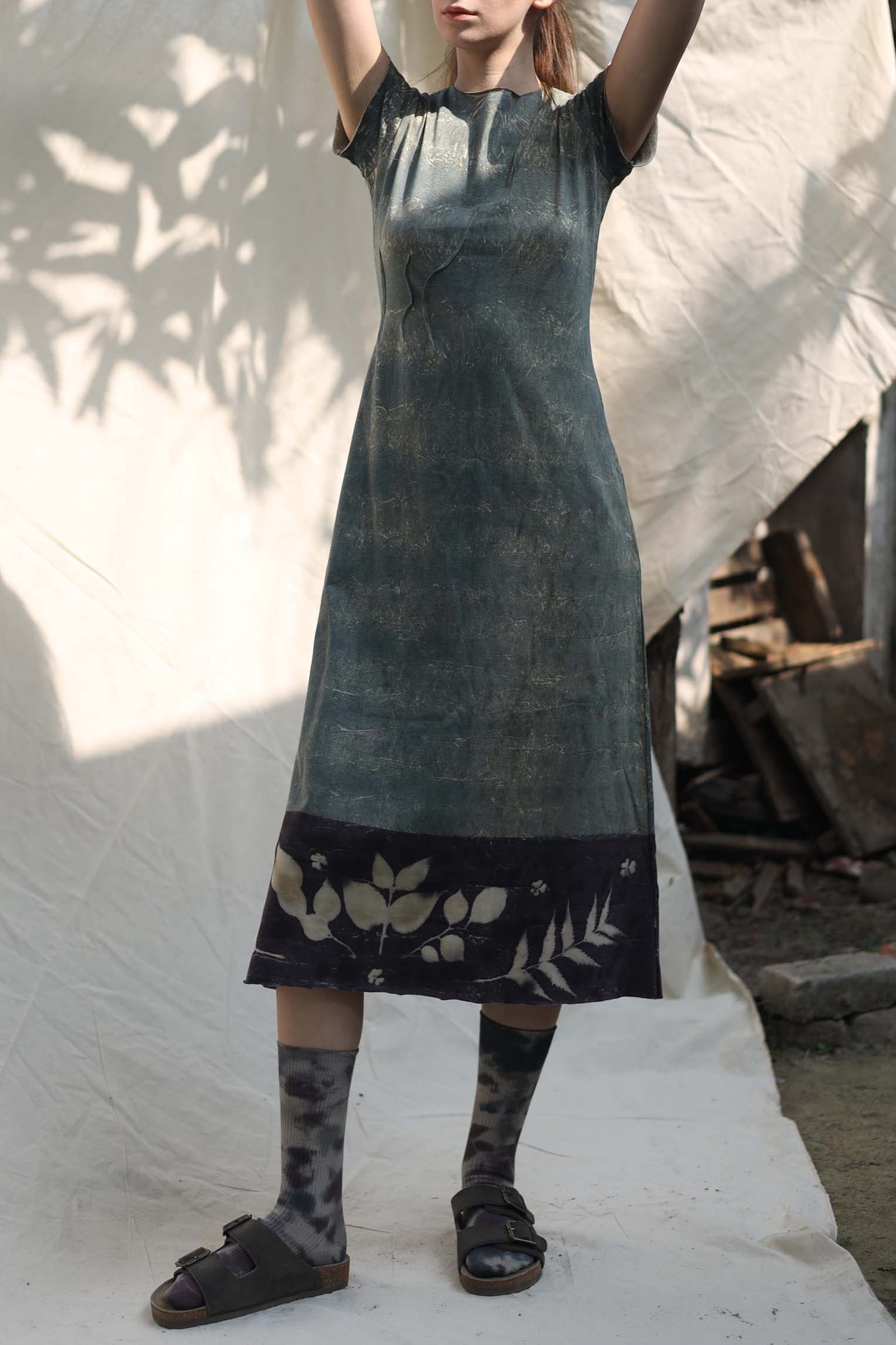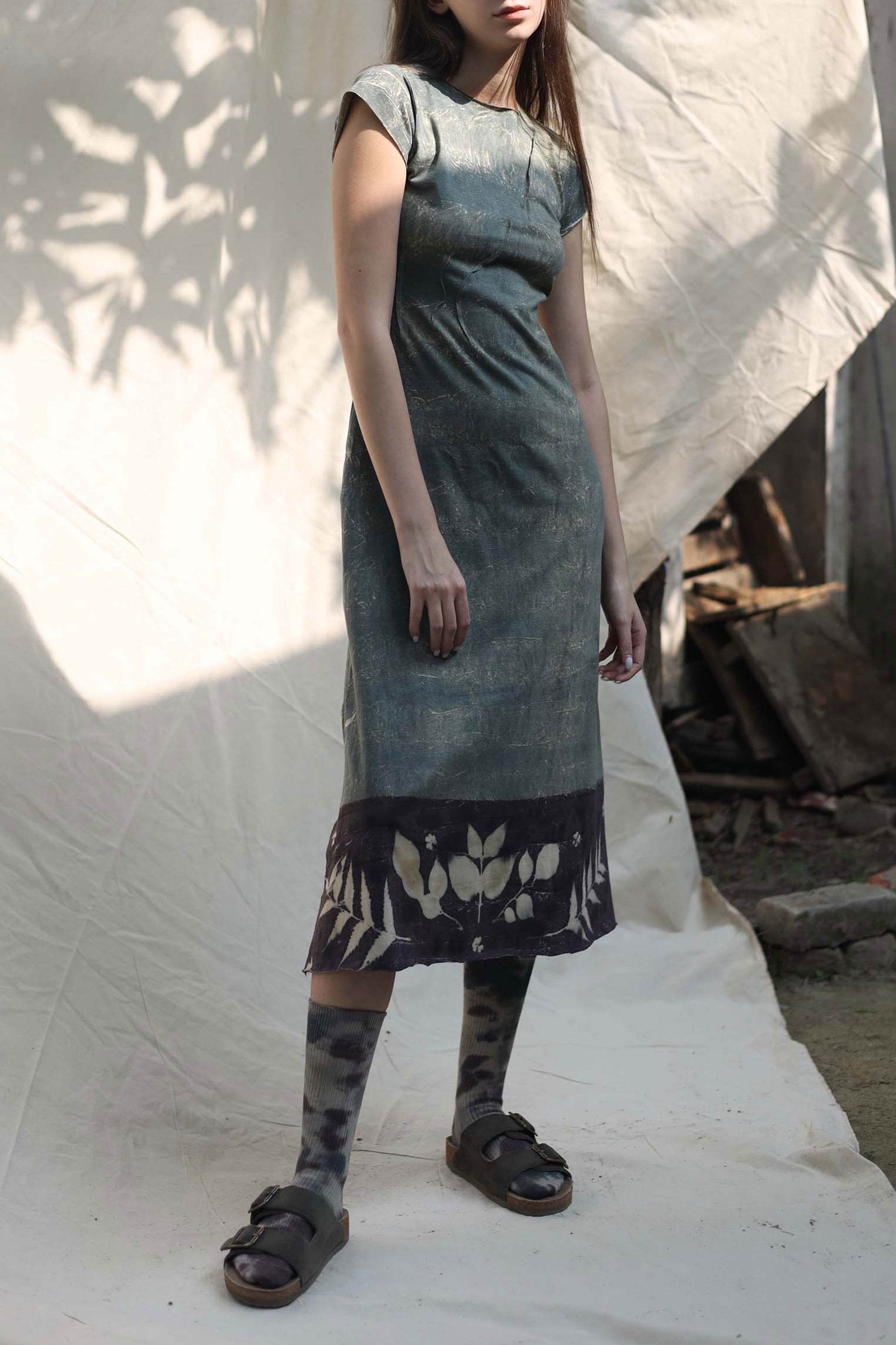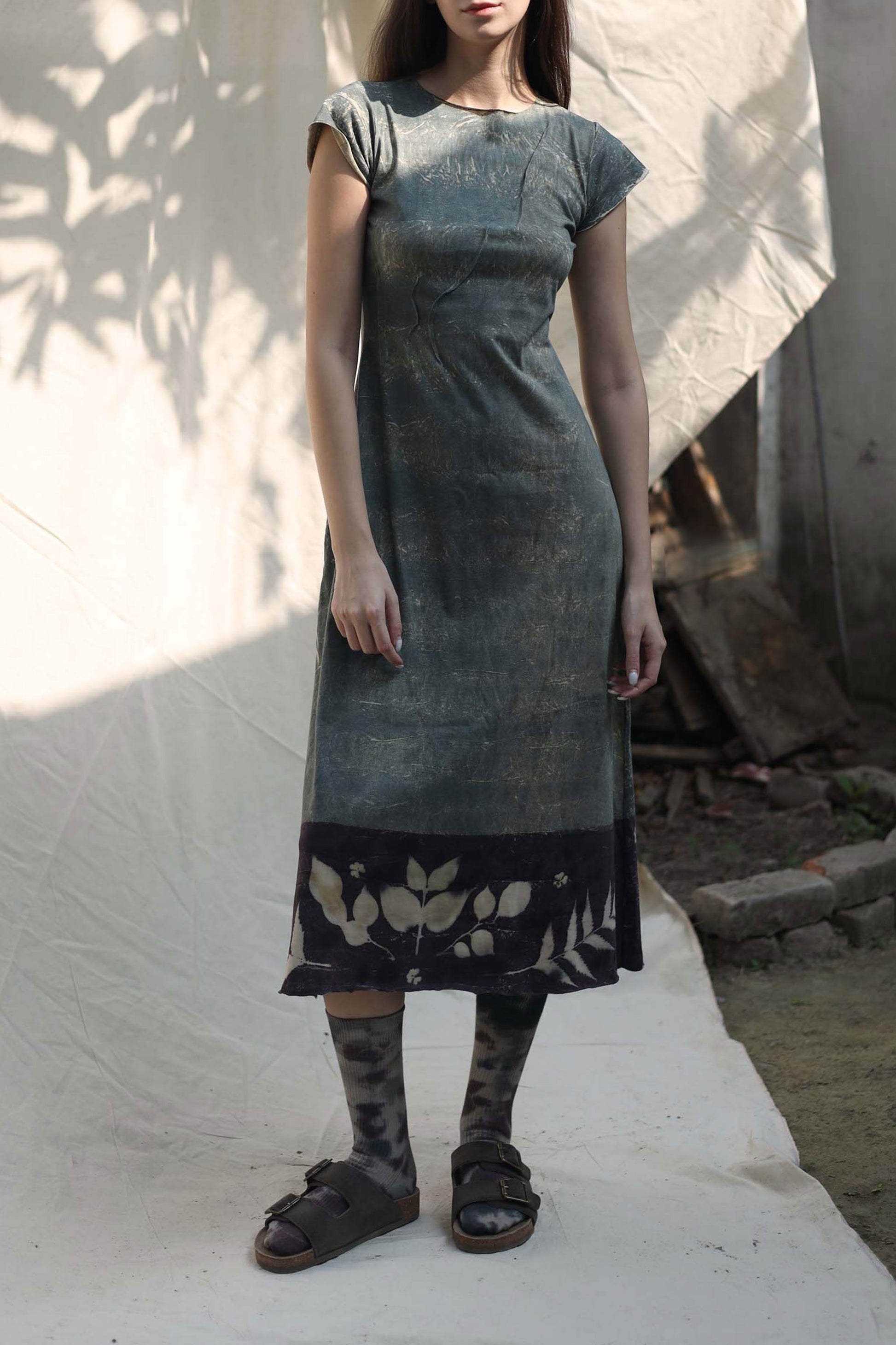 A botanically printed snug and stretchy dress, which gets its unique texture from amalgamating natural dyes like Indigo, myrobalan, Oak galls.