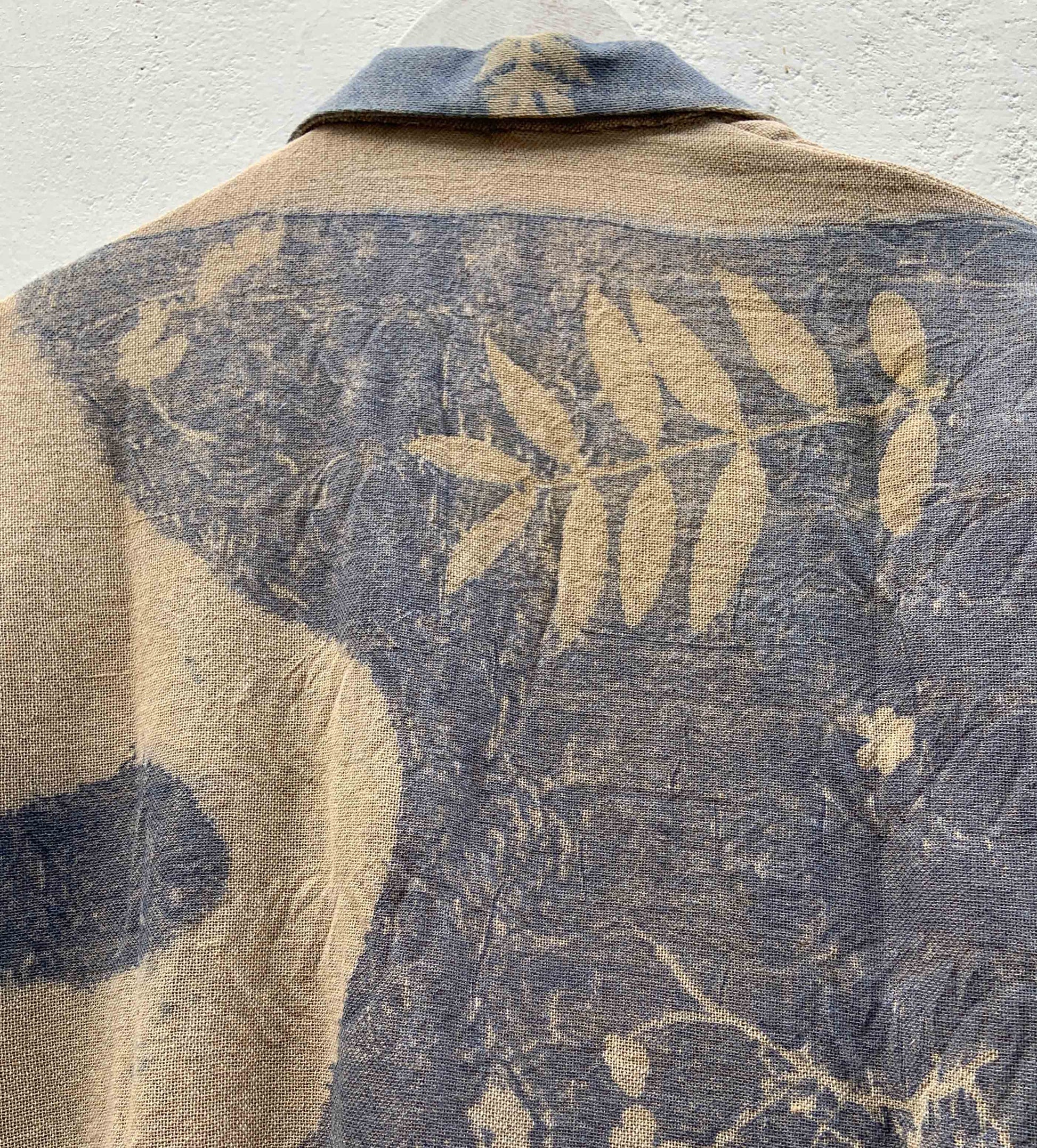 A unisex shirt dyed using natural Indigo extracts and foraged leaves.