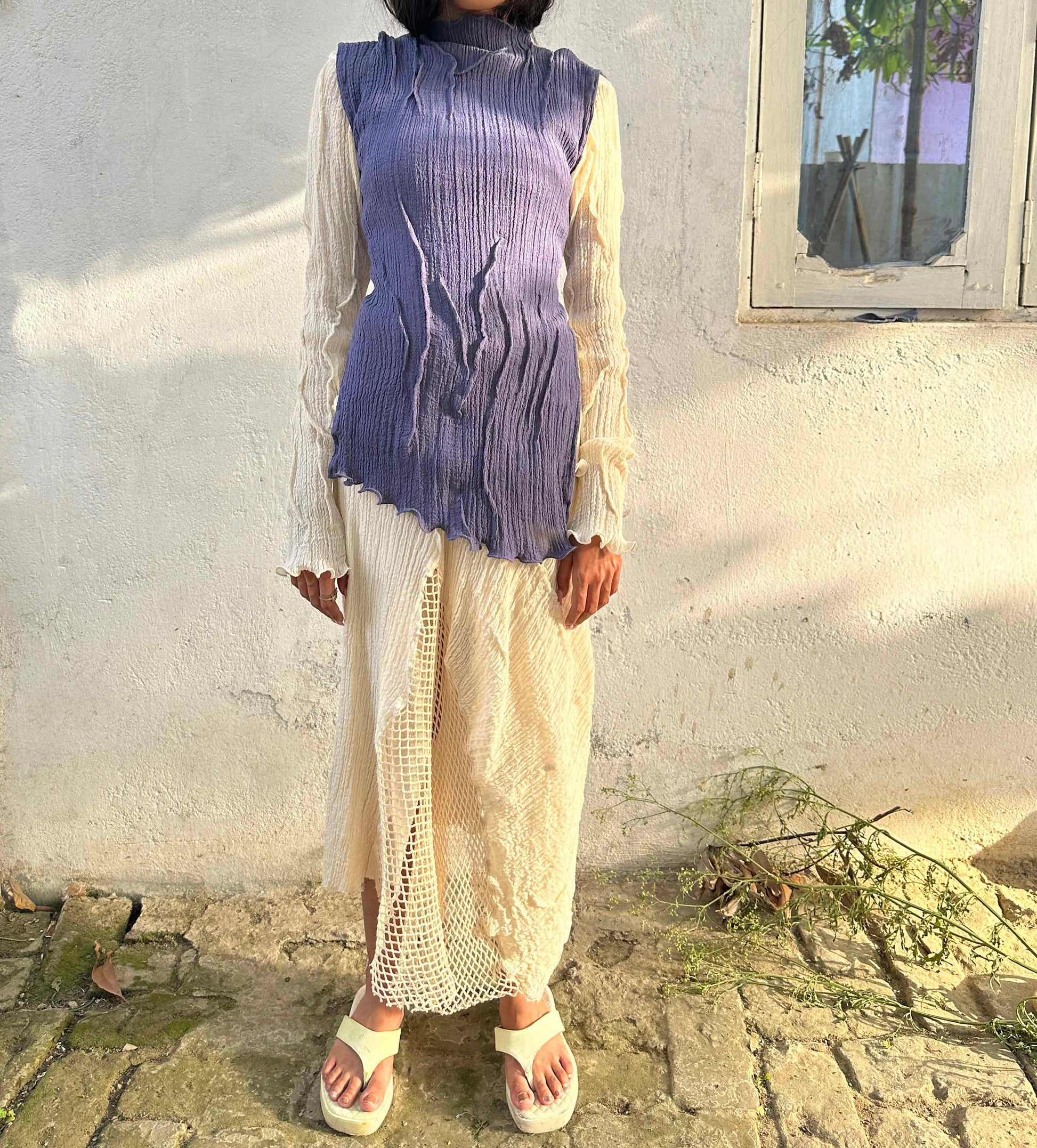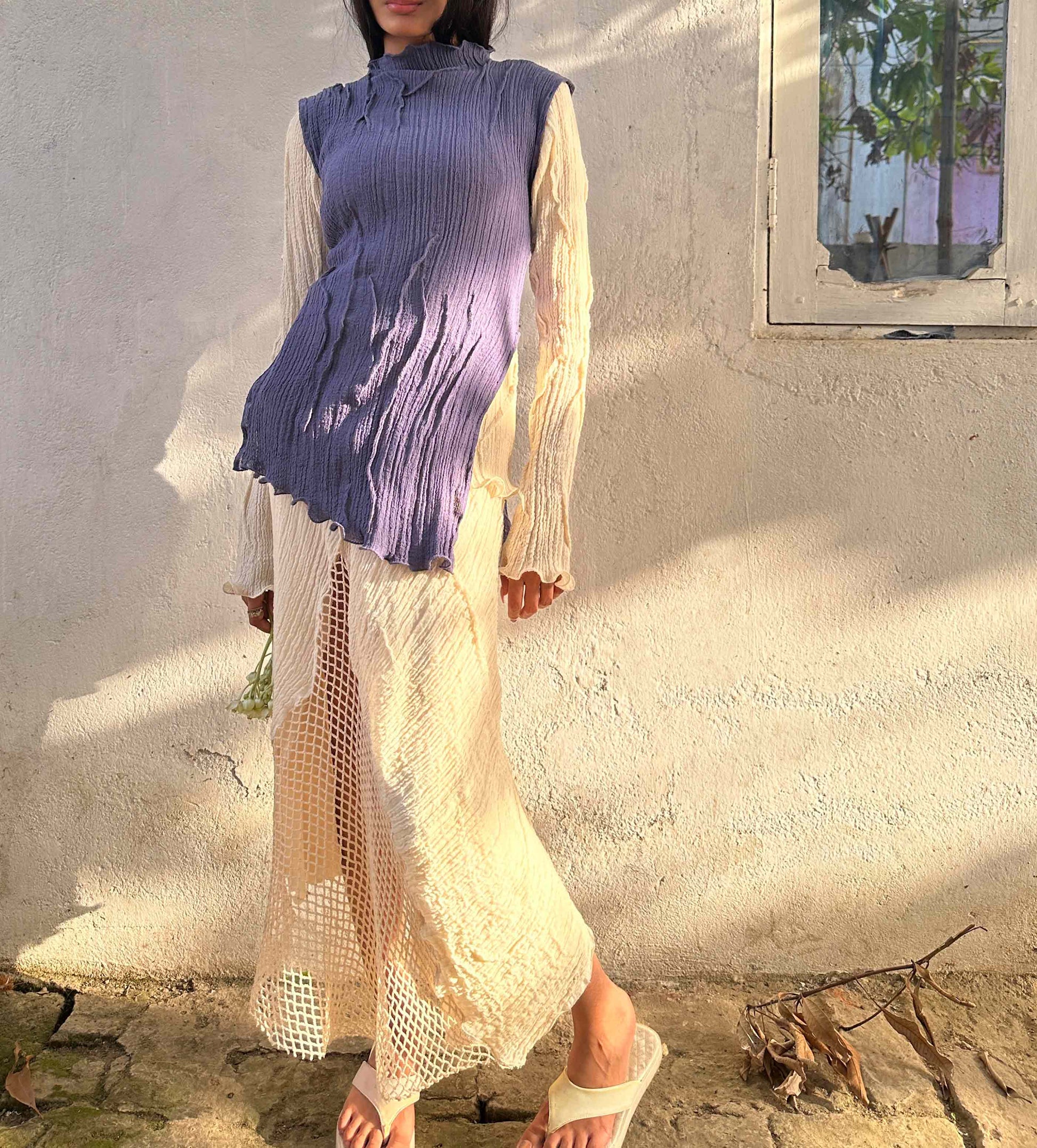 Handmade textures on our most loved riptide and Leia skirt, along with Jamun overlay top,to brighten a dull moment. The whole look is made in 100% soft cotton, which gently hugs the body and takes shape for easy movement.