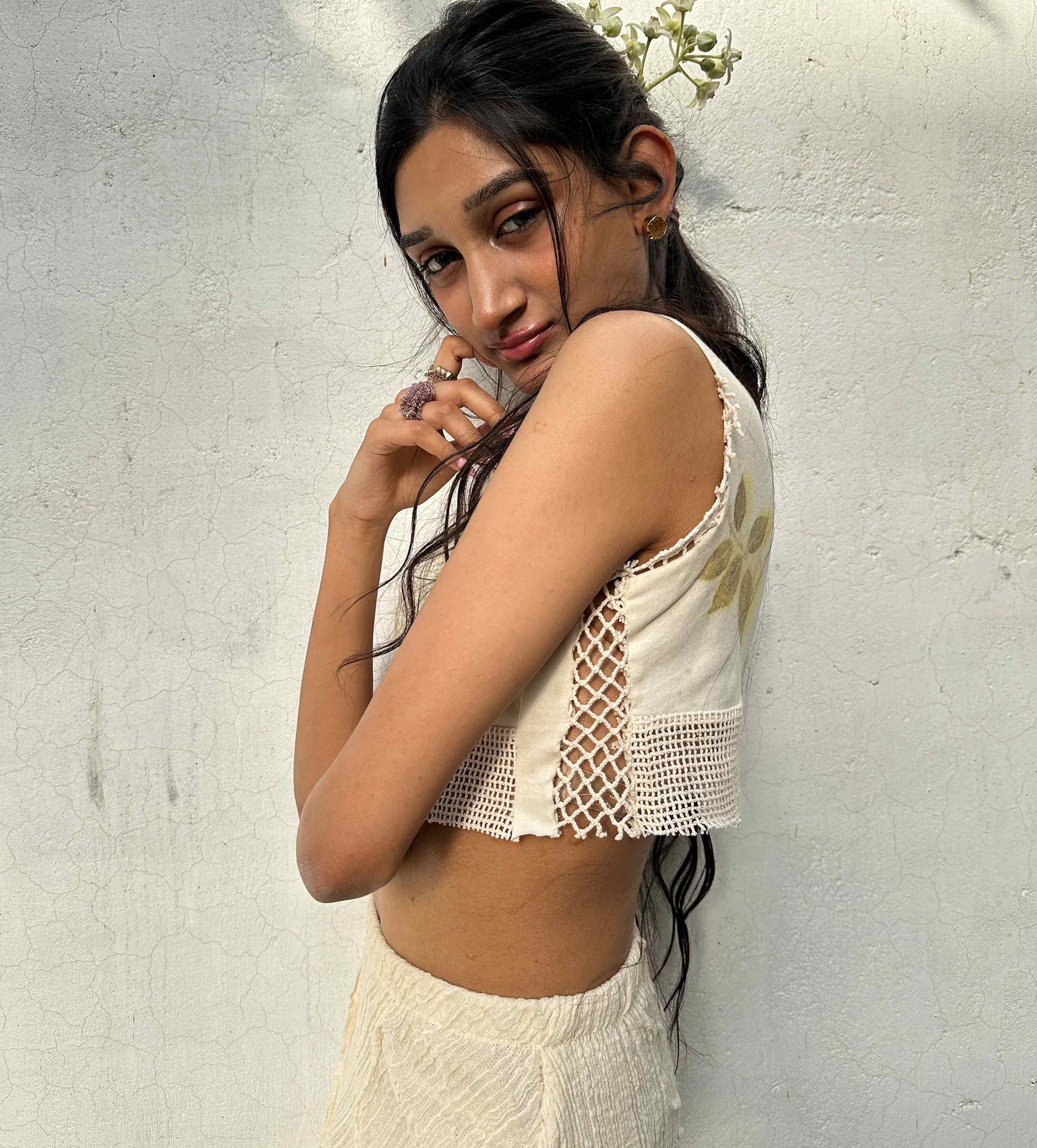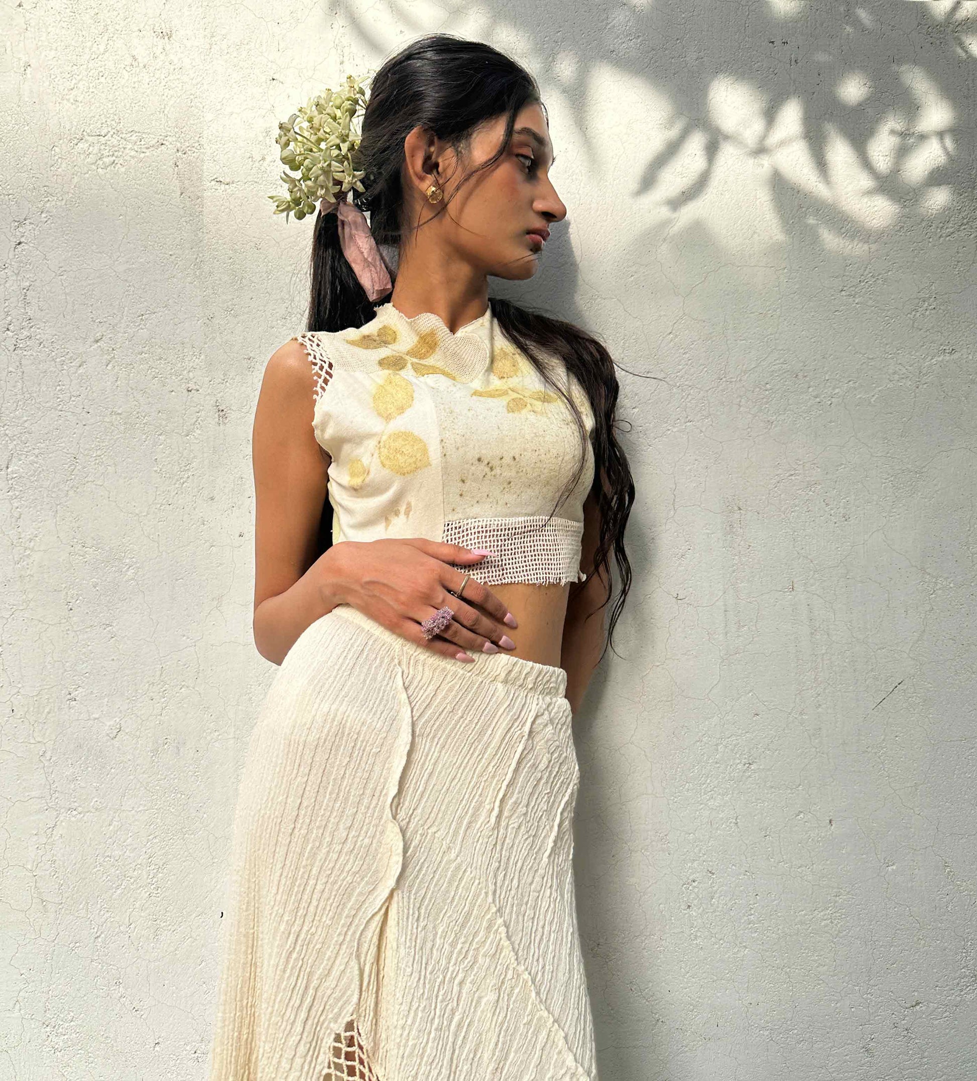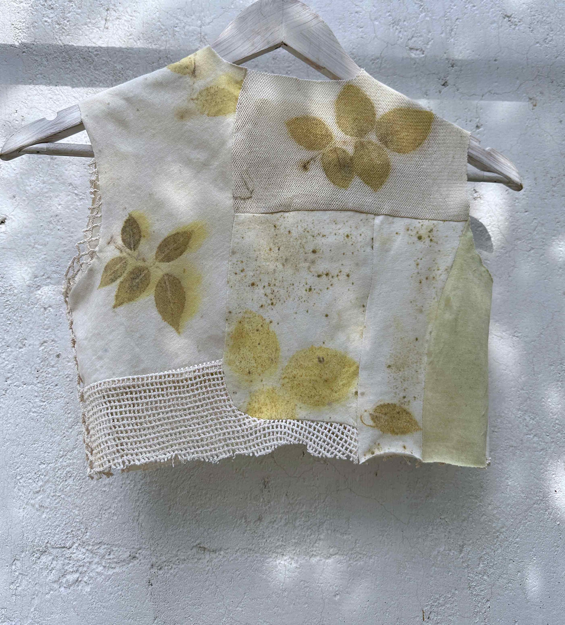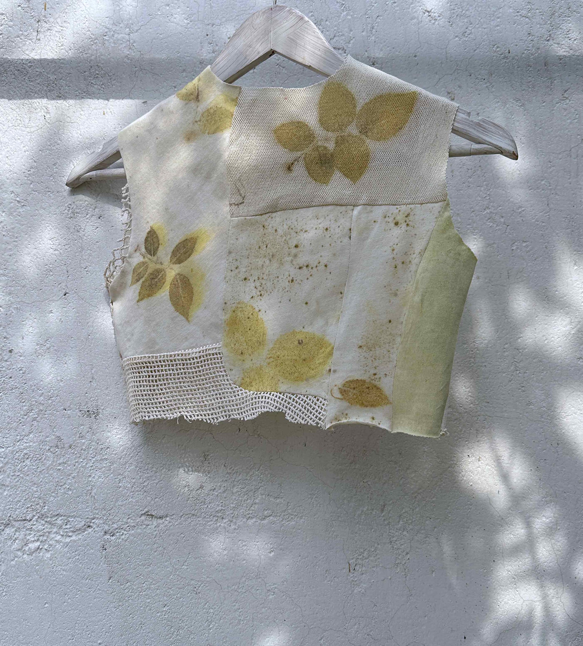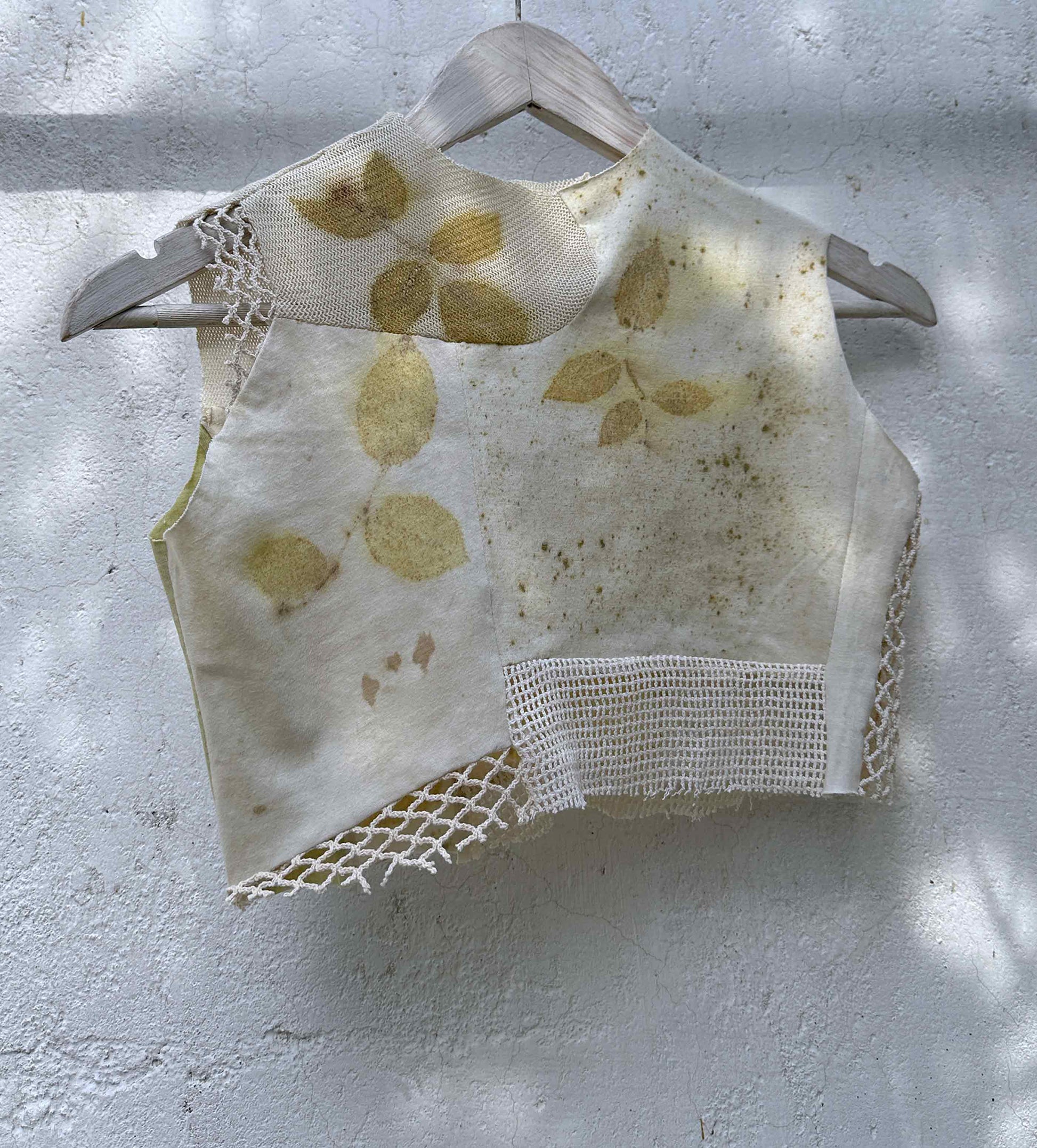 Snug, short top imprinted with rose leaves from our garden. Its tiny sheer details, and pomo grenade sprinkles, make it a one-of-a-kind beauty, that gently wraps the body and feels like receiving a hug from nature.
