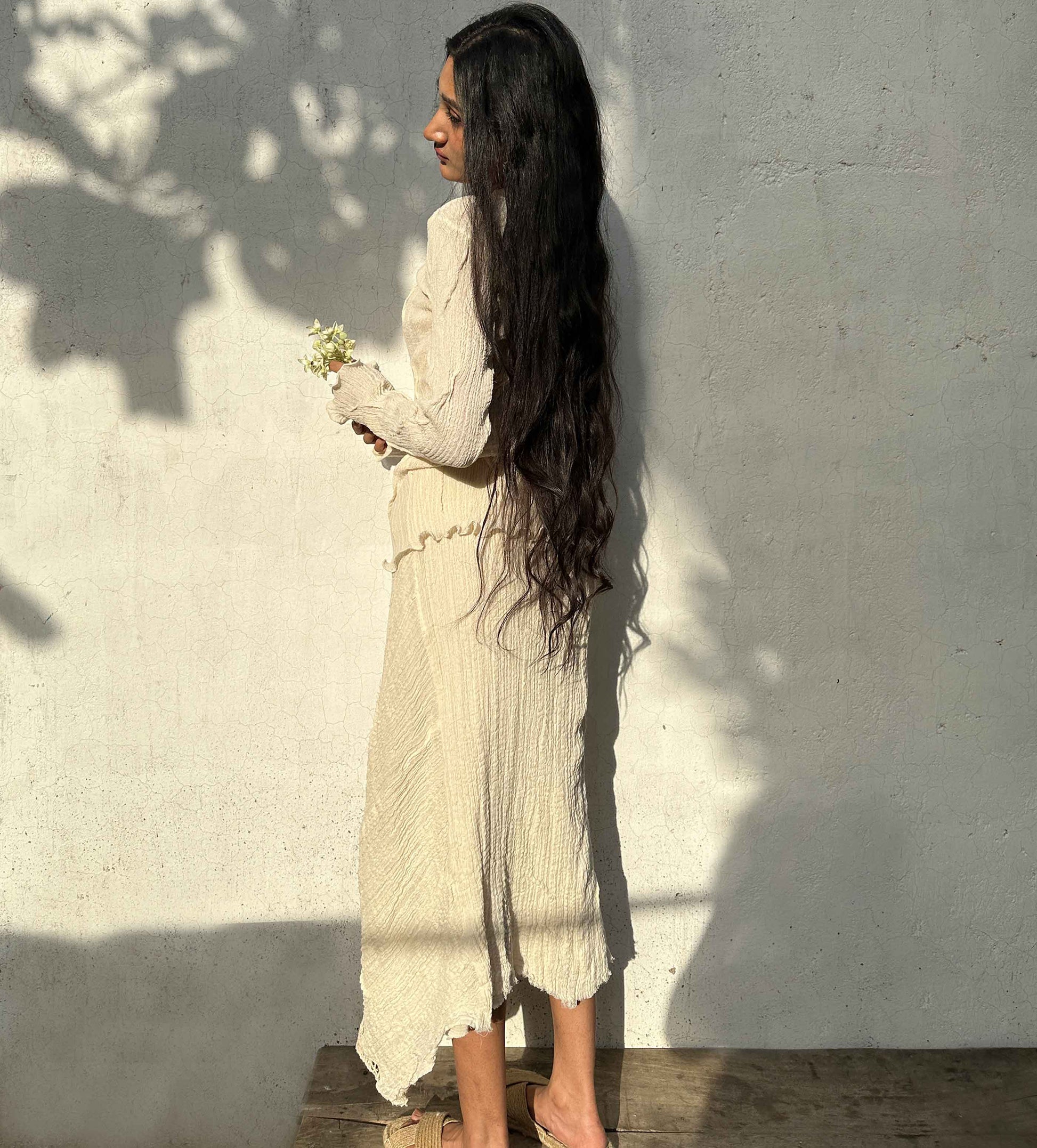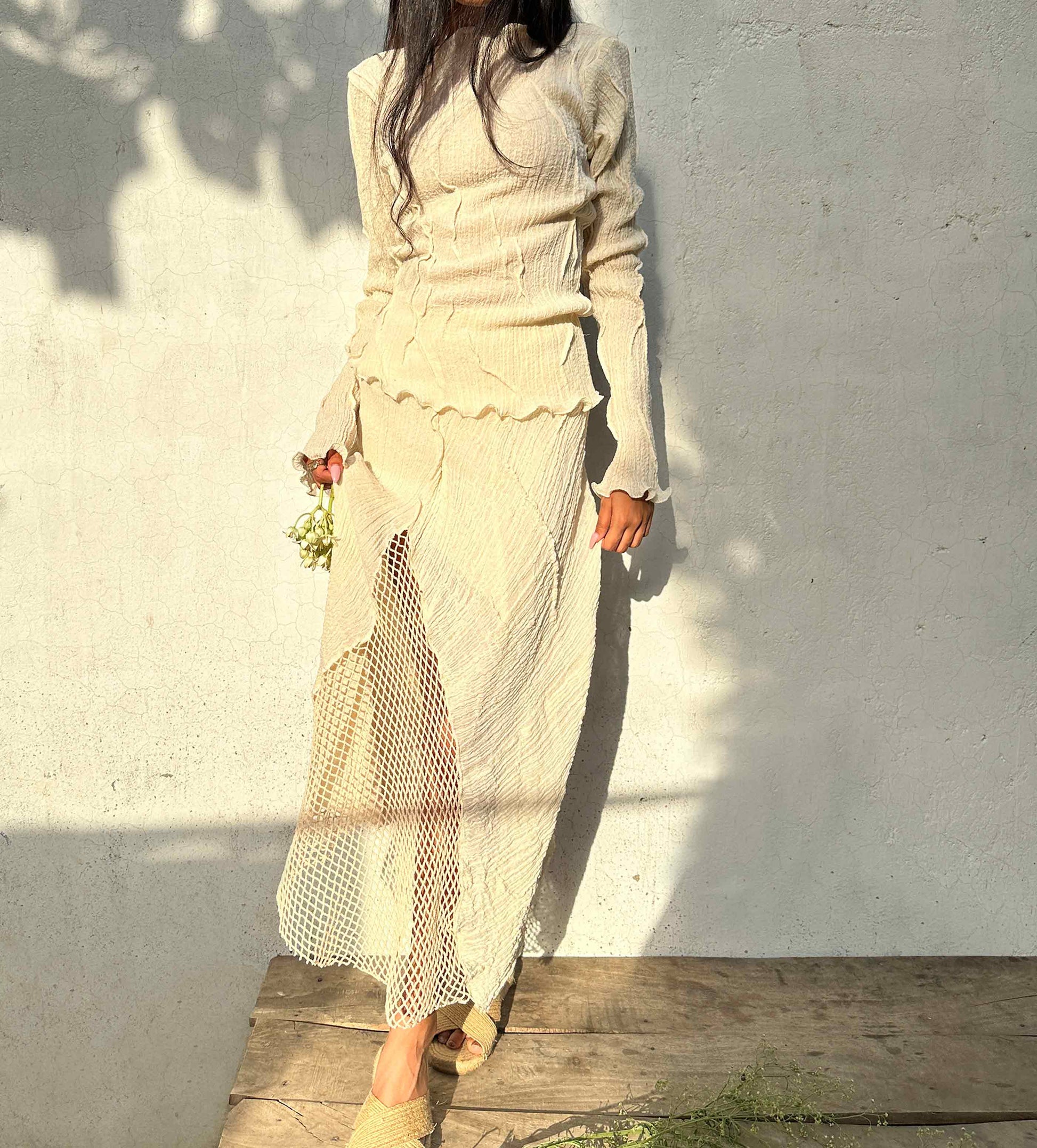 Snug skirt, that gently wraps itself around the body. Its textured form and fall, add beauty to this timeless piece.