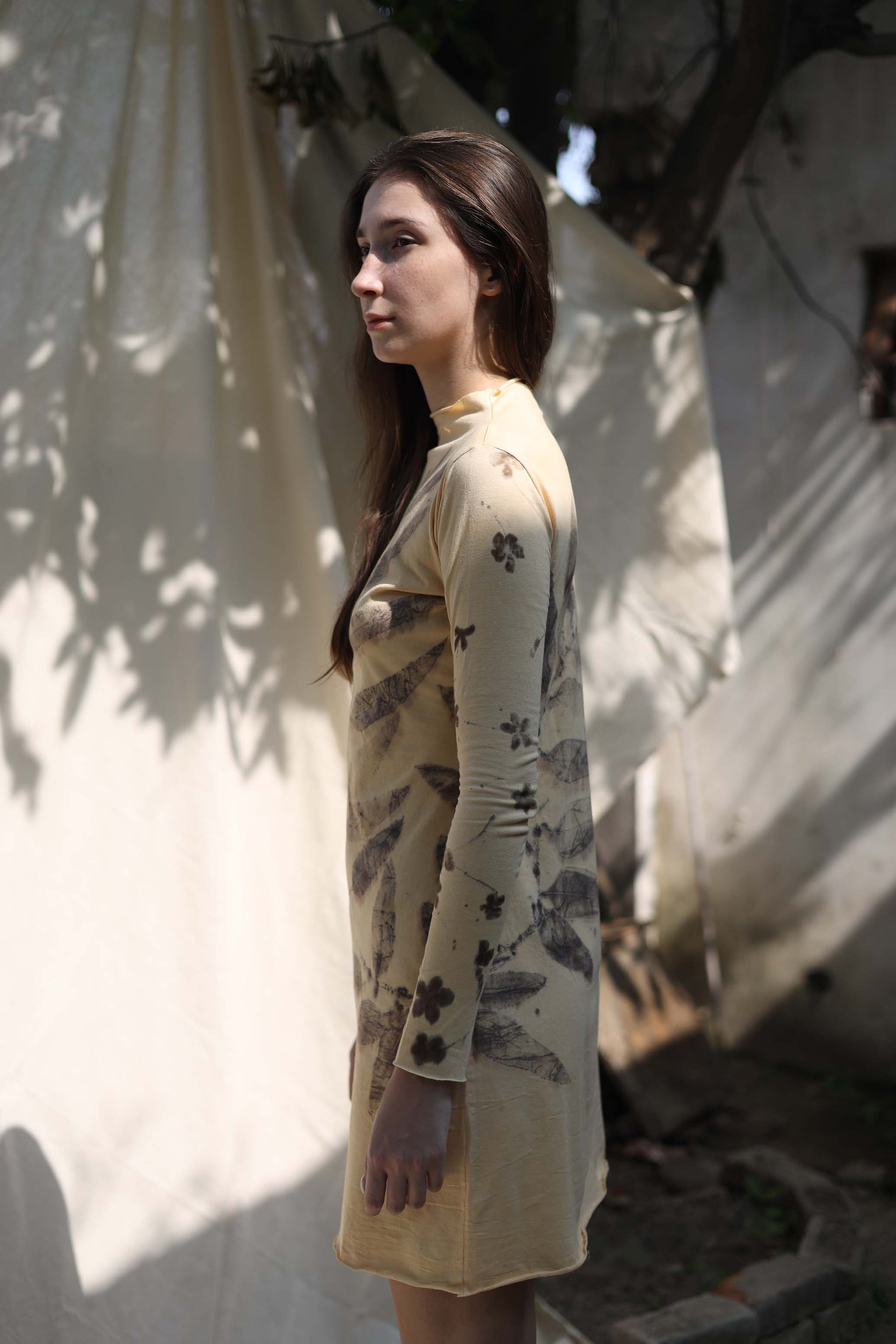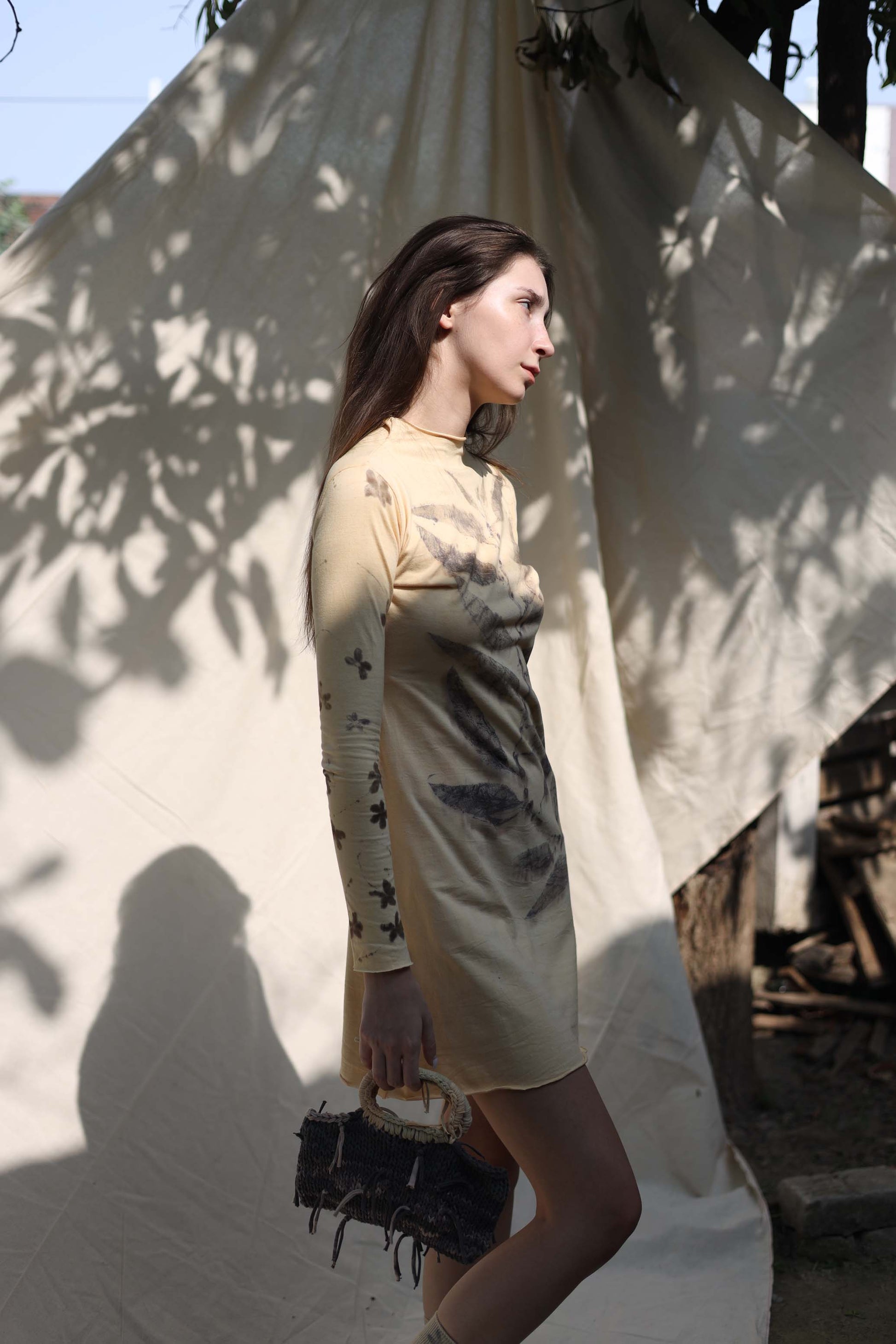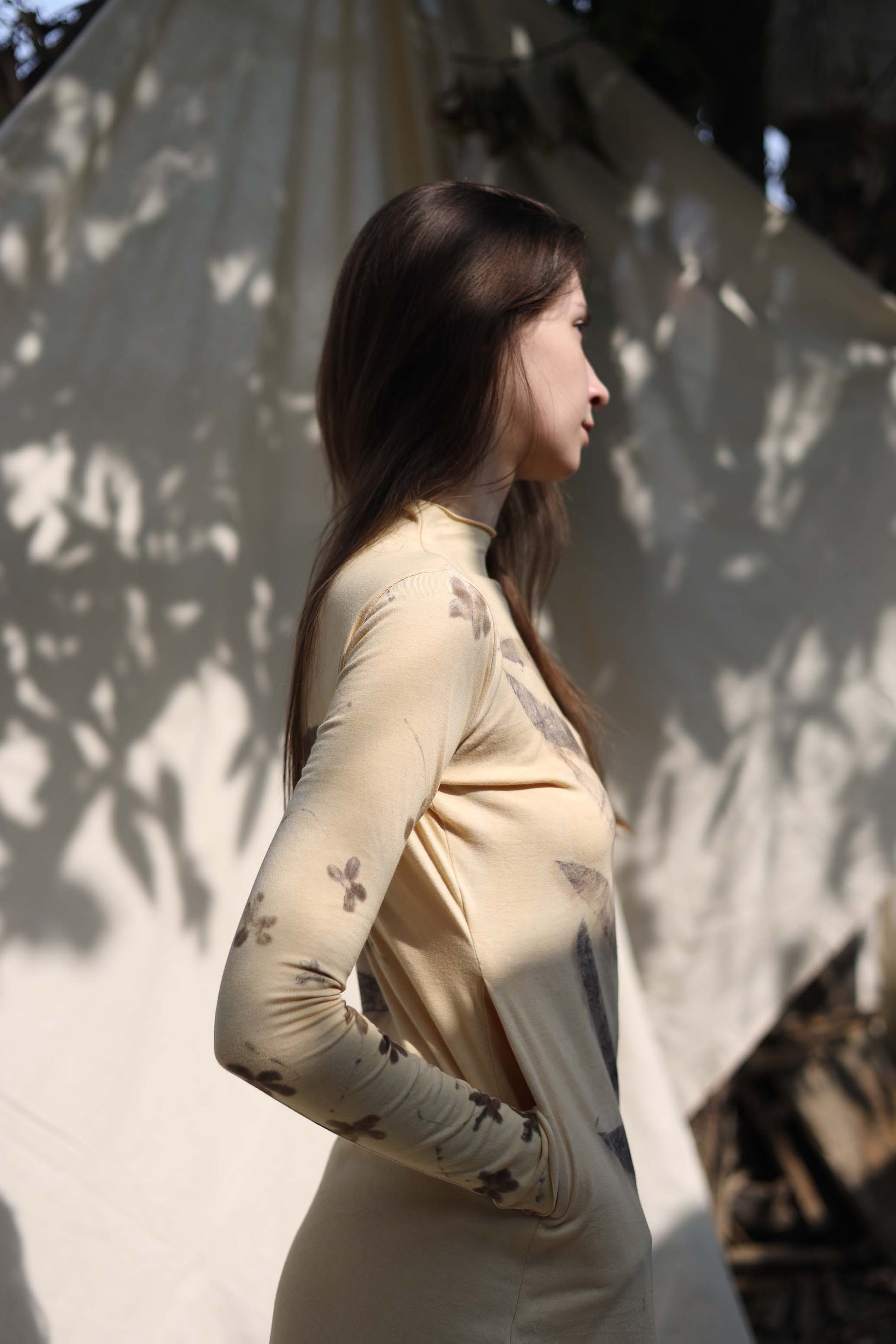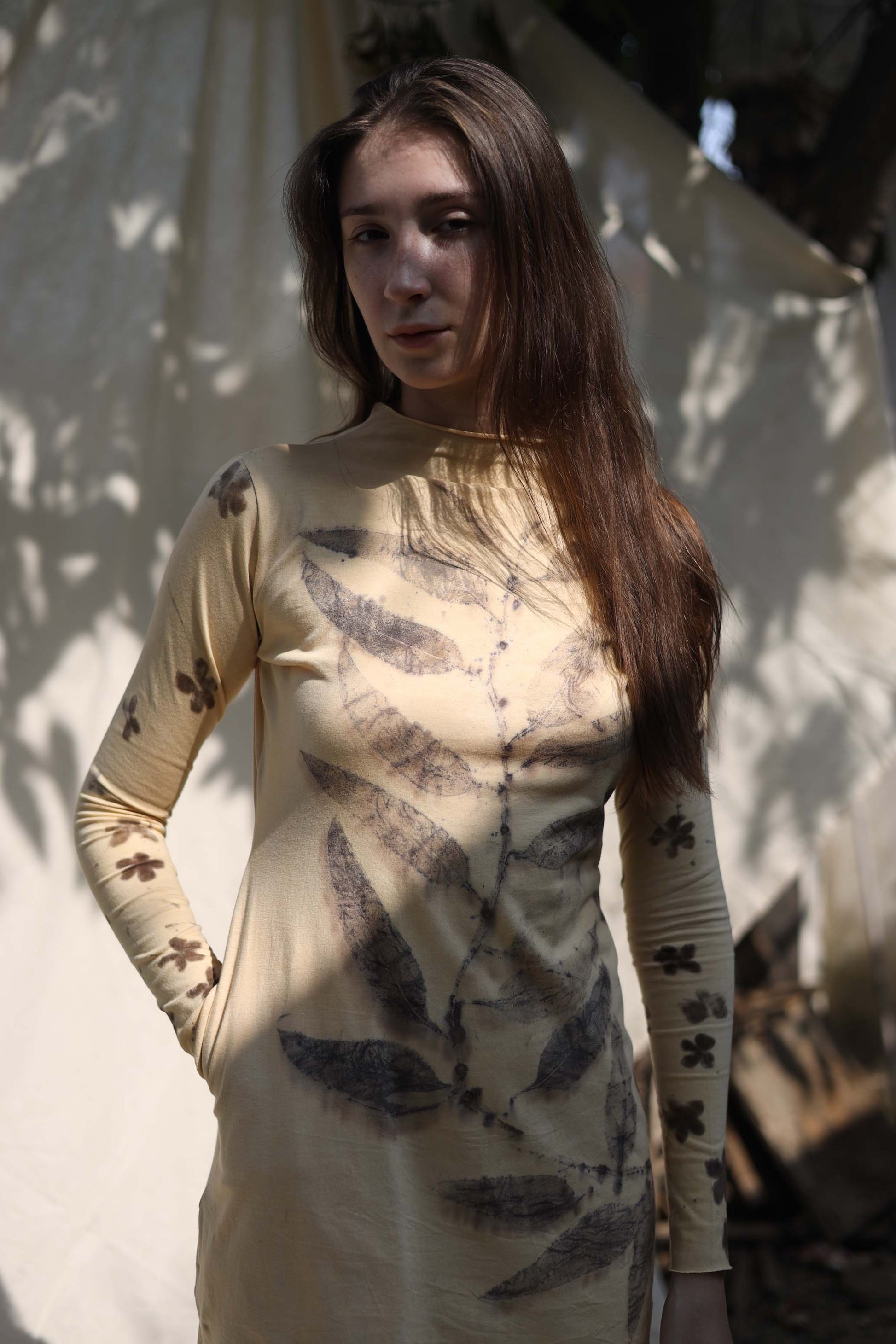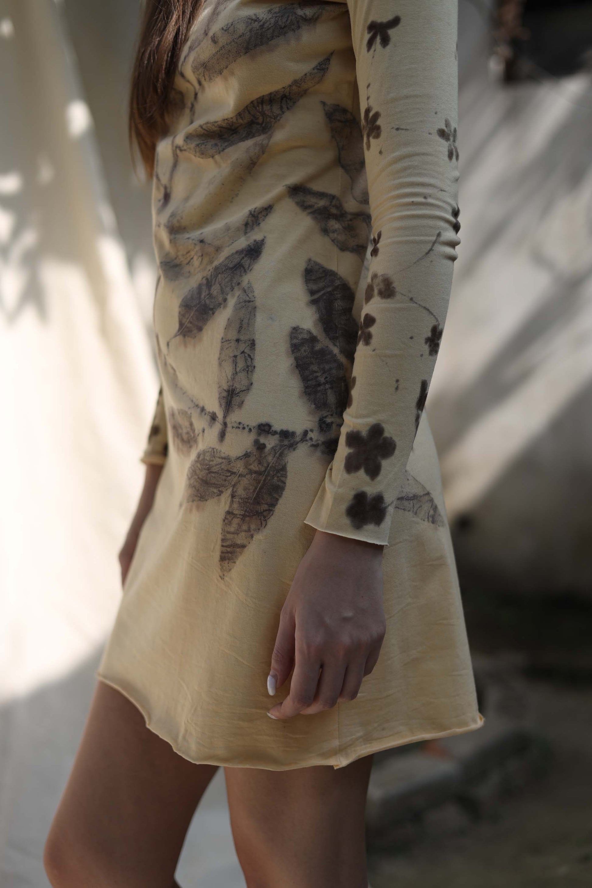 Each dress is individually printed, with real leaves and flowers. Each flower and leaf is handpicked and laid down for further botanical printing process, which takes several hours just to print one garment.