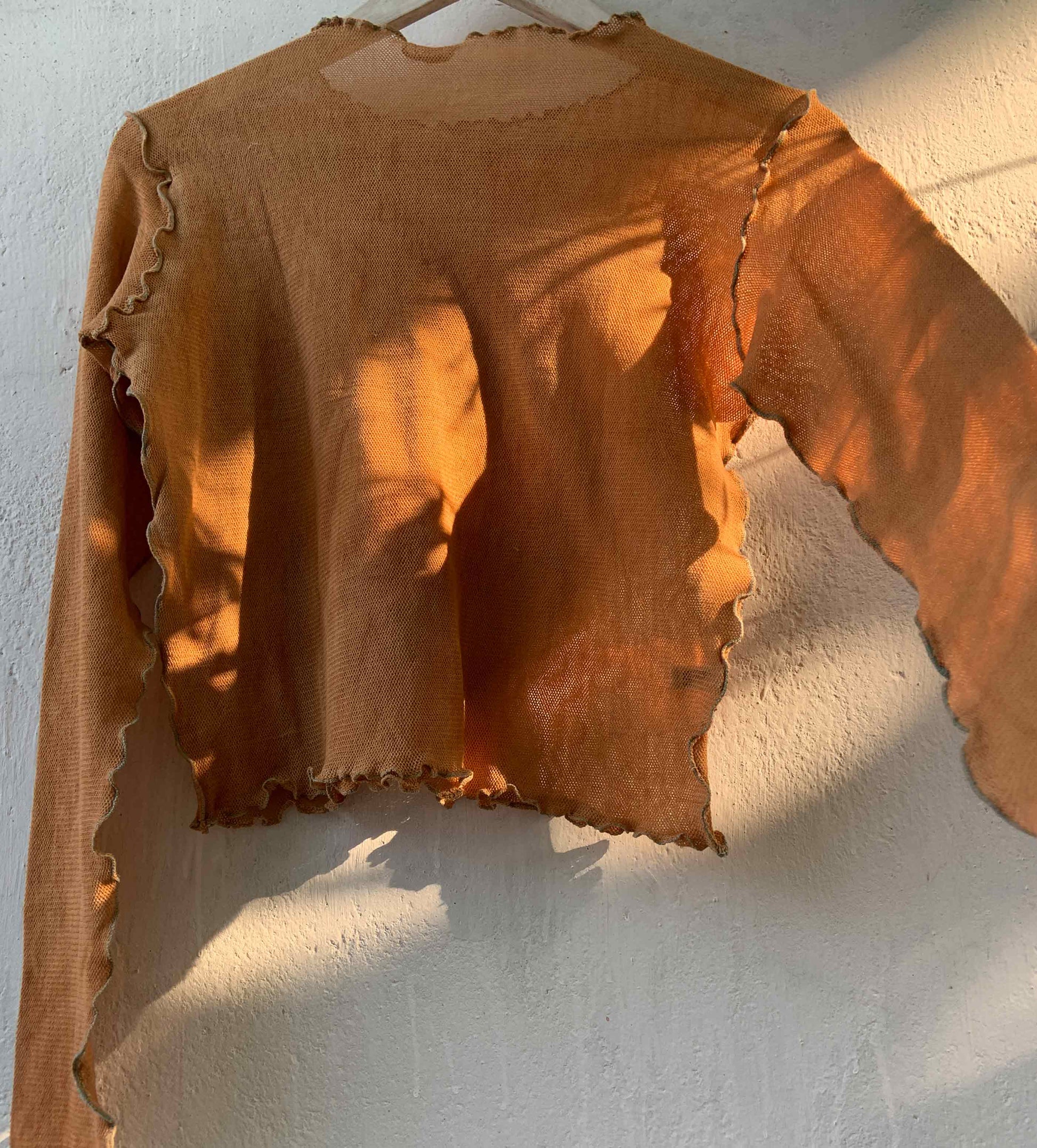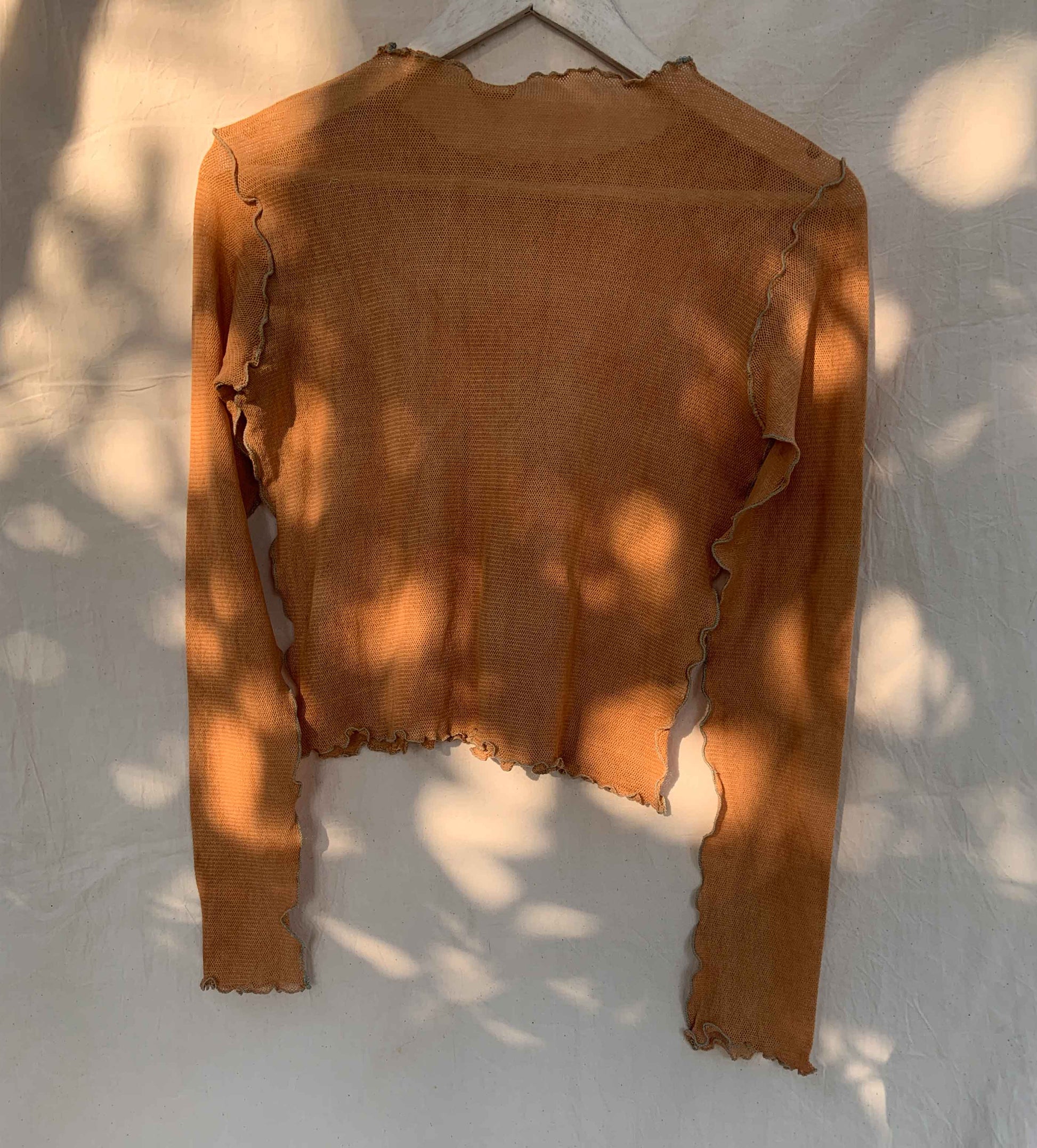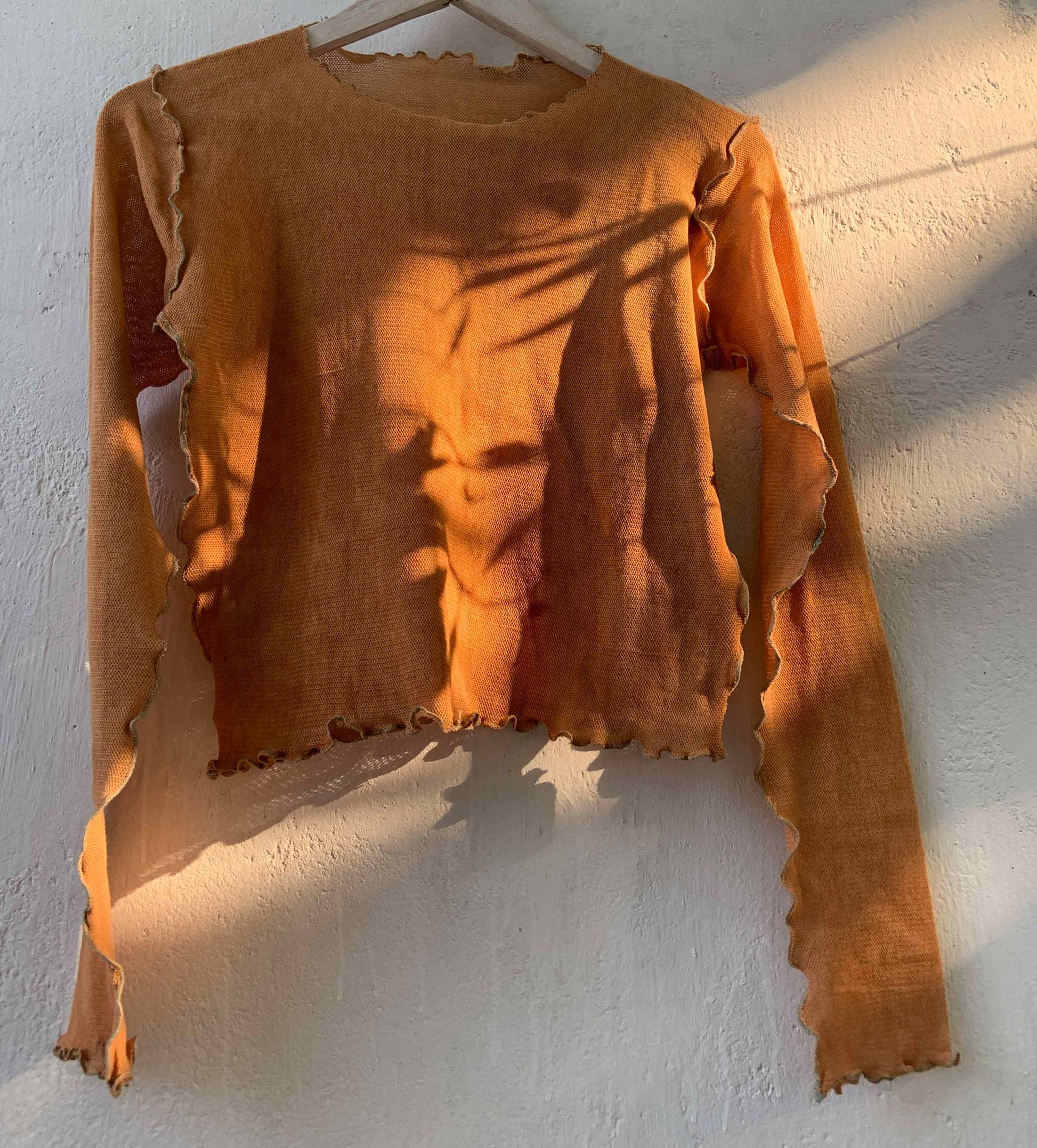 This top gets its beautiful color, from 'tesu' and catechu extract. Which varies from tangerine to sunken sunsets, the hues shift, making it more beautiful, with every wash.