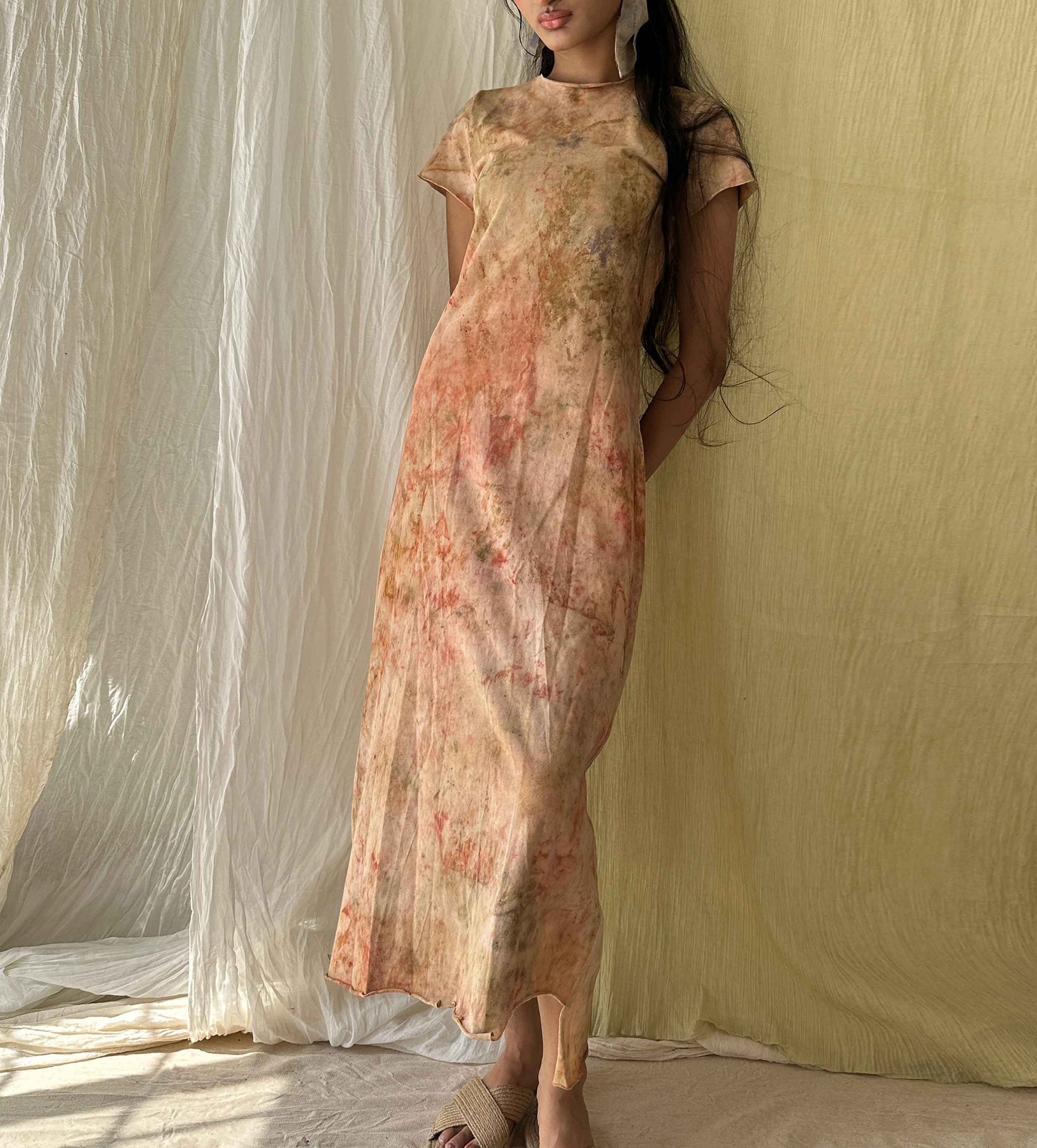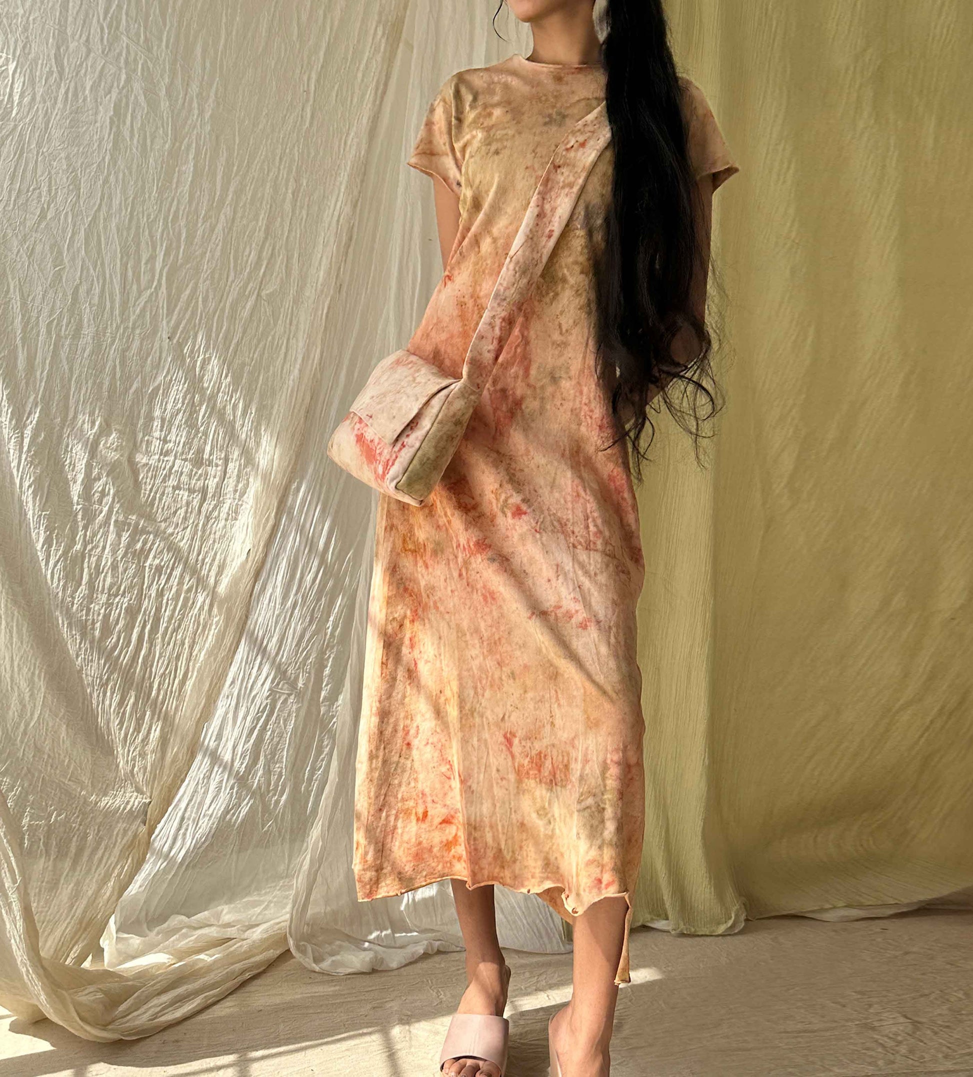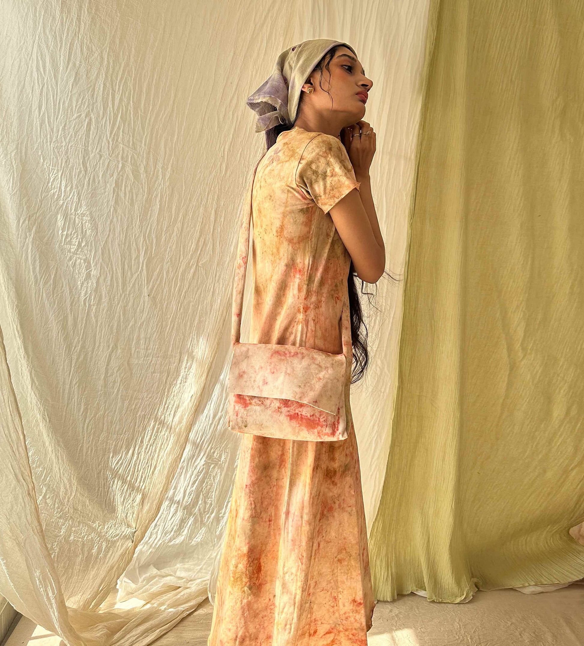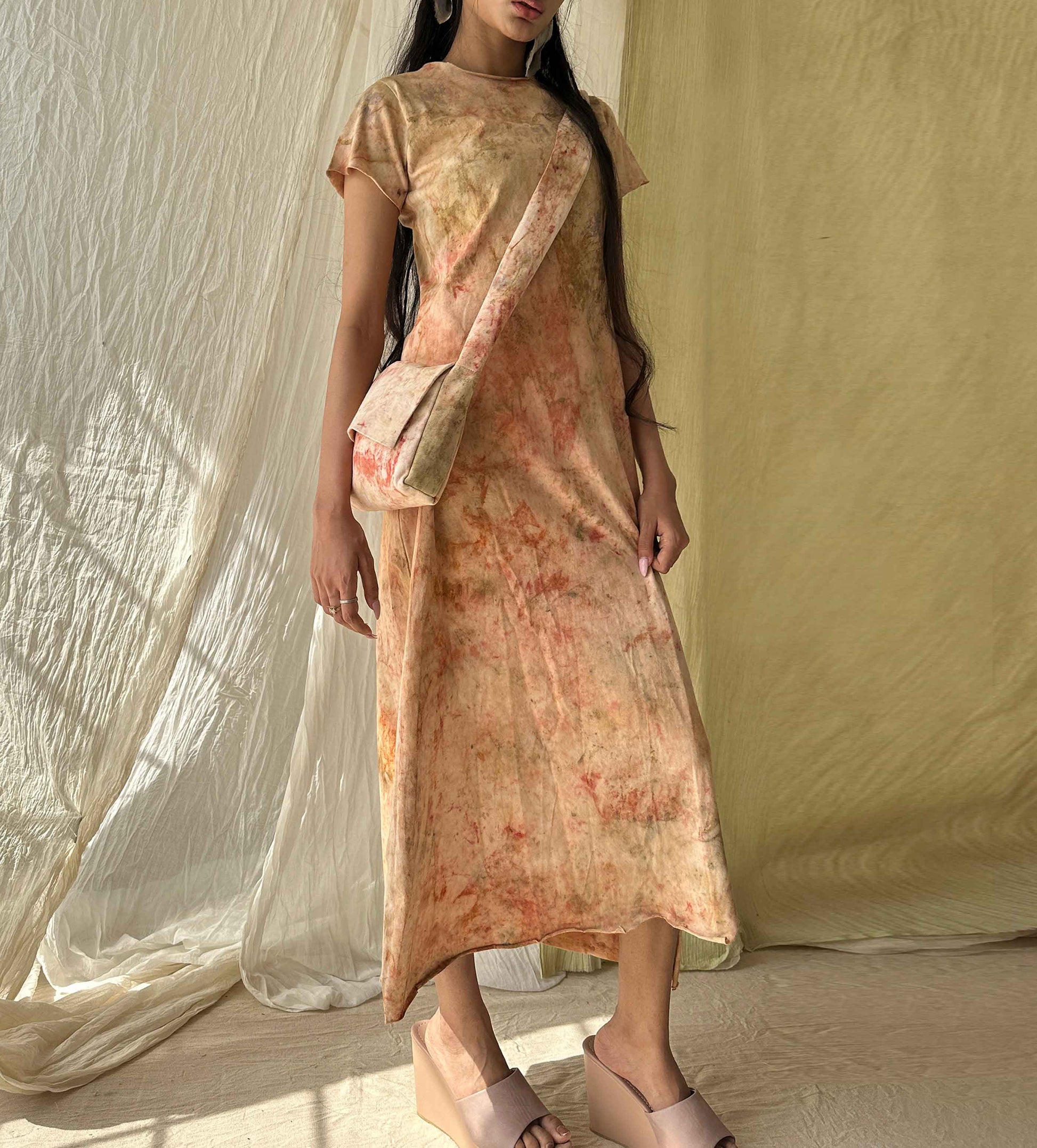 Textured with flowers, roots, and native leaf extracts, this dress is a motley of colors ~ be it the pink from maddar roots, the peach from tesu, or the green from hibiscus flowers and neem leaves. This dress carries the goodness of our homegrown natural colors and is easy on the skin and stretches to accommodate movement and comfort.