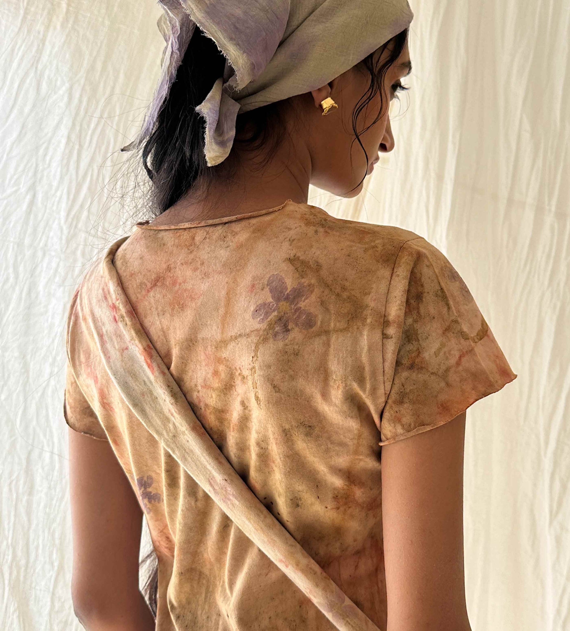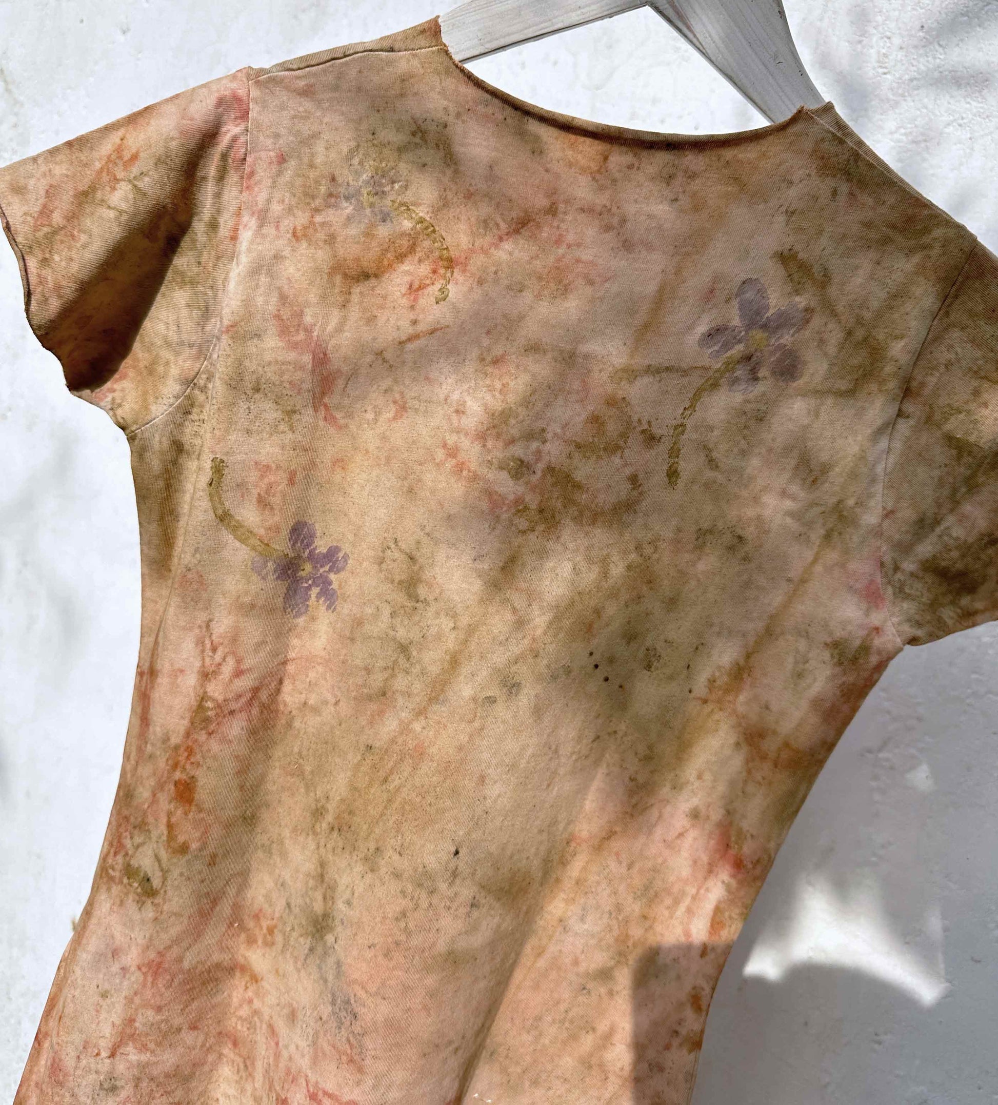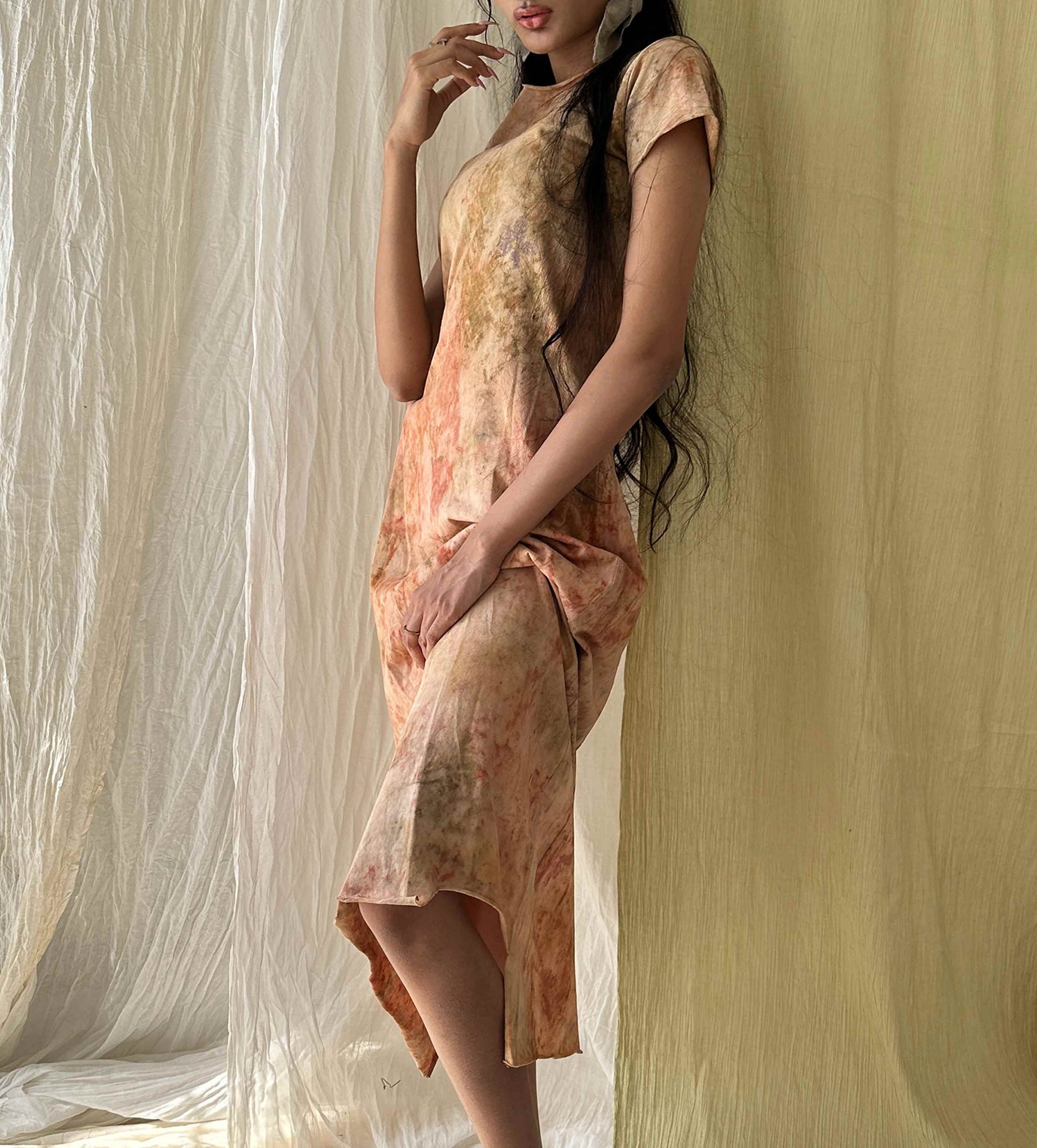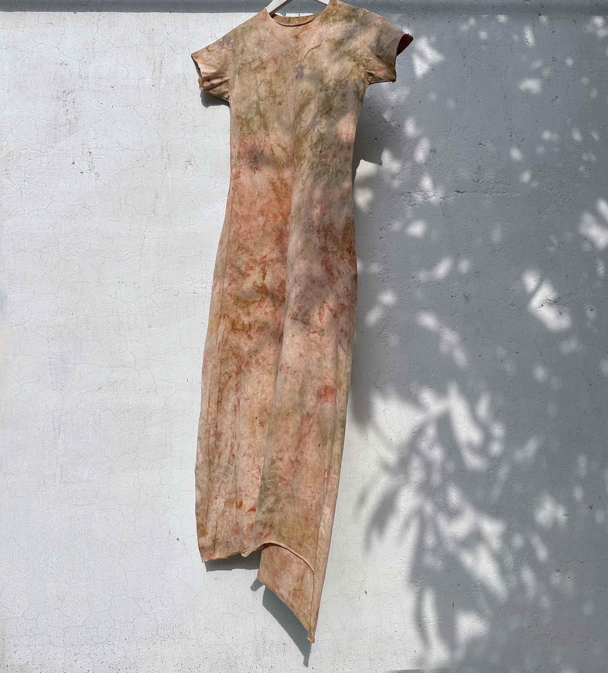 Textured with flowers, roots, and native leaf extracts, this dress is a motley of colors ~ be it the pink from maddar roots, the peach from tesu, or the green from hibiscus flowers and neem leaves. This dress carries the goodness of our homegrown natural colors and is easy on the skin and stretches to accommodate movement and comfort.