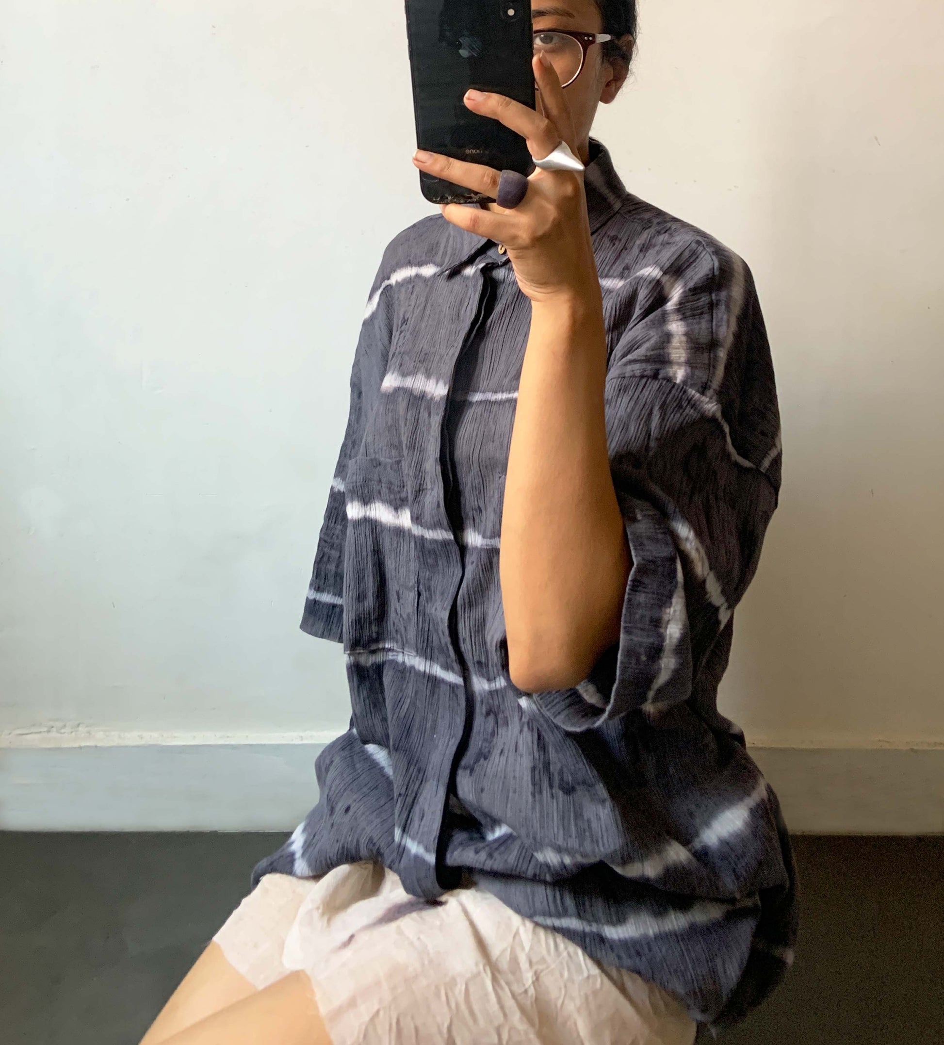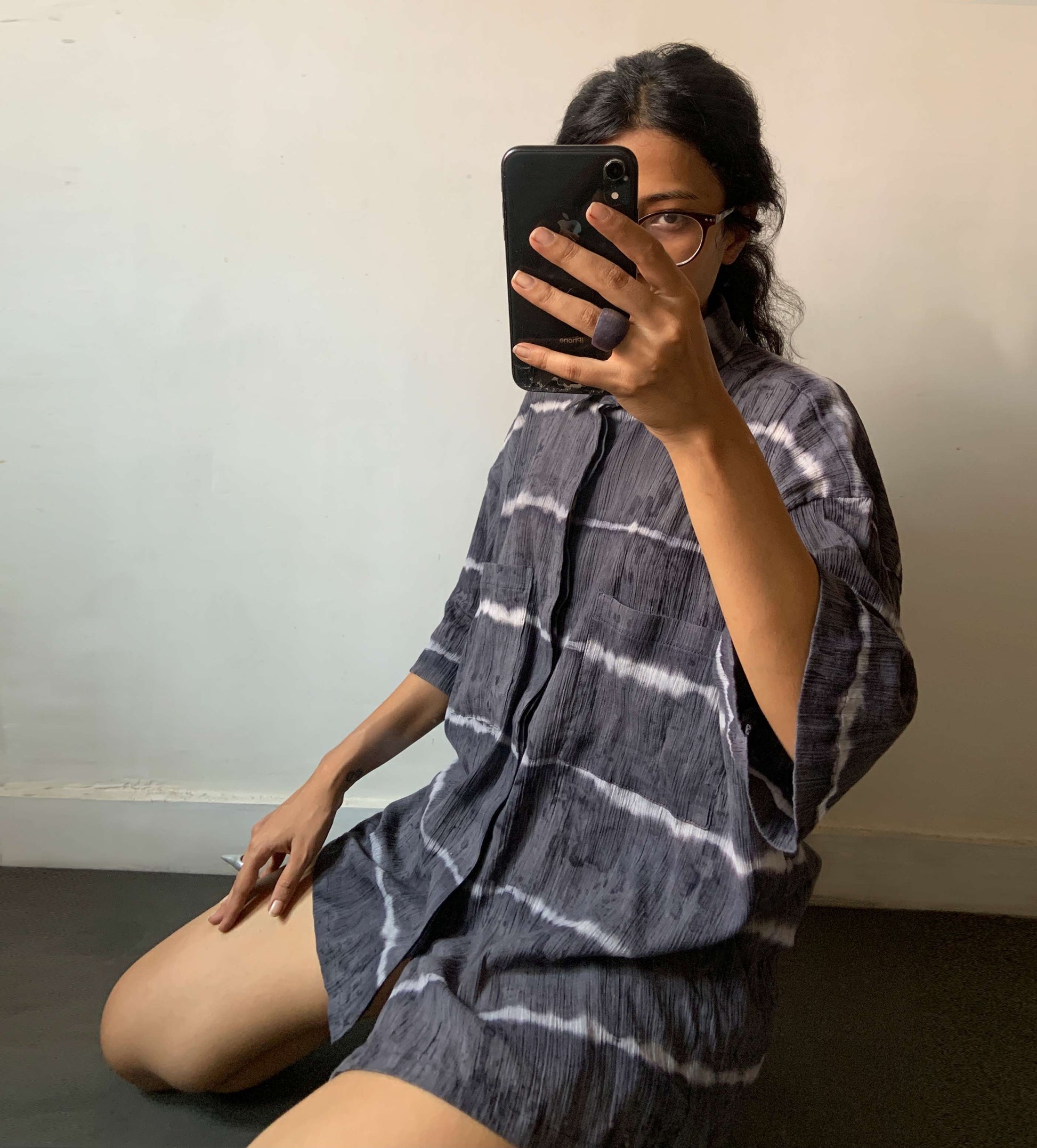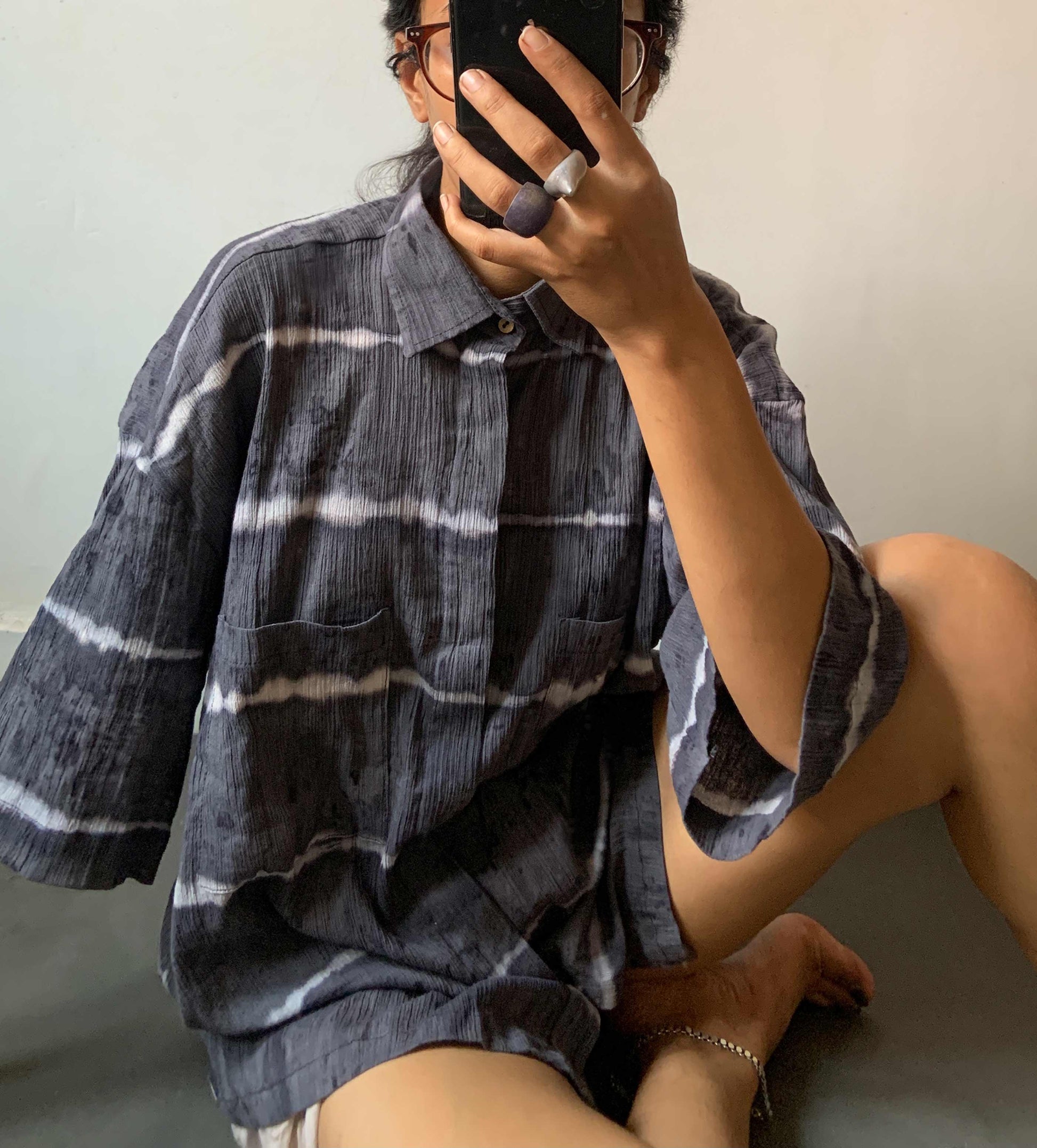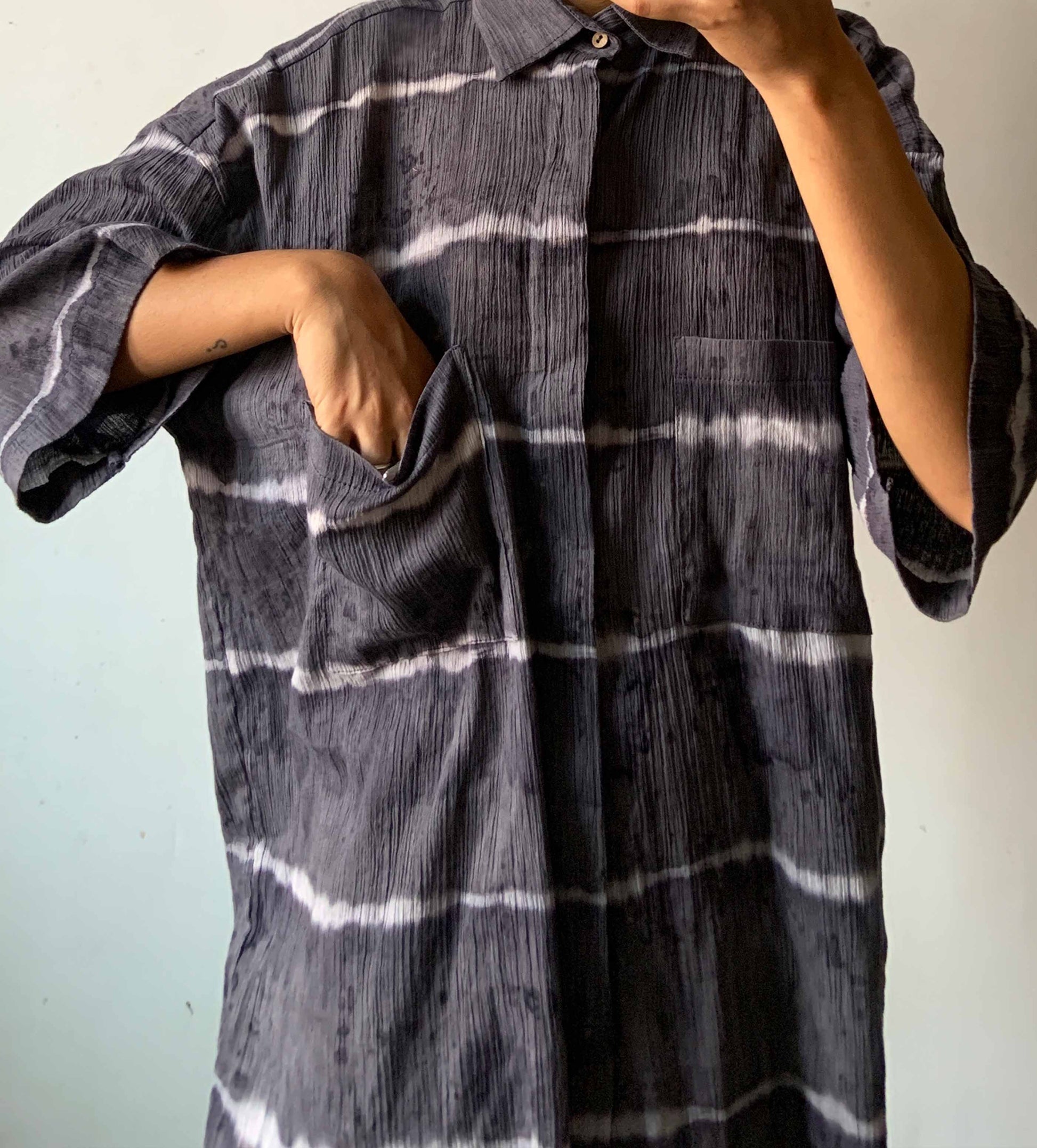 A comfy unisex shirt, dyed using locally found plants by the women in village Raghurampur. The lines created are tied by hand and then dyed individually giving a unique character to each piece.