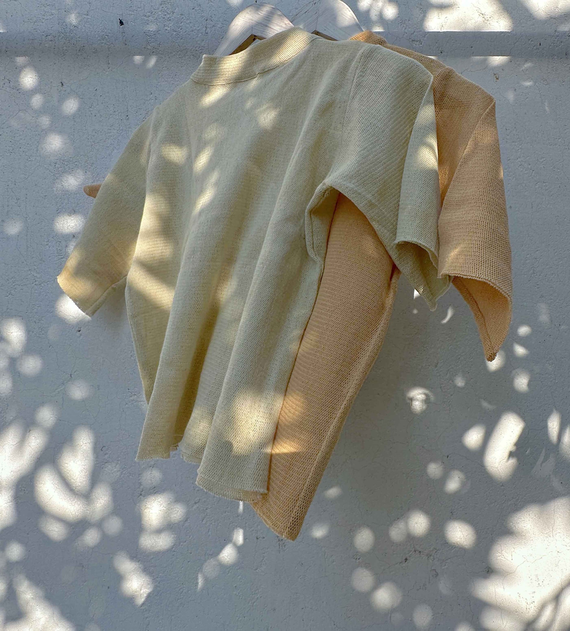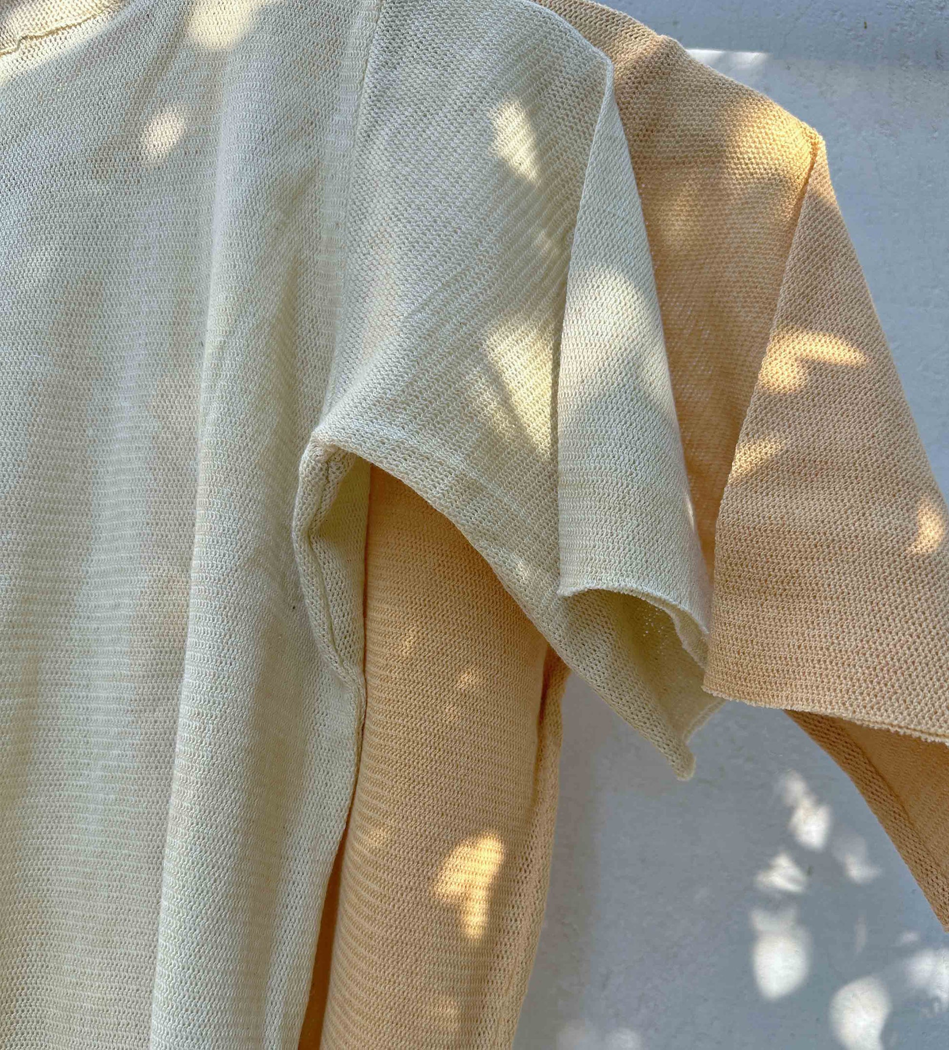 Minimal and comfortable cropped T-shirt, colored using Neem leaves. It comes in a relaxed shape and is made in lightweight cotton mesh with tiny pores, which add maximum ease. The goodness of neem, adds medicinal and healing properties to the garment, along with a lingering bittersweet smell.