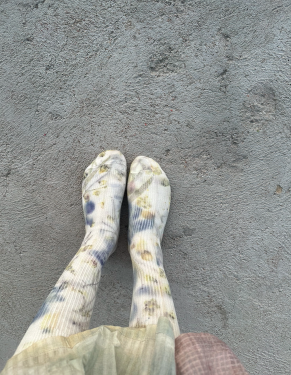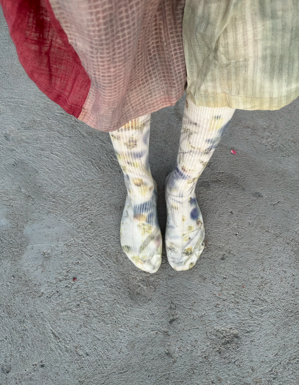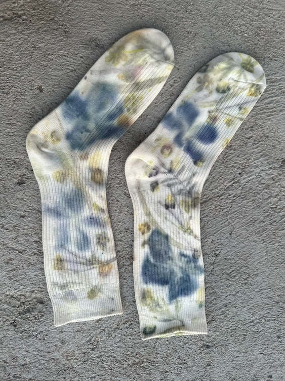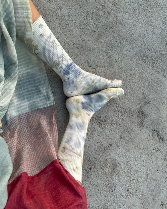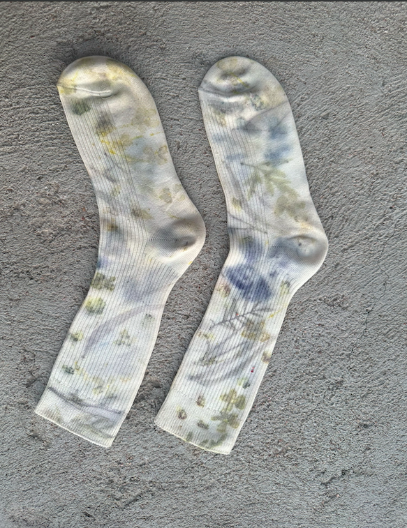 These botanical-printed socks get their color from foraged leaves found in our garden.