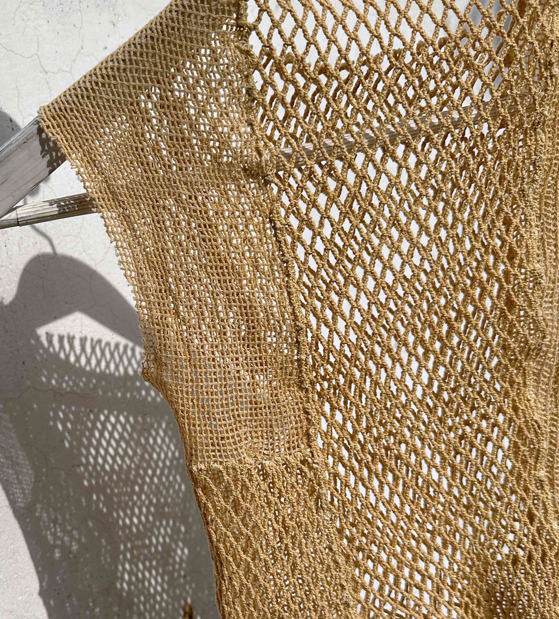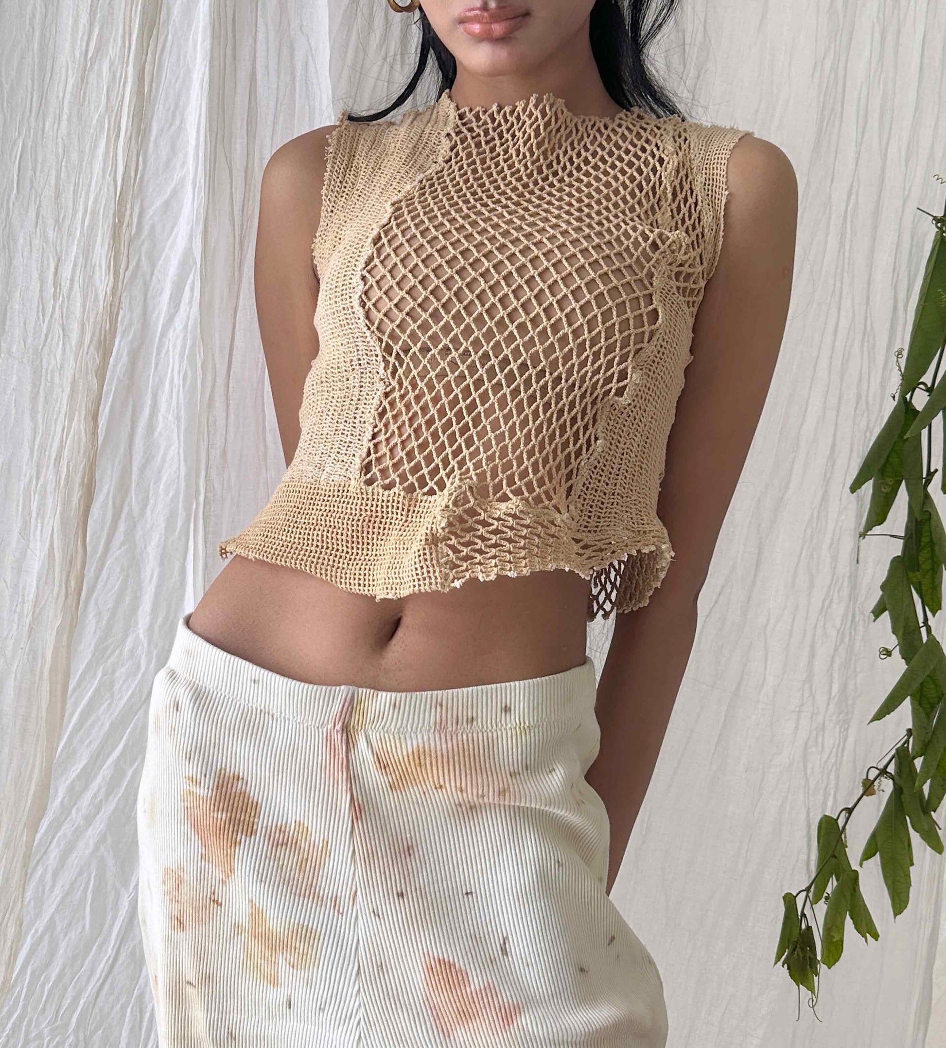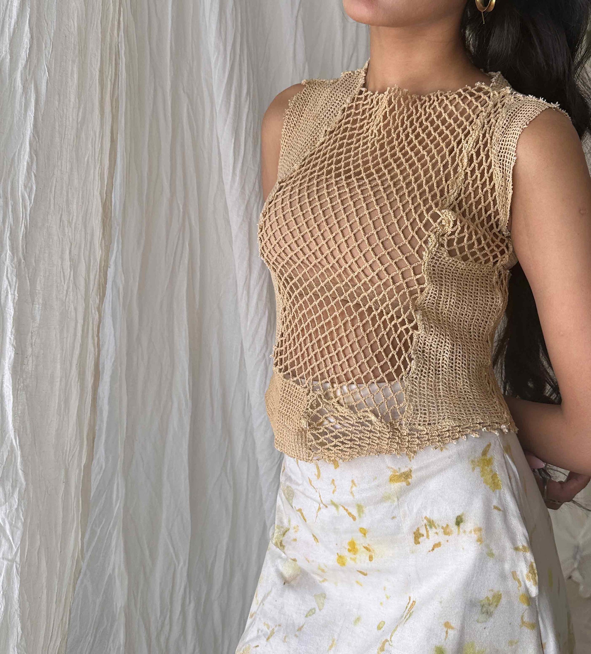 A sheer short summer top that gently hugs the body. Its interesting mesh details play hide and seek with skin. Hand-dyed using Himalayan rhubarb roots.
