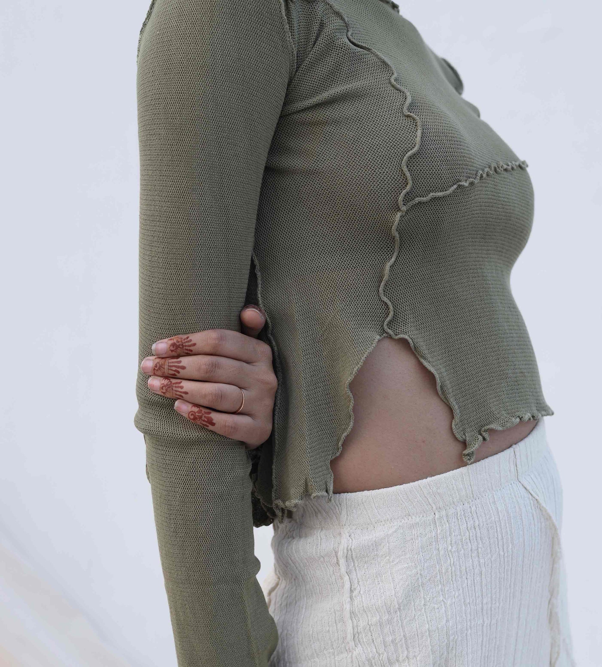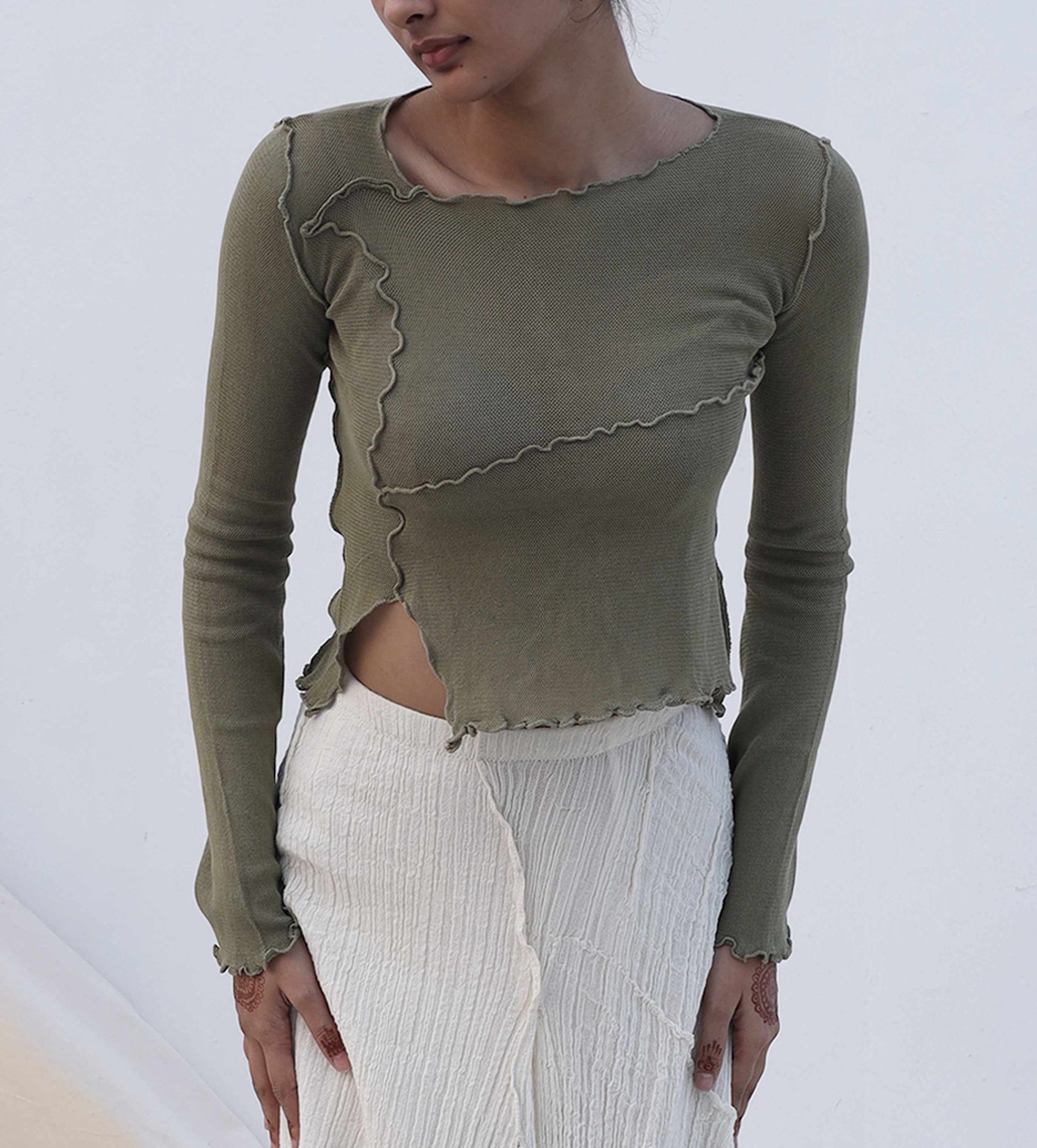 A rusty green blouse that gently hugs the body. Its made in 100% cotton knit with tiny pores that breathe easy.