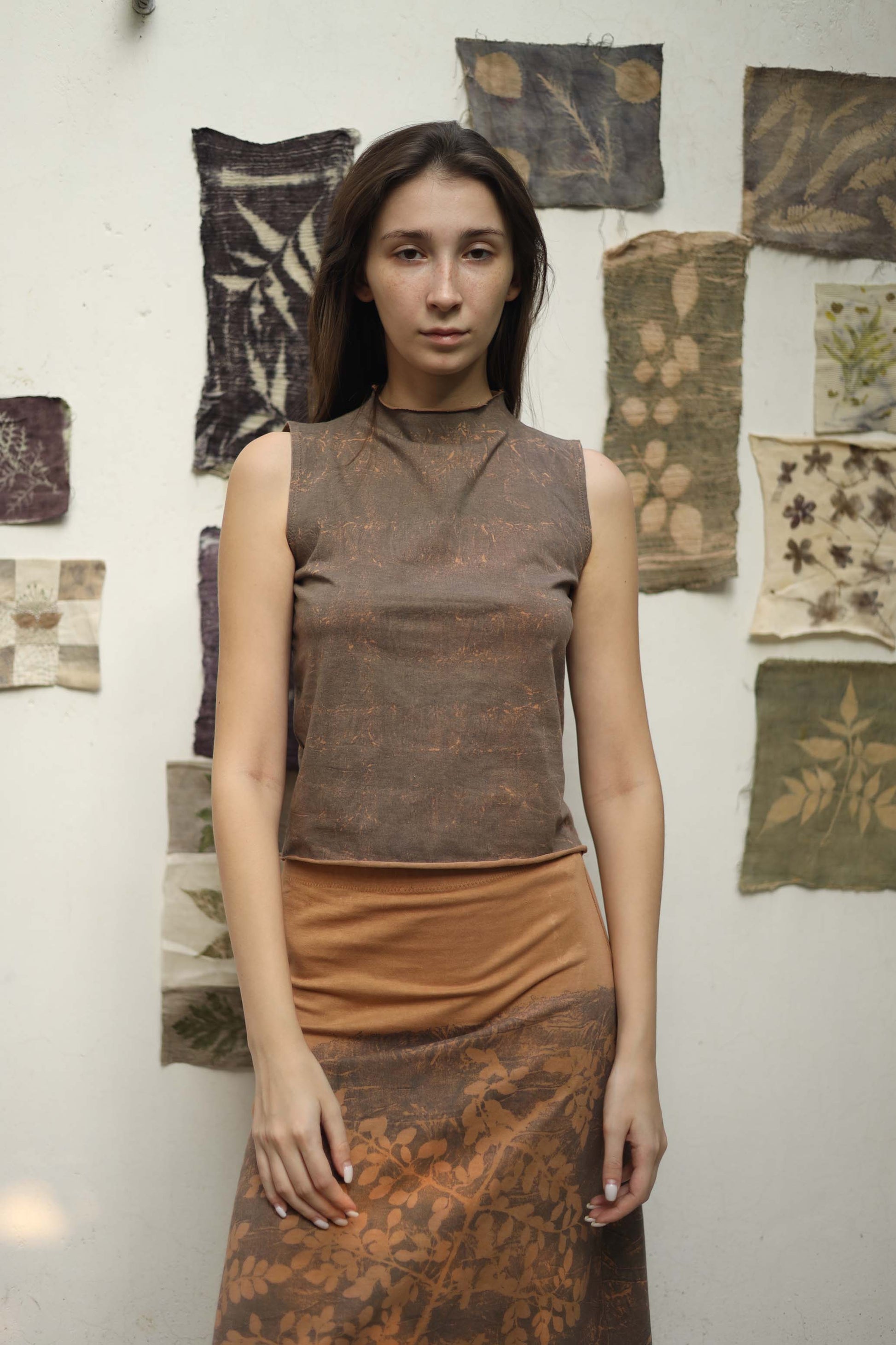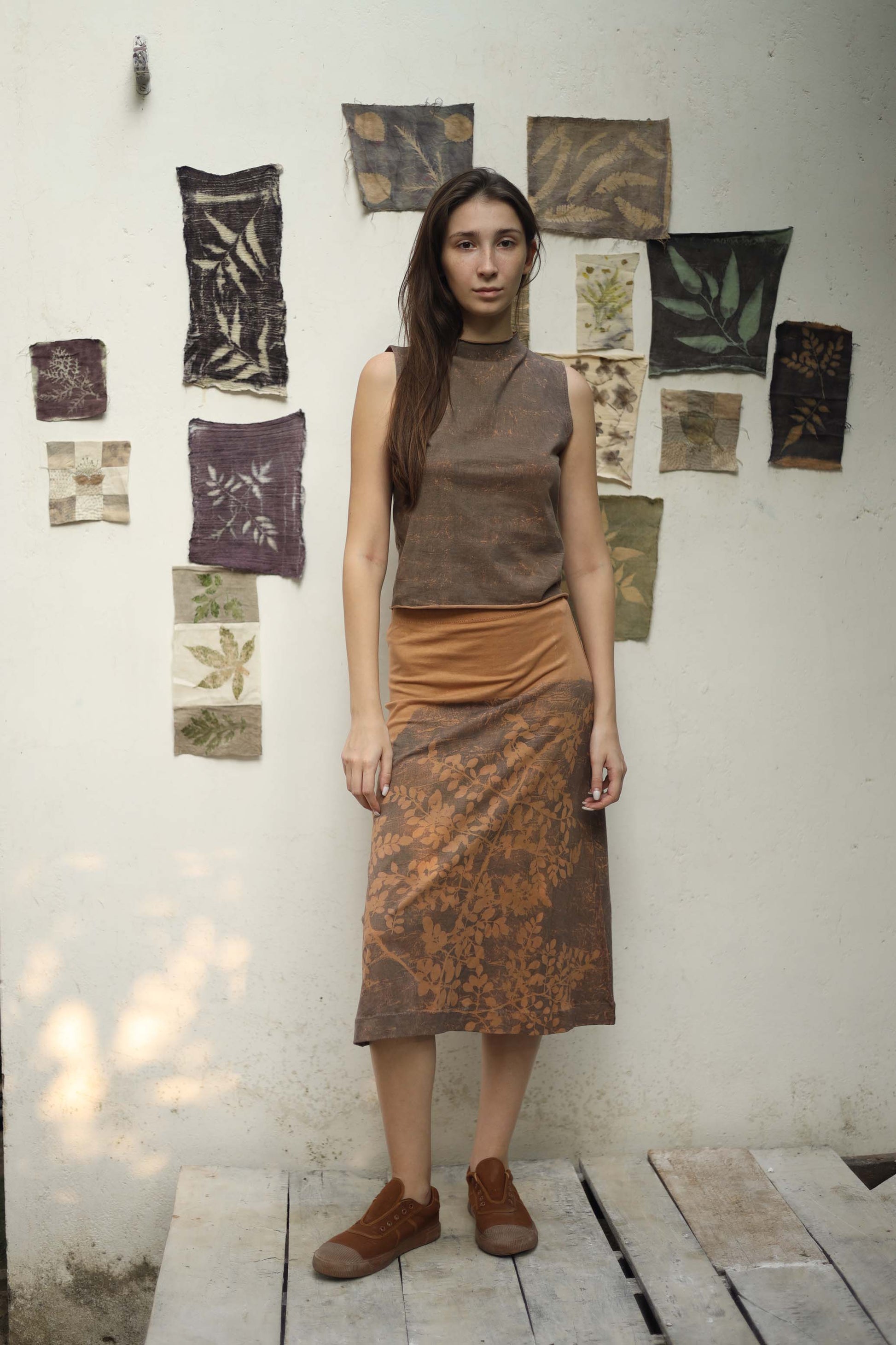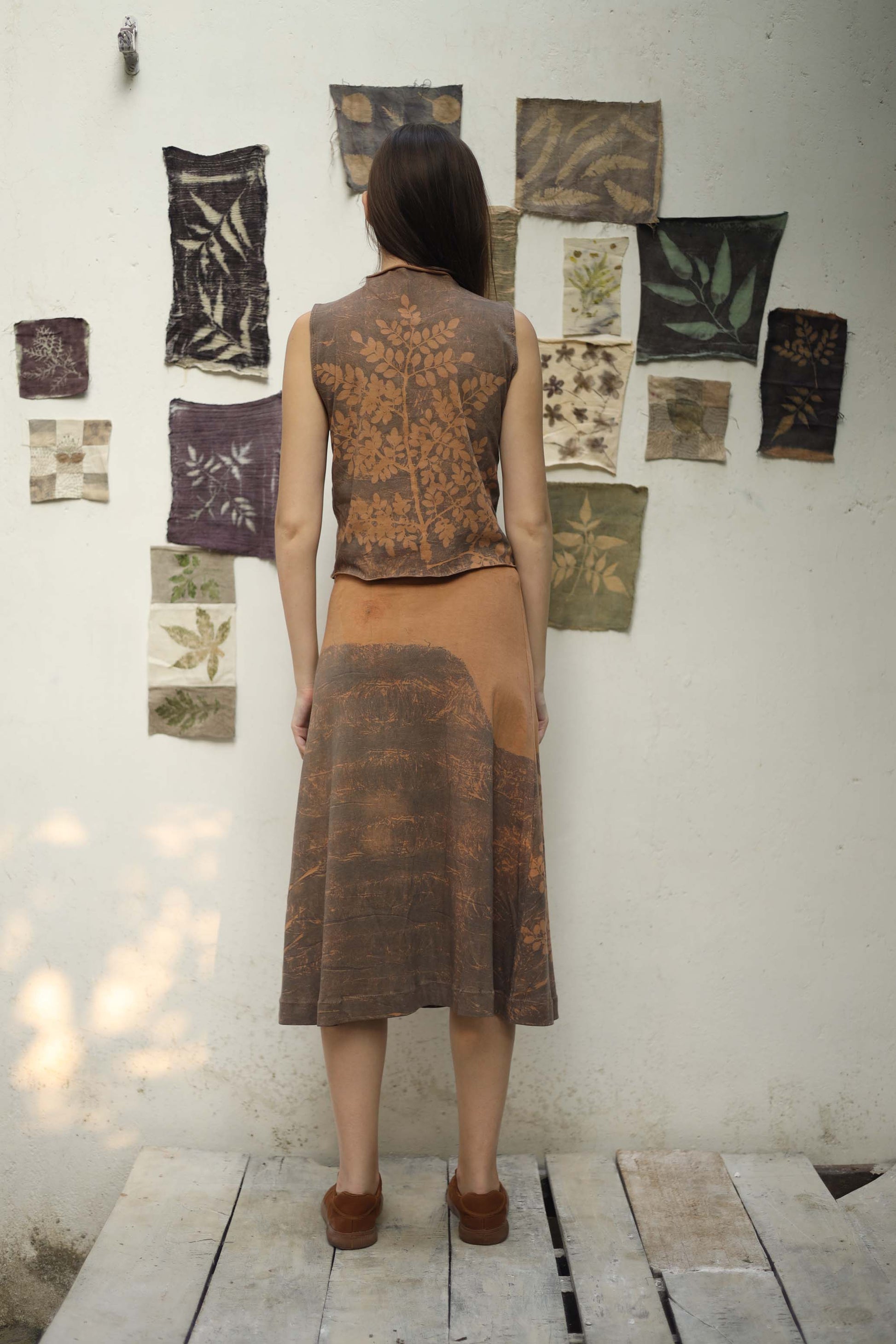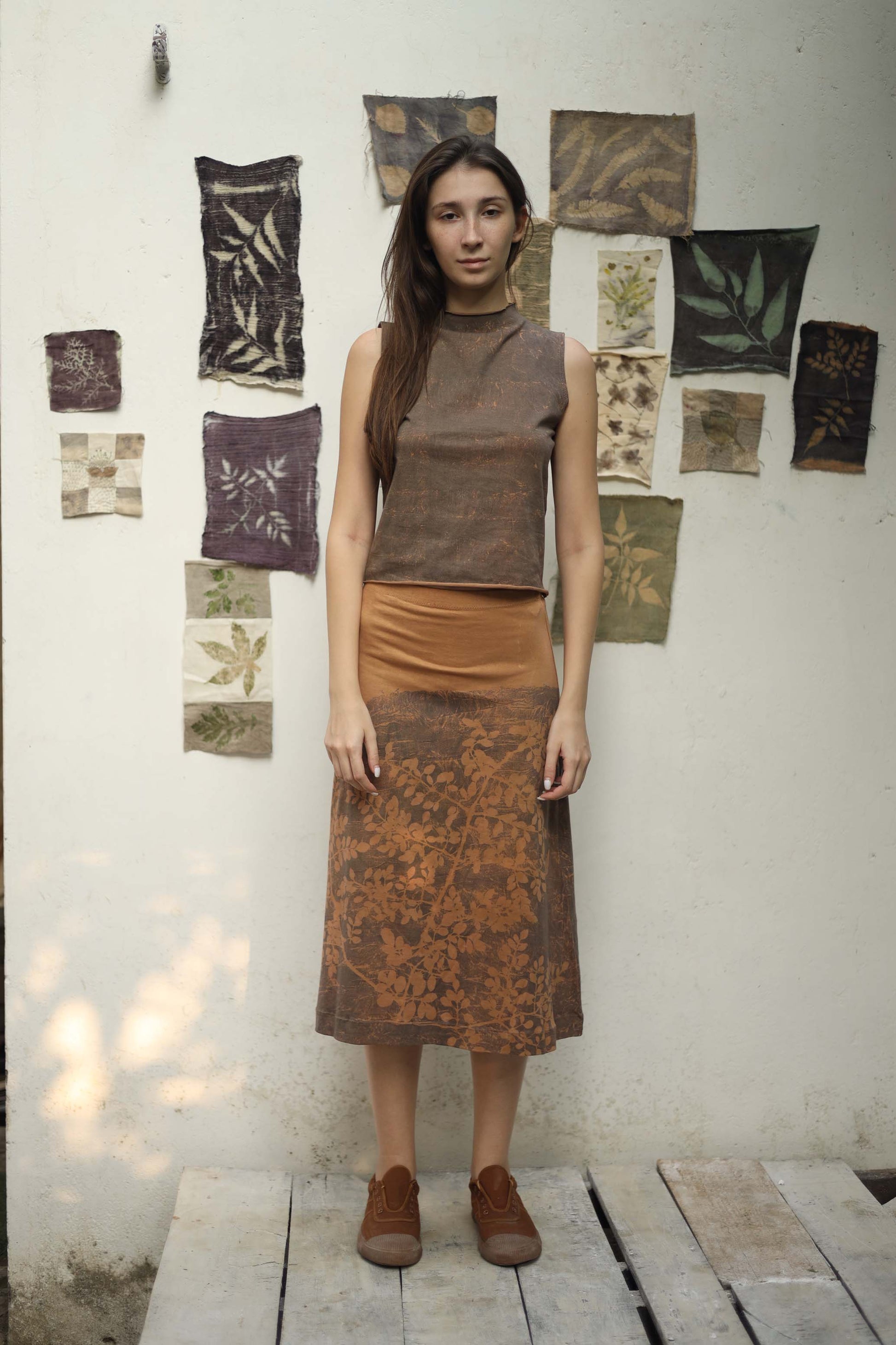 A unique set of a skirt and top, which stretch for added ease and movement. A beautiful imprint of the native Moringa oleifera, marks its rare beauty.