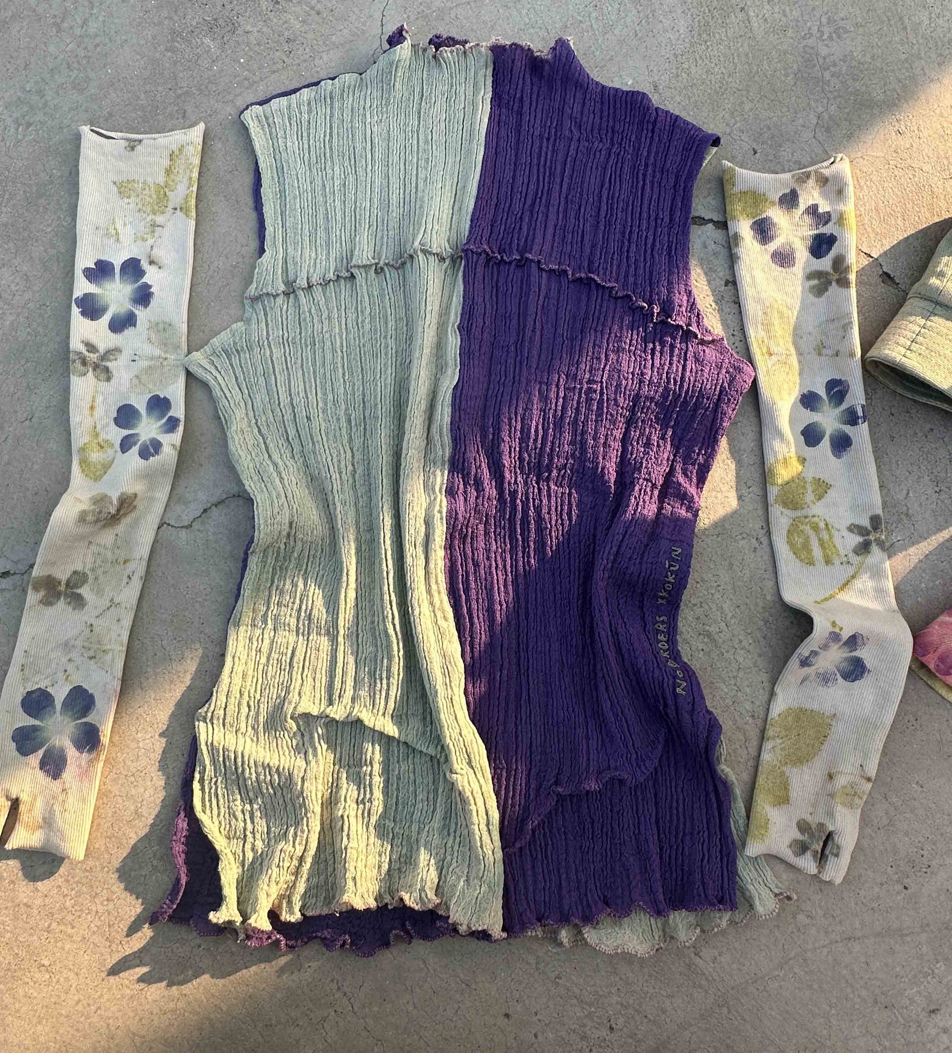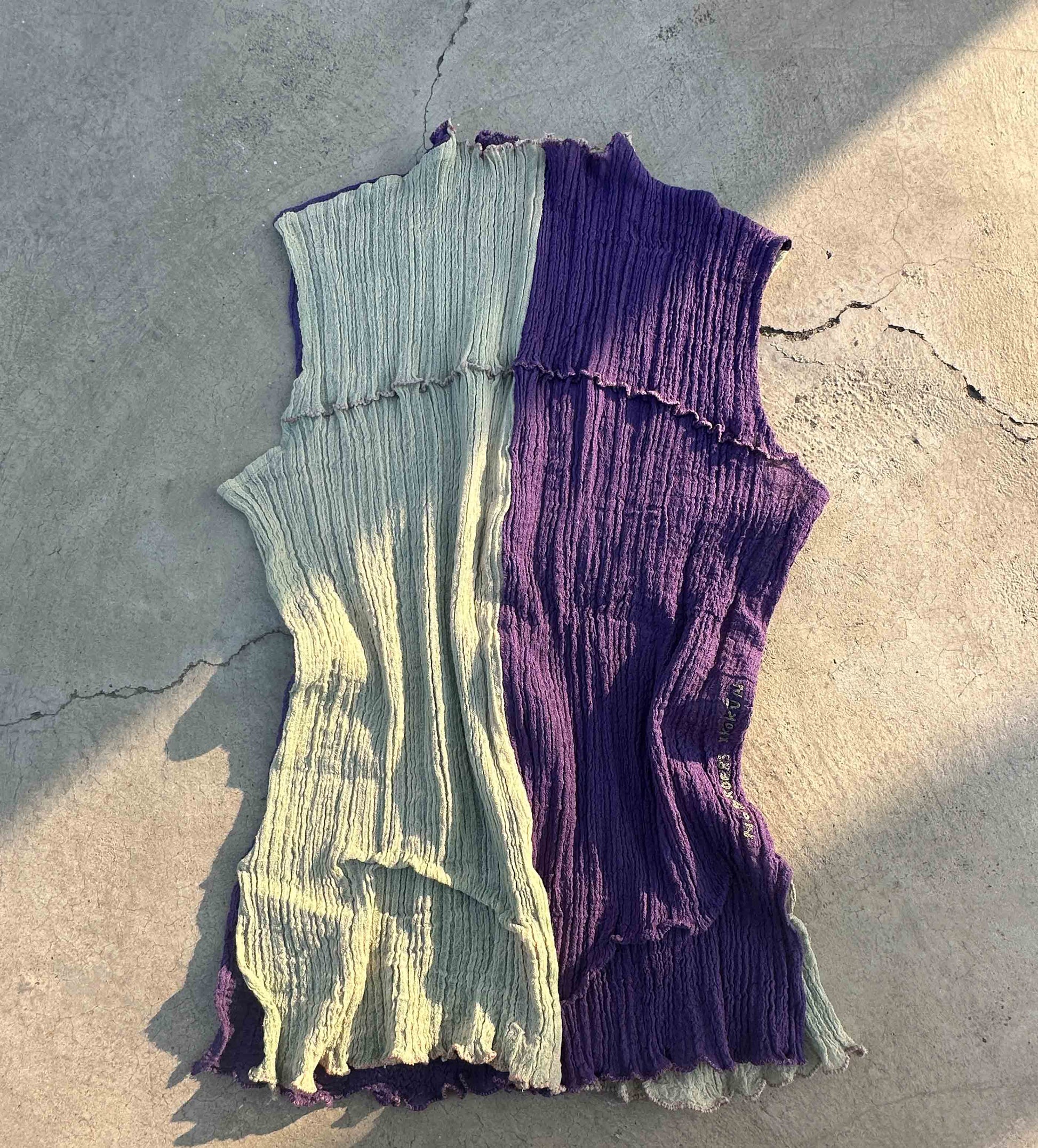 A handmade blouse, with a wrinkly texture. Its soft fabric gently hugs the body and takes shape for easy movement. It gets its luscious purple hue from natural extracts of Sappanwood and dull green from fresh leaves of Indigo.