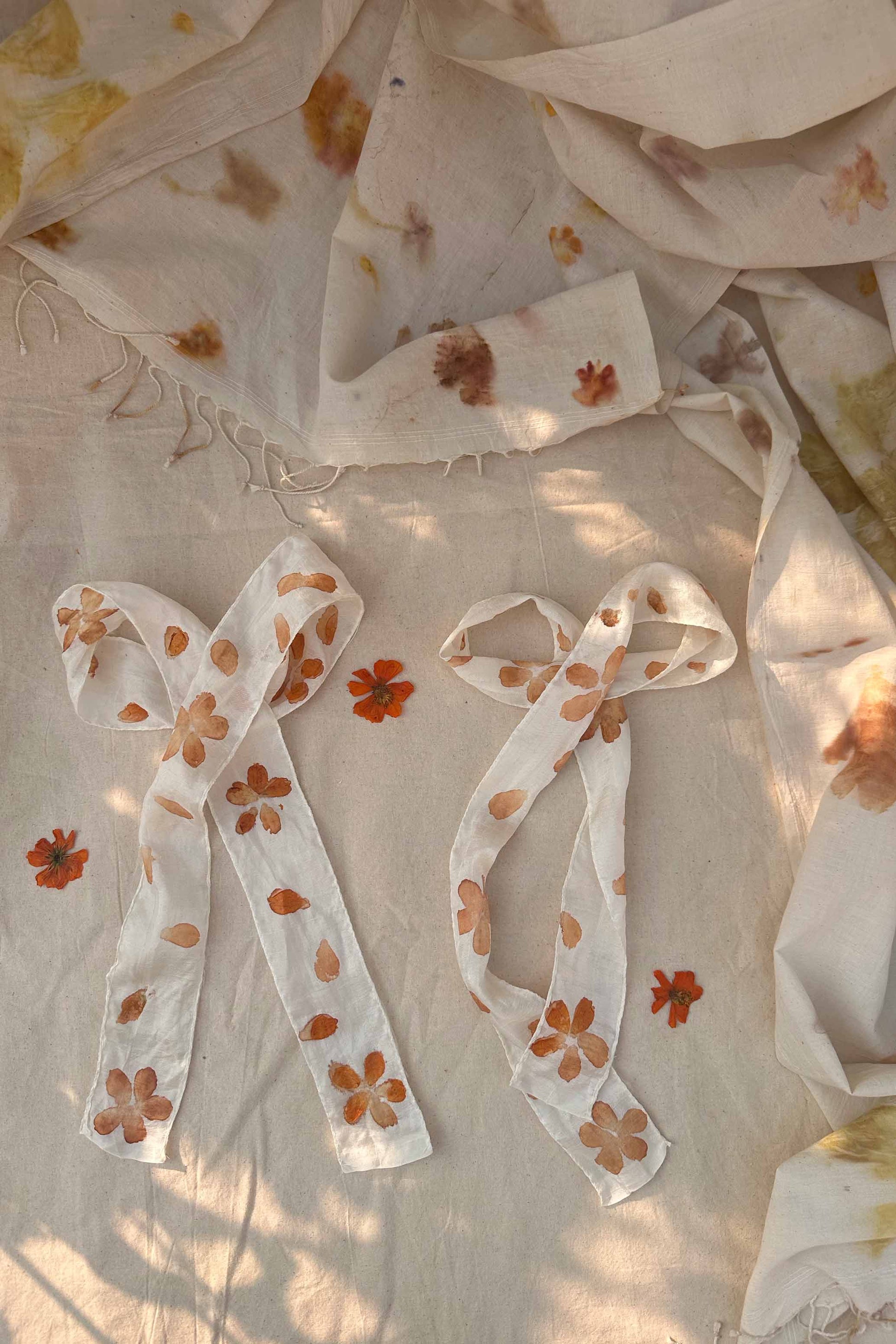 ❀ A pair of mulberry silk ribbons, hammered gently with cosmos petals.