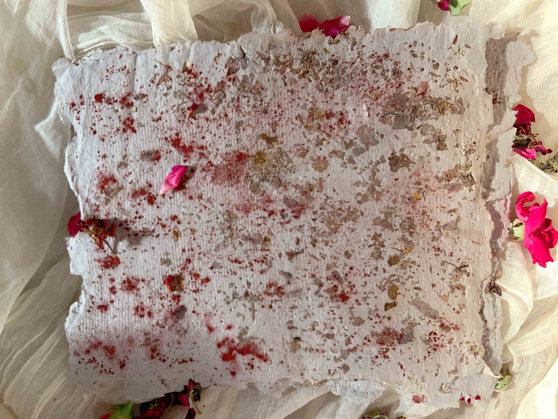 unbleached, chemical-free, recycled Hindi newspapers, colored using natural pigments like rose petals, turmeric, madder, hibiscus, etc