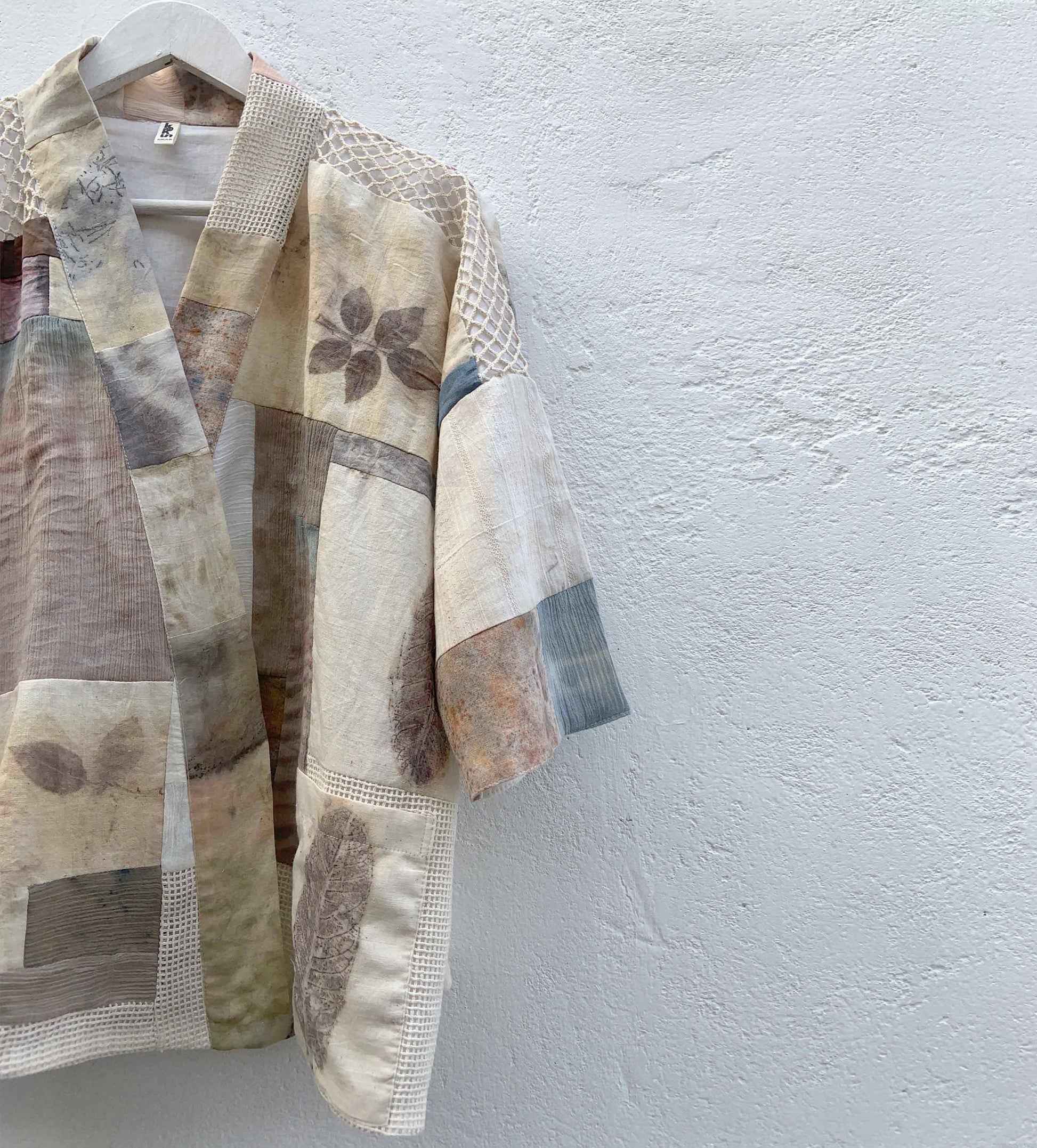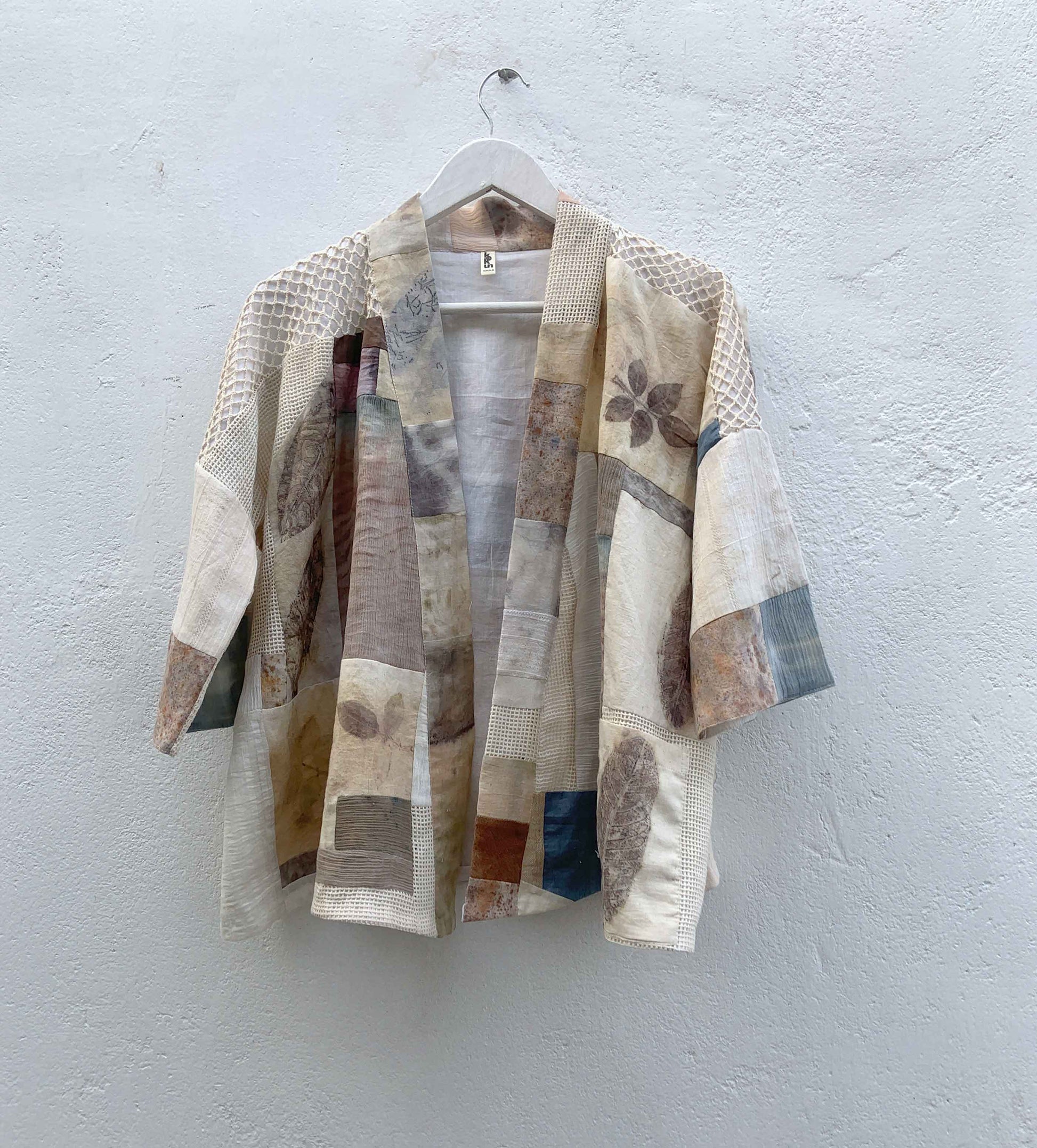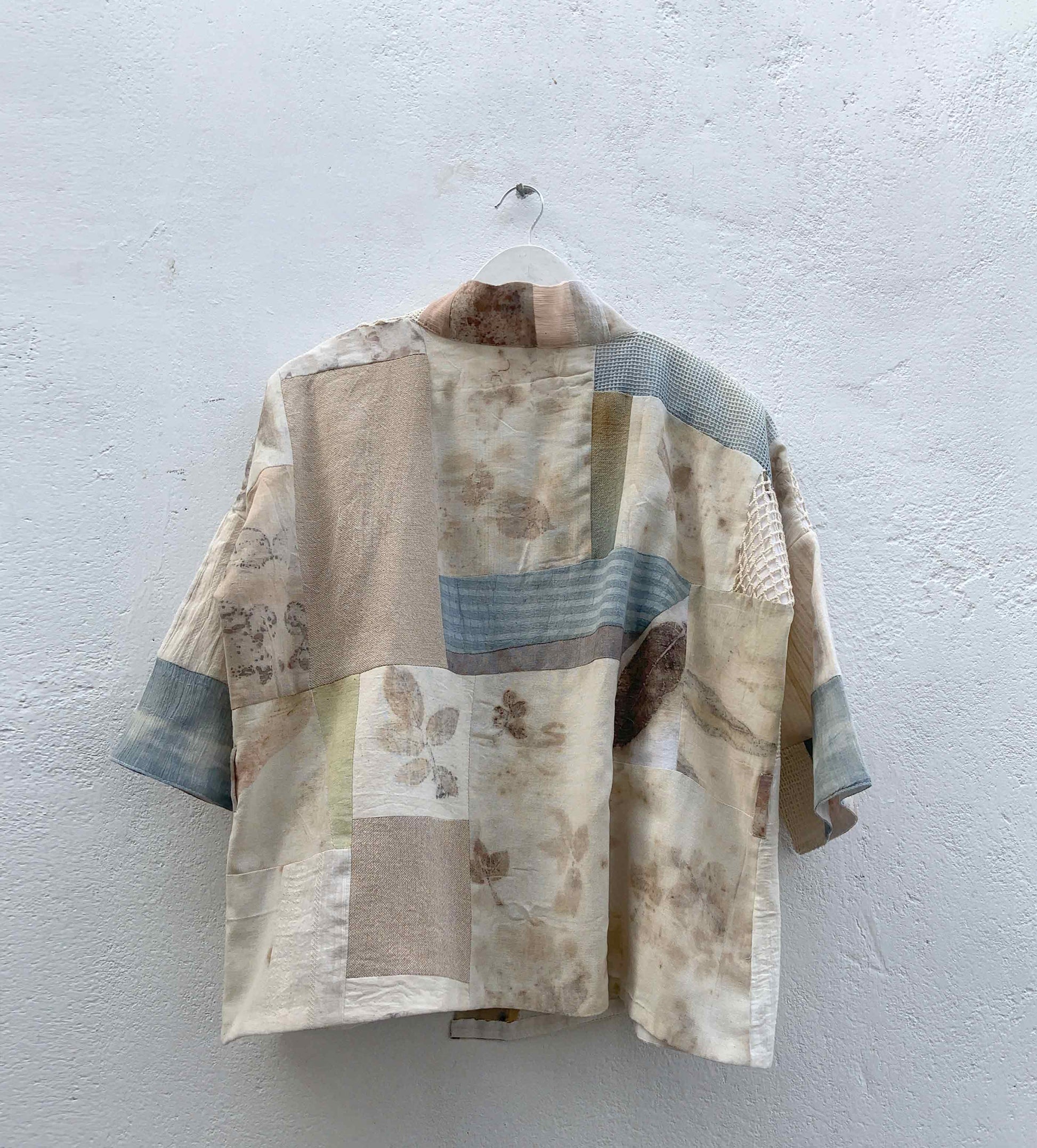 This one-off kimono is made by sewing handloom cotton pieces from our natural dyeing experiments and fabric spares that are left from our designs. Small, big; like pieces of a puzzle, they come together to make this layering piece, which can be worn by anyone regardless of their gender.
