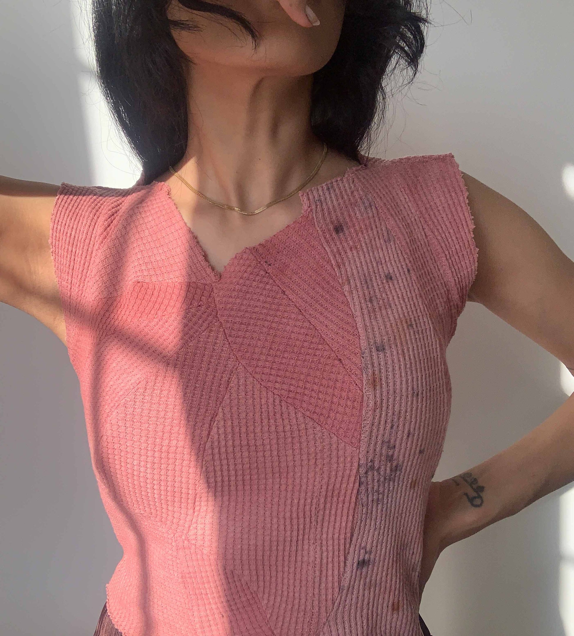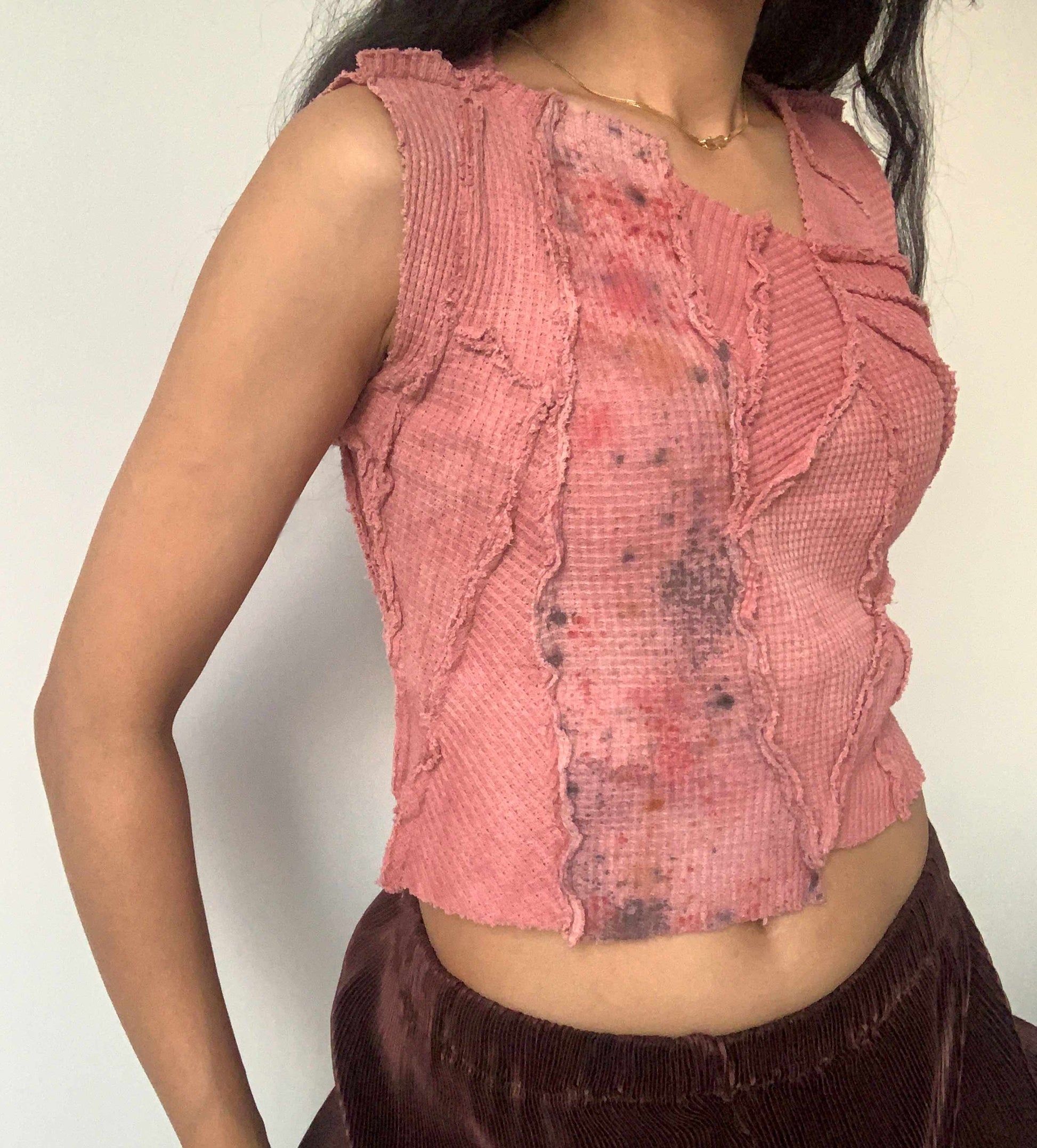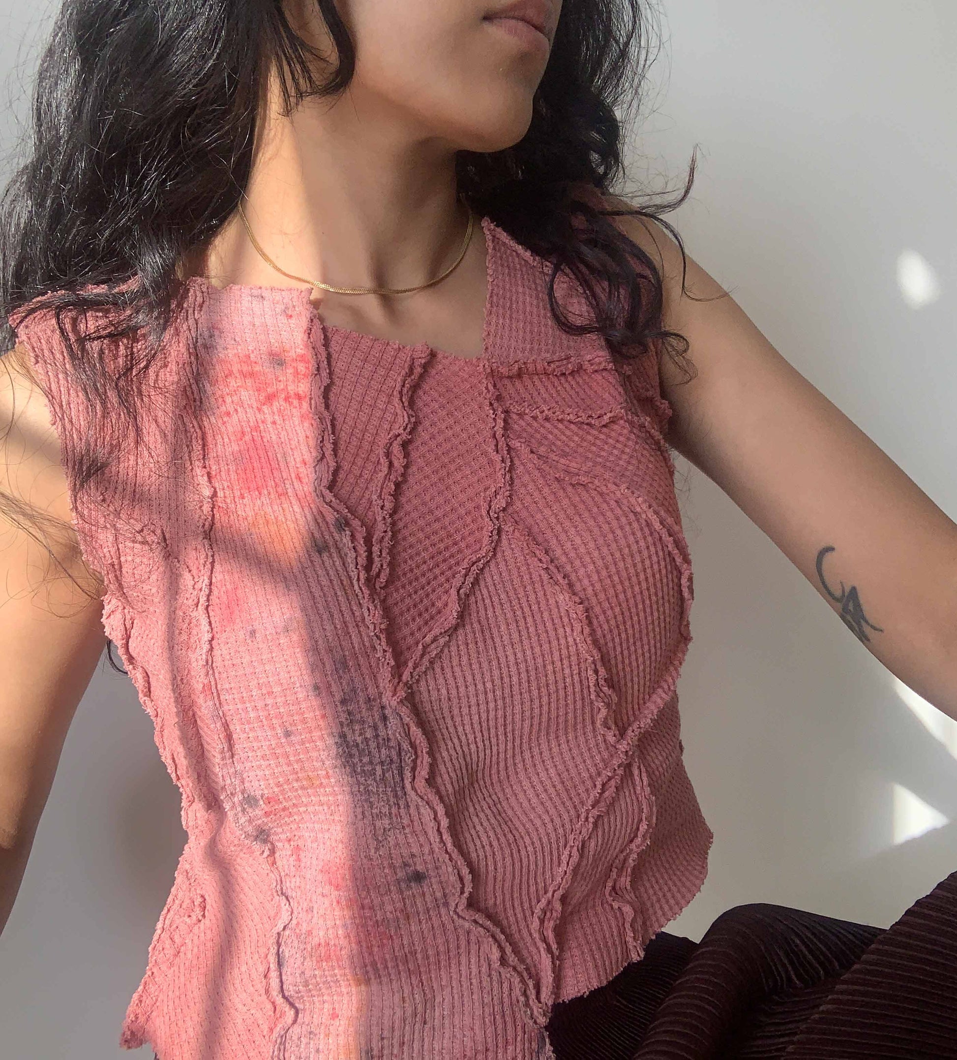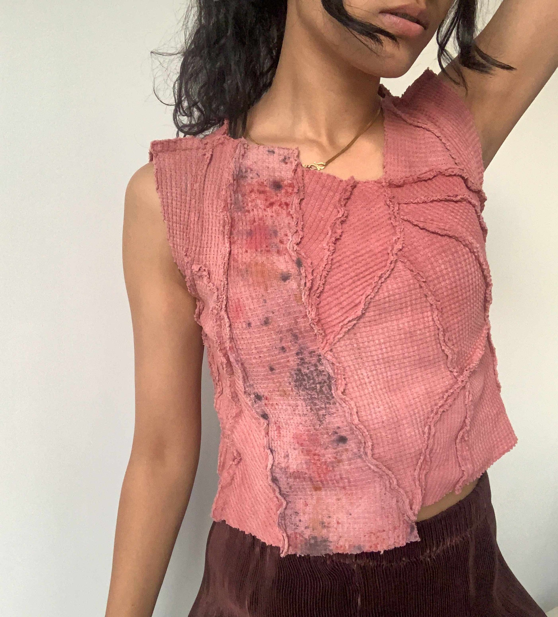 All the fabrics that give this garment a unique character are individually dyed by hand through time, to create something truly one of a kind. Seen here at play - Indian madder root's shades of pink.