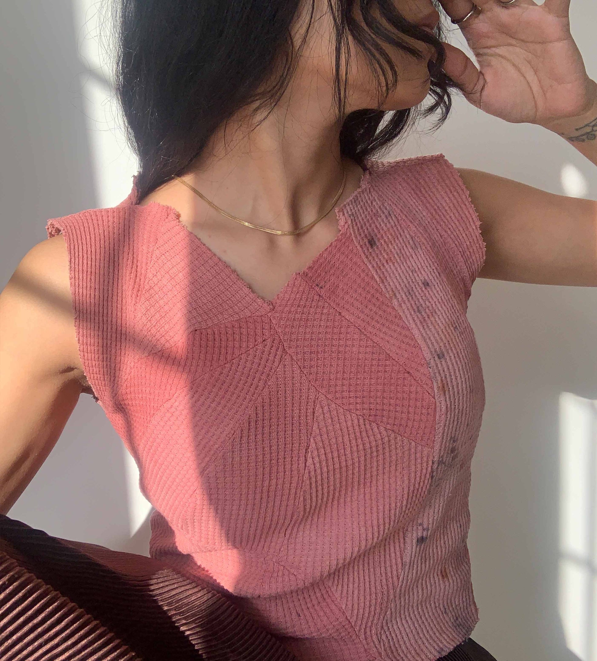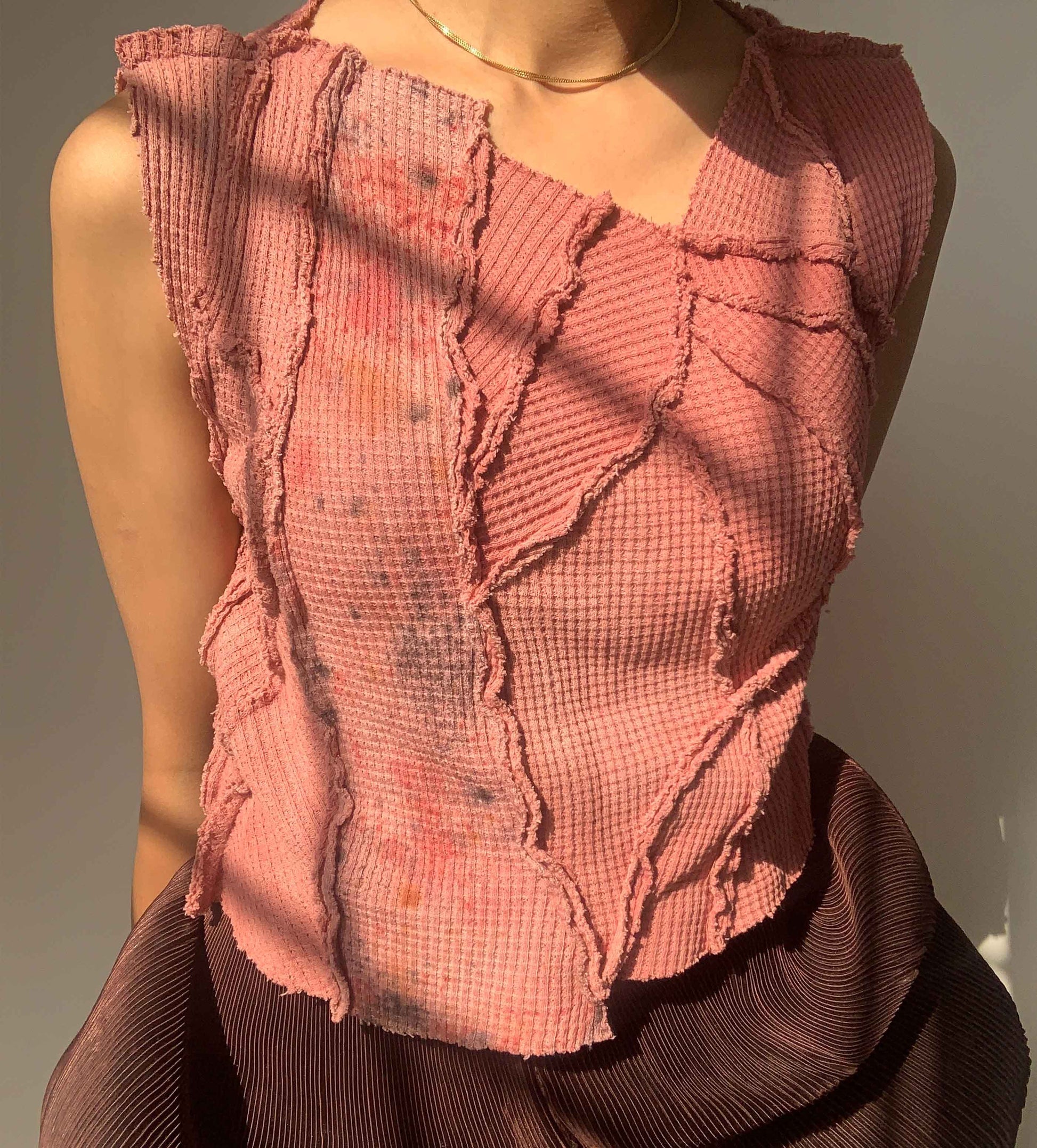This one-off top is made by combining pieces from our natural dyeing experiments and fabric spares that are left from our designs. Small, big; like pieces of a puzzle, they come together to make this rare collectible.