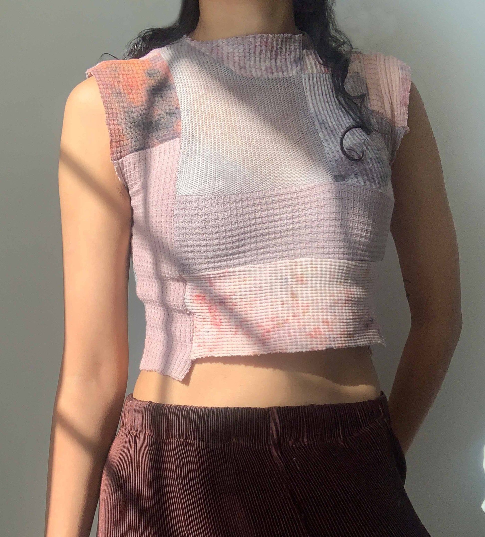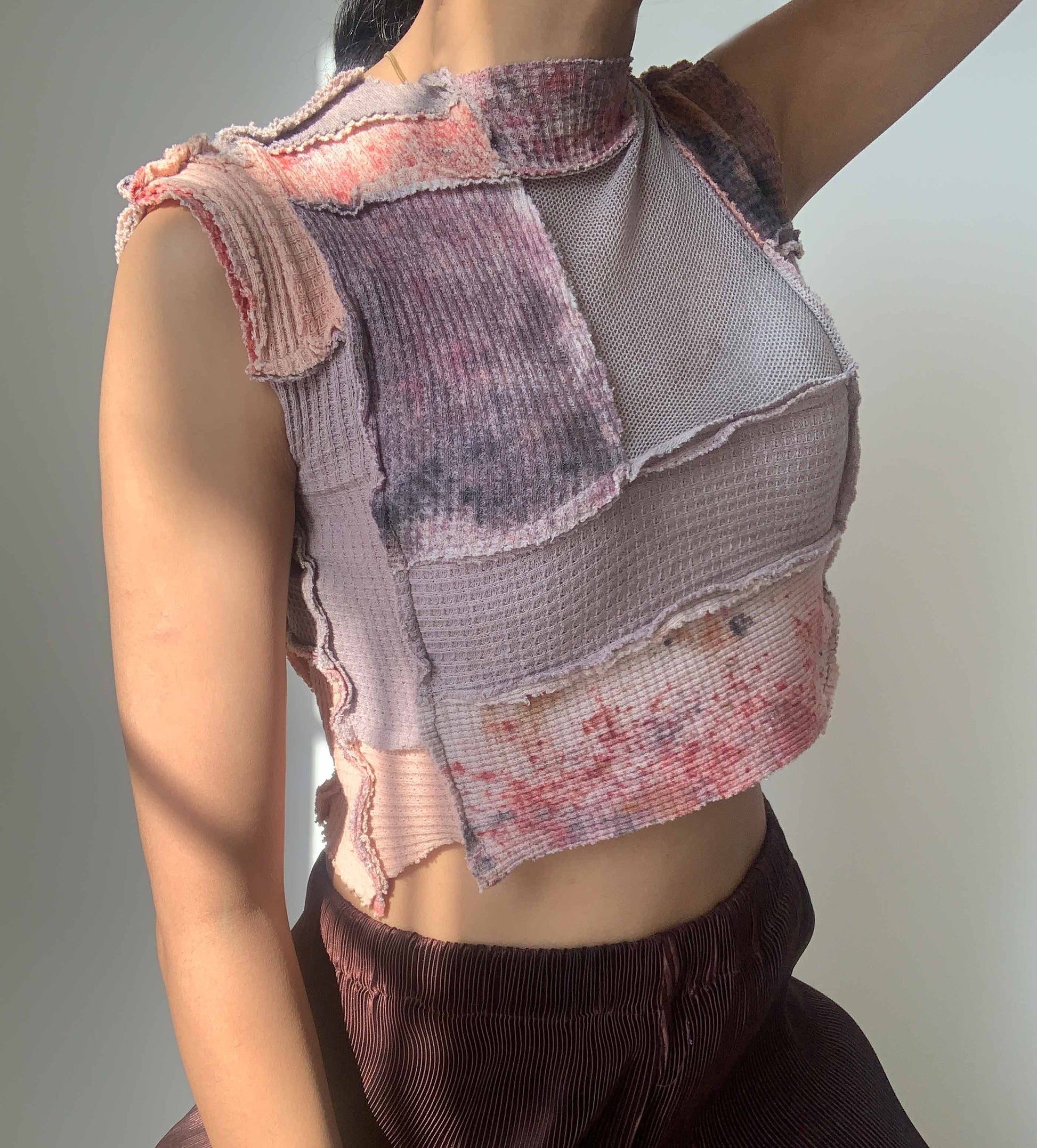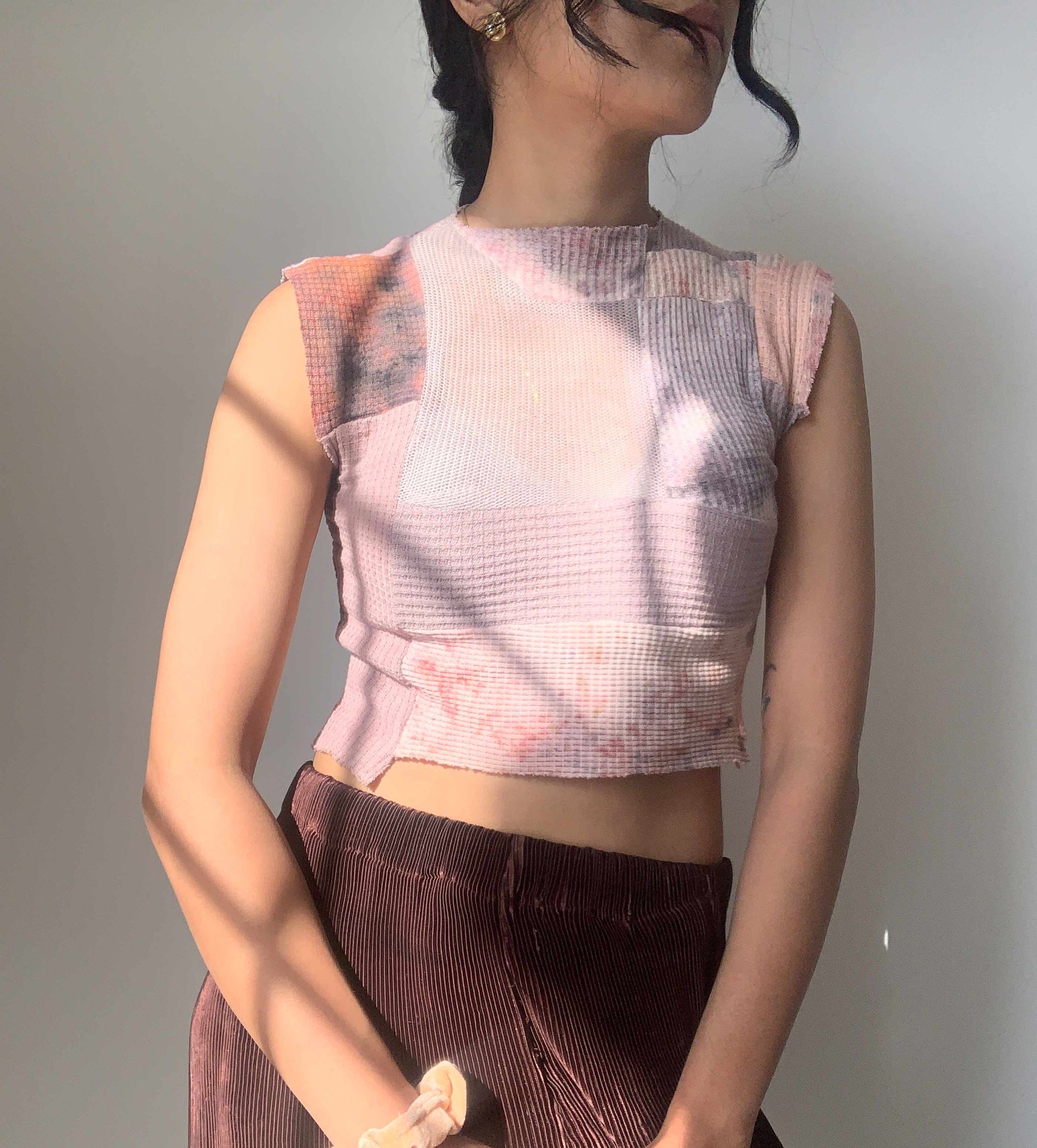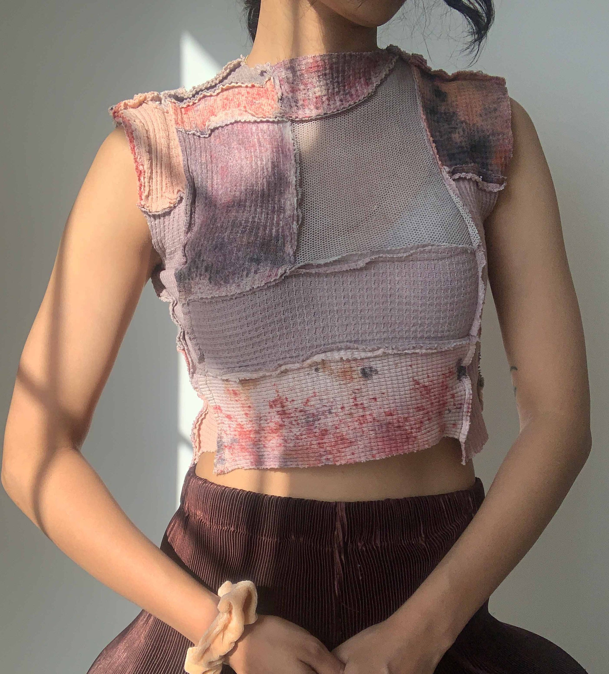 This one-off top is made by combining pieces from our natural dyeing experiments and fabric spares that are left from our designs. Small, big; like pieces of a puzzle, they come together to make this rare collectible.
