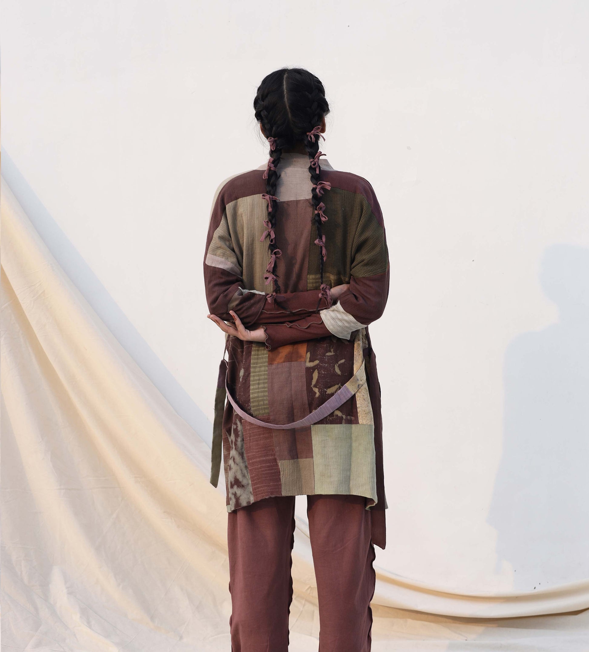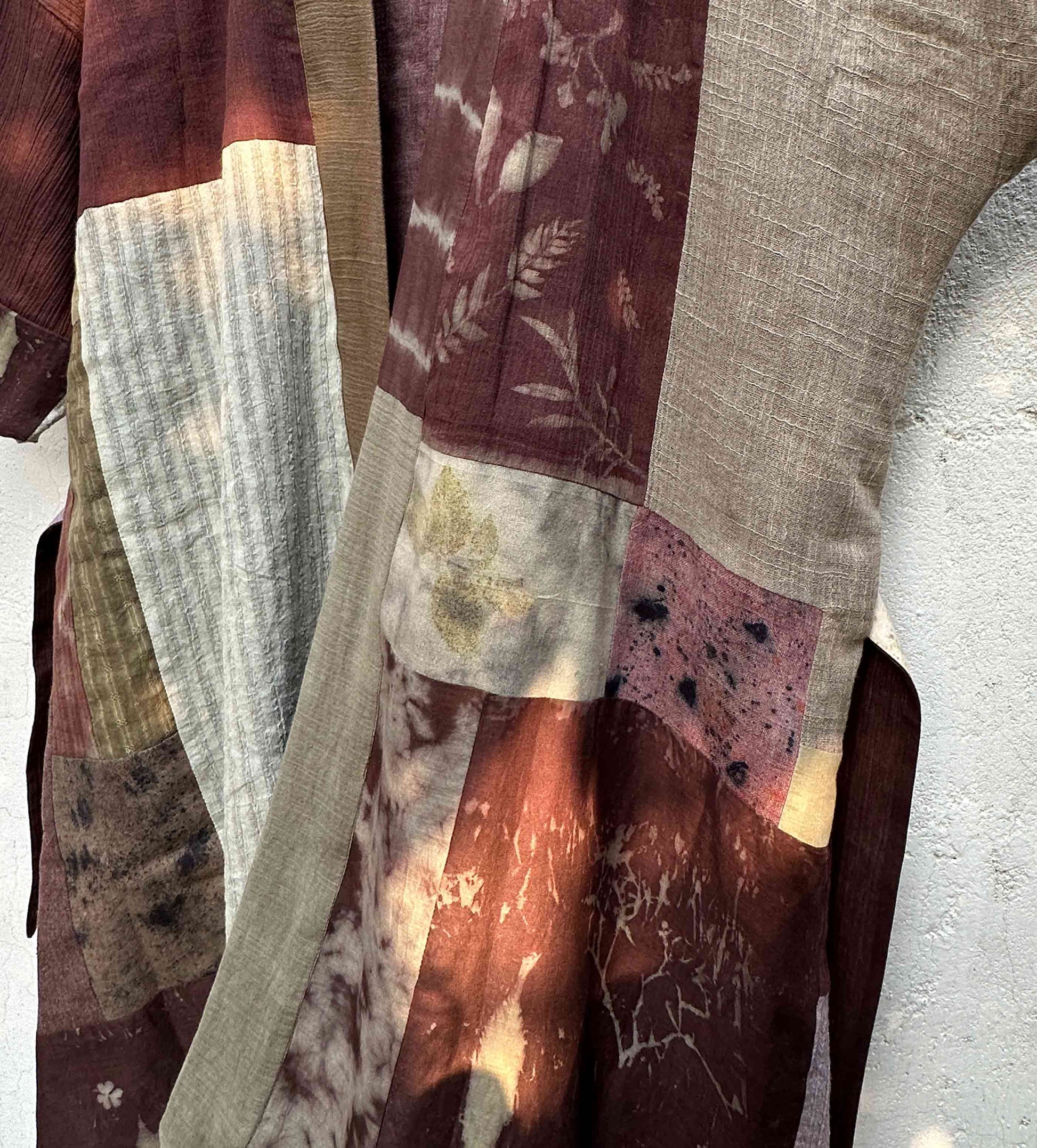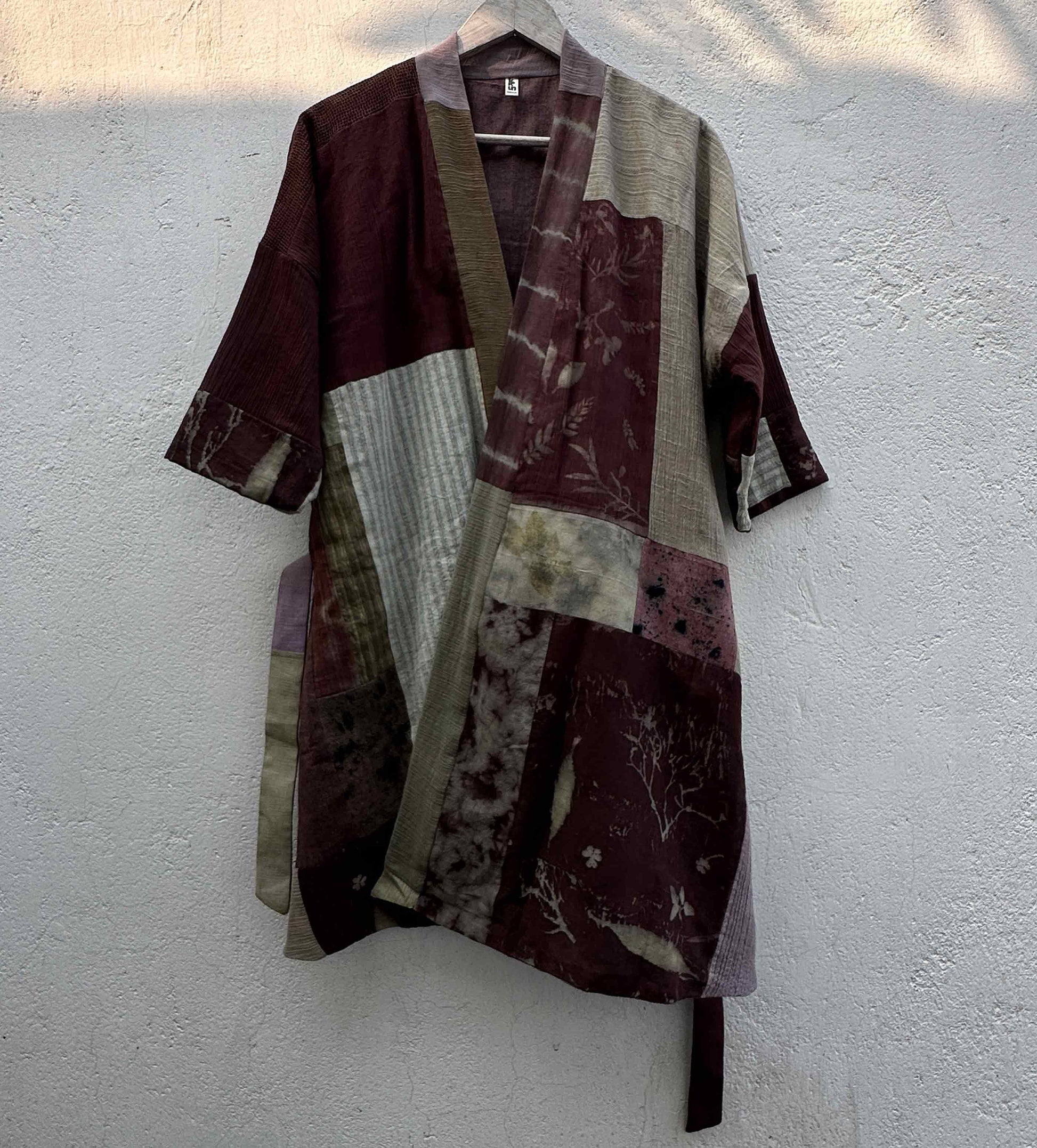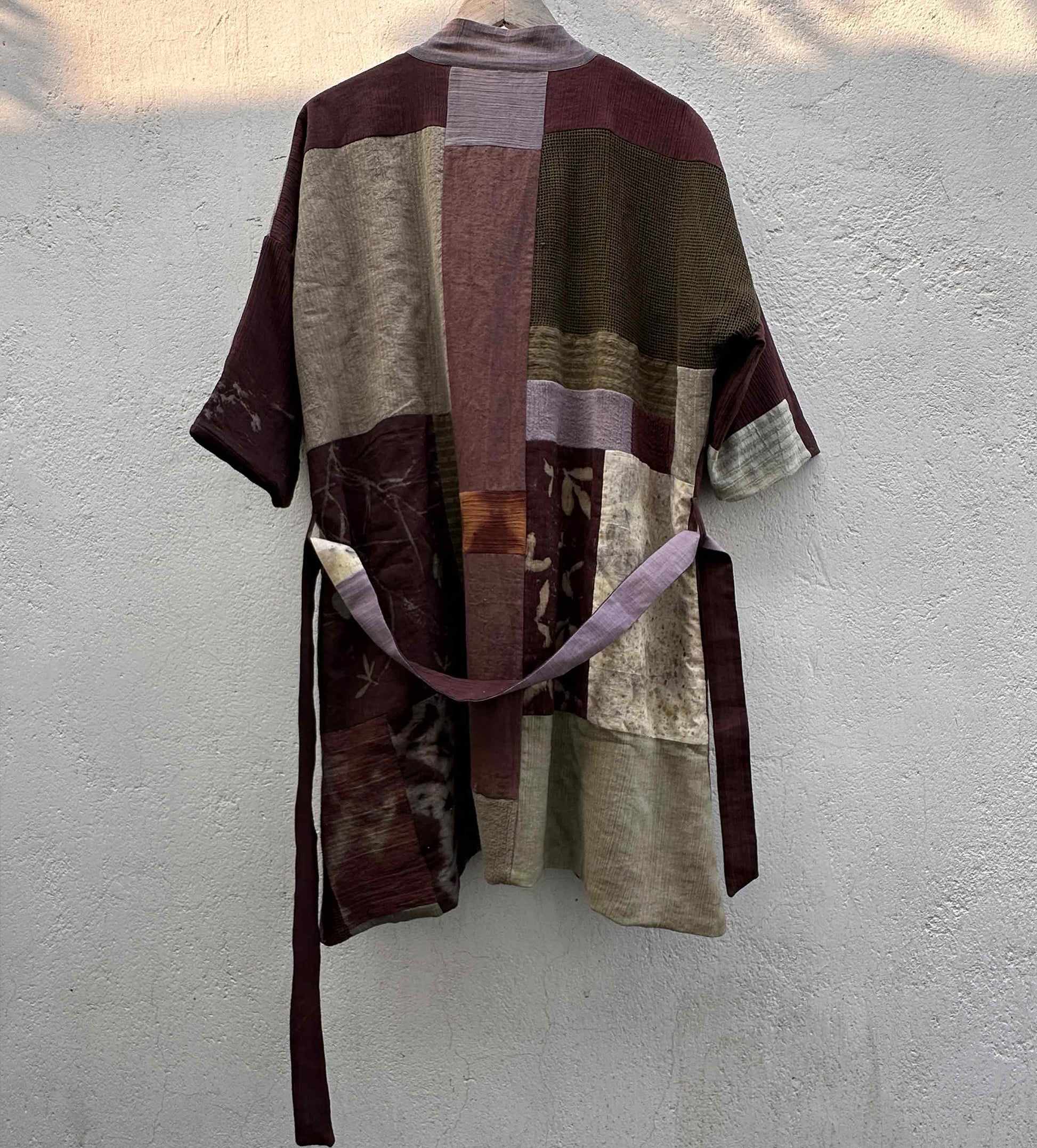 Reminiscent of autumn, this-off kimono, is made by sewing handloom cotton pieces from our natural dyeing experiments and fabric spares that are left from our designs. Small, big; like pieces of a puzzle, they come together to make this layering piece, which can be worn by anyone regardless of their gender.