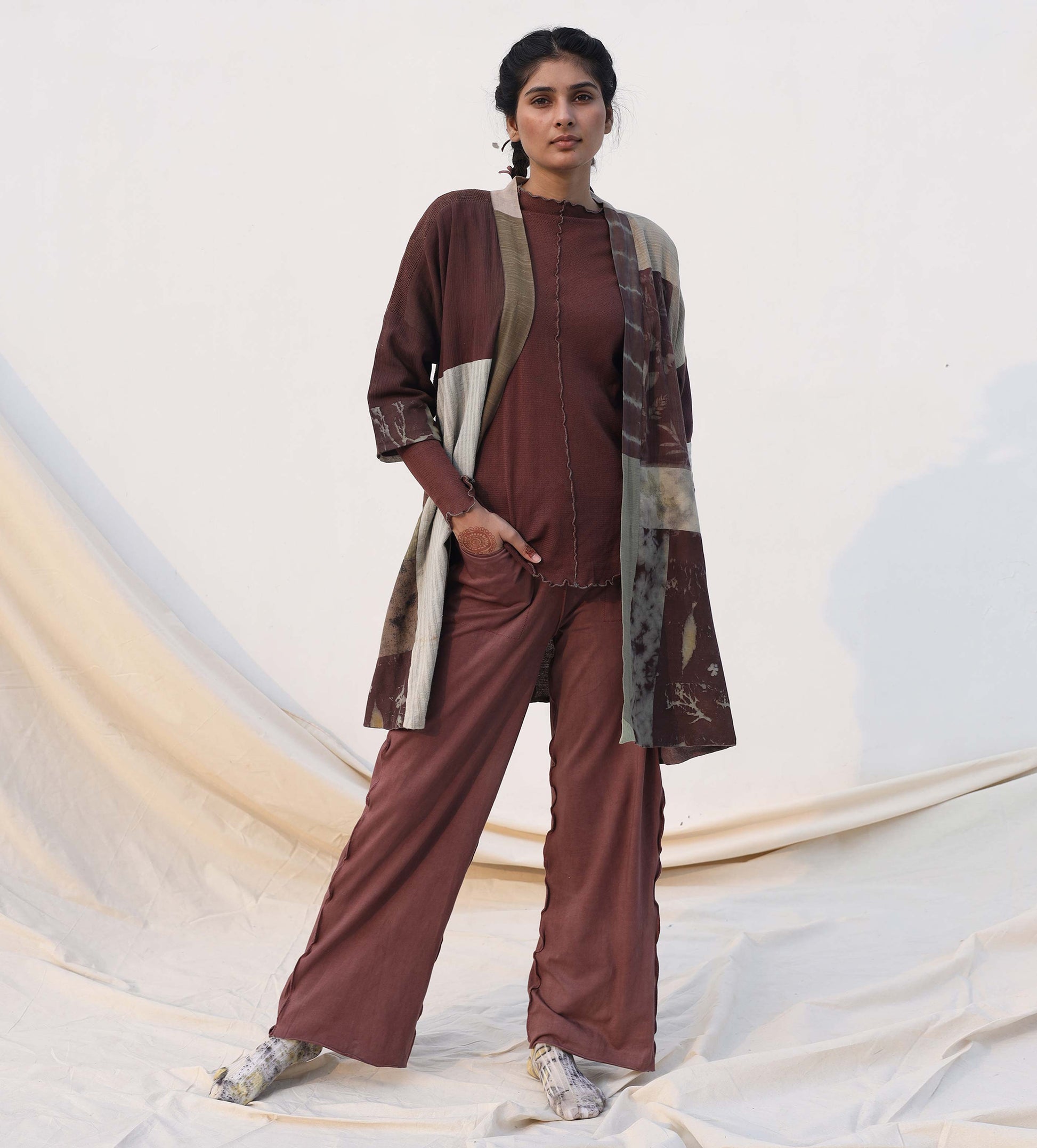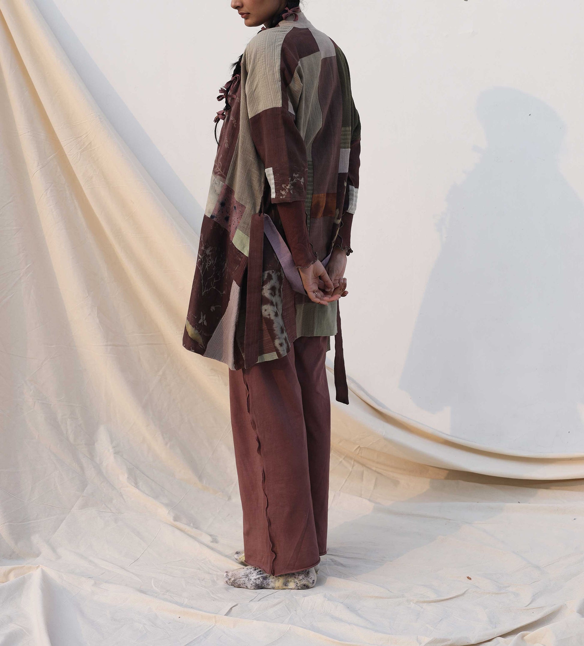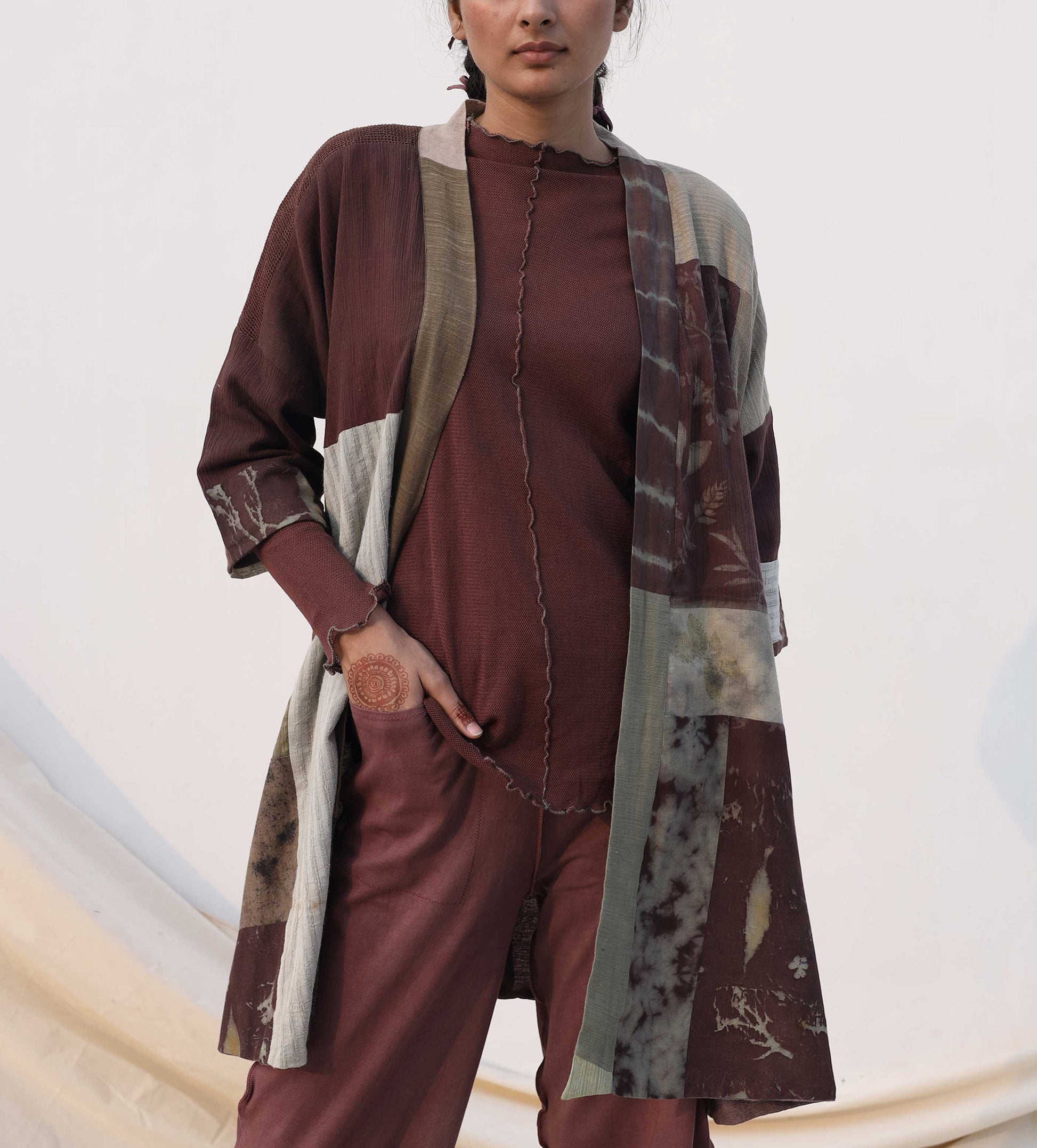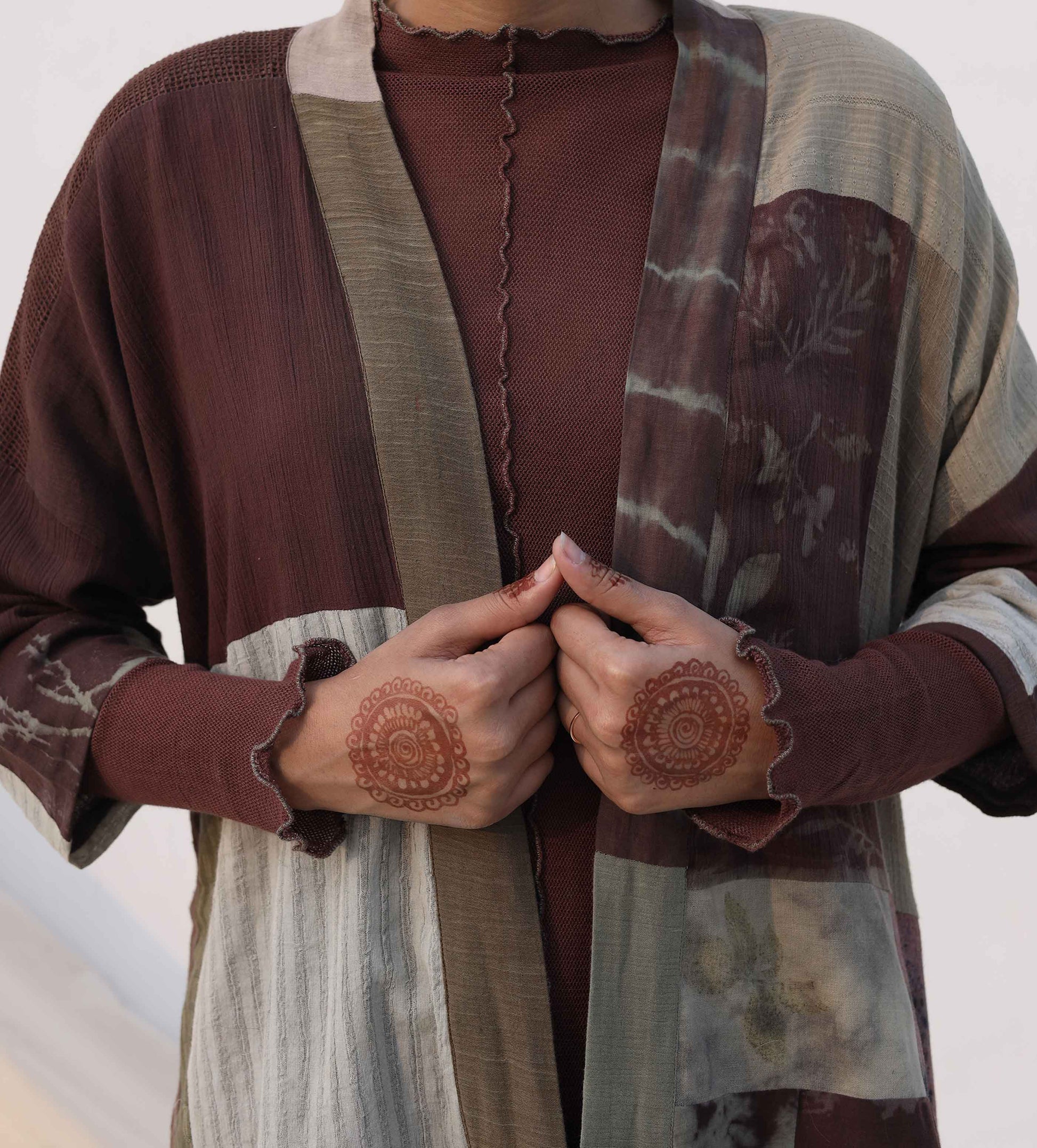 Reminiscent of autumn, this-off kimono, is made by sewing handloom cotton pieces from our natural dyeing experiments and fabric spares that are left from our designs. Small, big; like pieces of a puzzle, they come together to make this layering piece, which can be worn by anyone regardless of their gender.