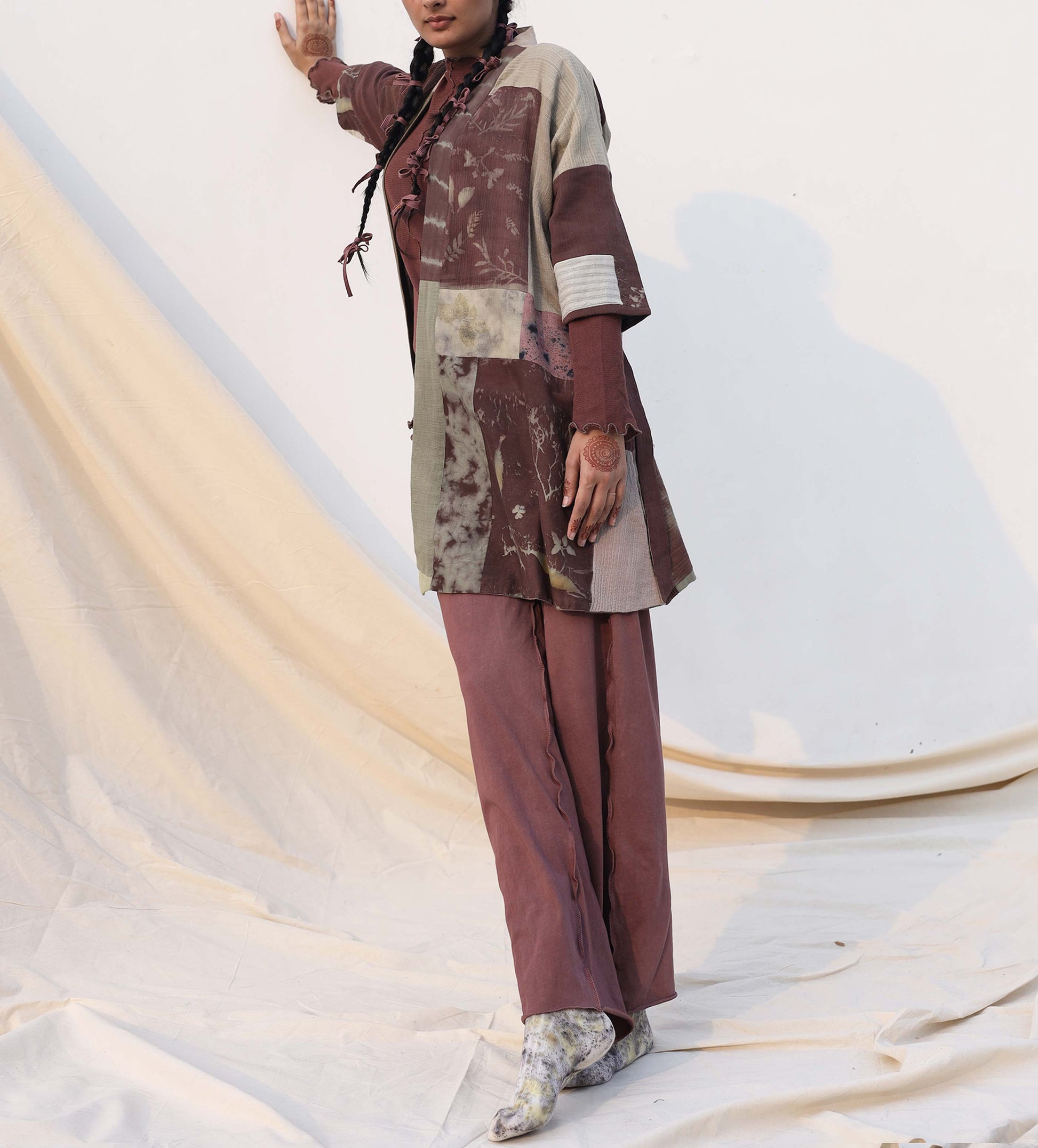 All the fabrics that give this garment a unique character are individually dyed by hand through time, using our homegrown natural dyes. Catechu, Tea, Himalayan Rhubarb, Indigo, Maddar roots, Hibiscus, roses, and other plant parts from our garden; all come at play to create something truly one of a kind.