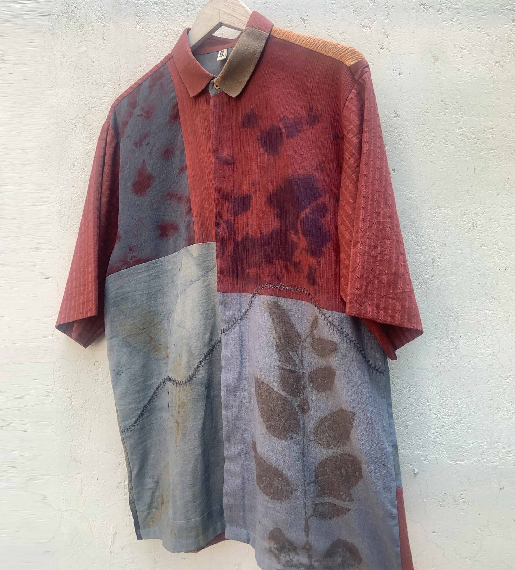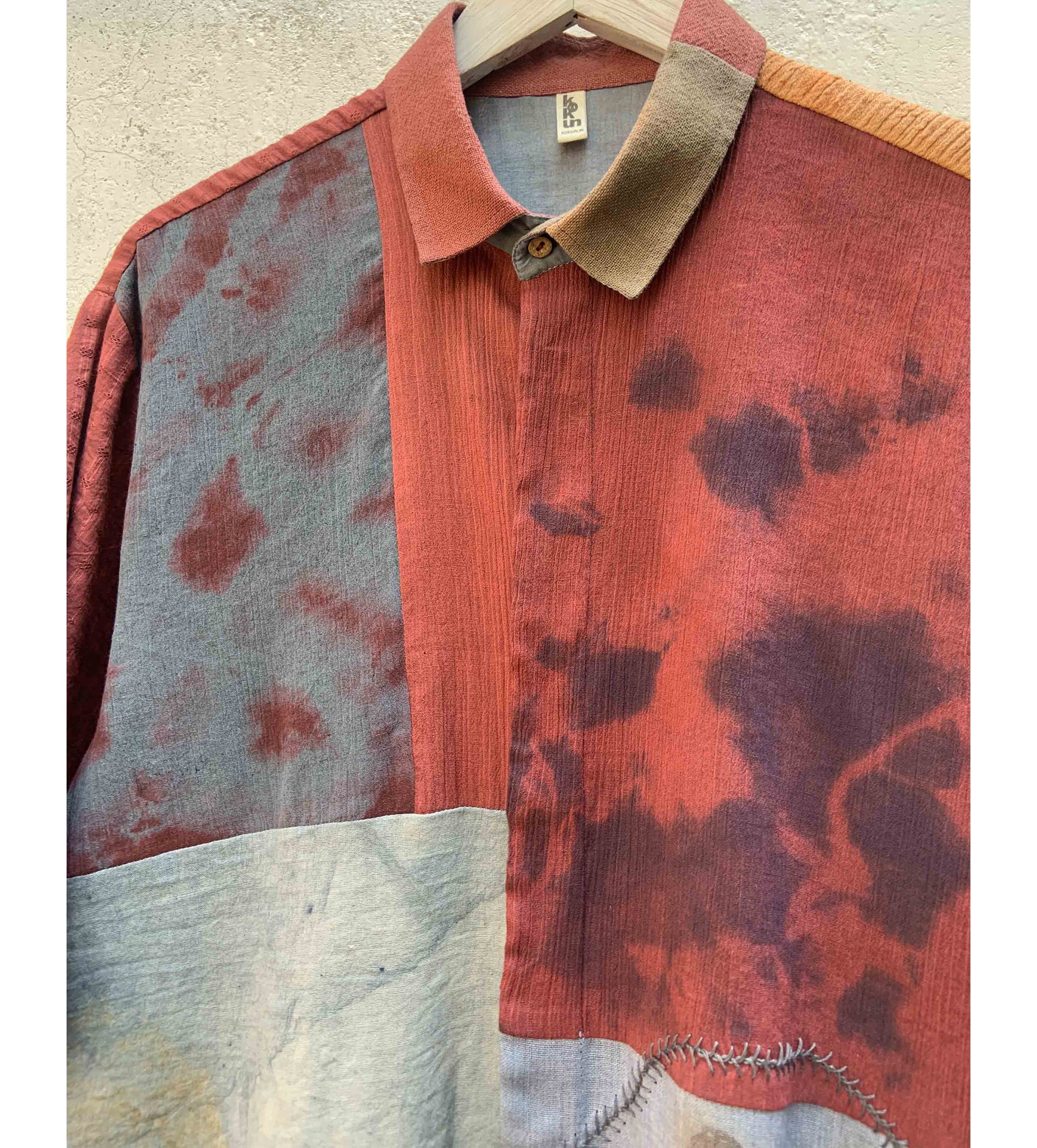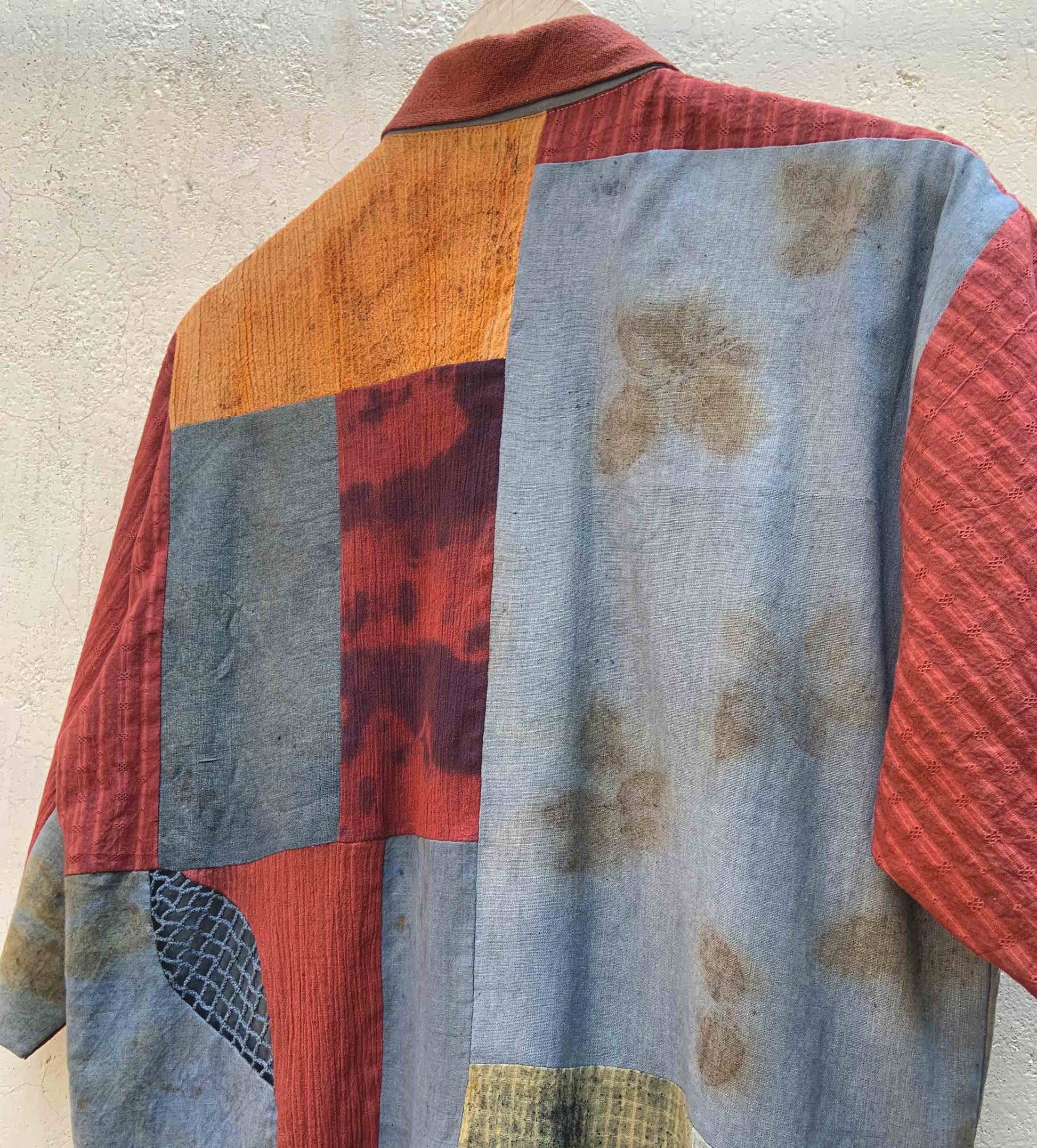 This one-off shirt is made by putting together pieces from our natural dyeing experiments and fabric spares that are left from our designs. Small, big; like pieces of a puzzle, they come together to make this rare collectible, which can be worn by anyone regardless of their gender.