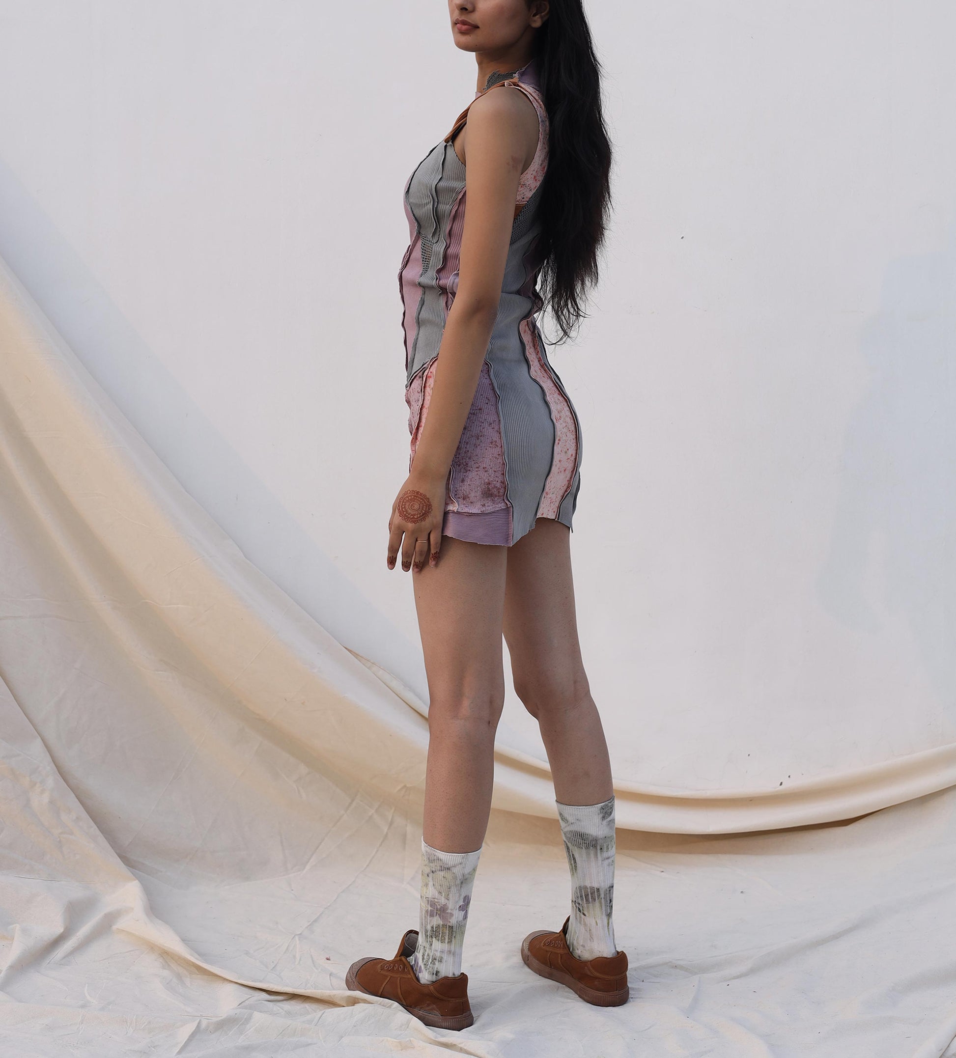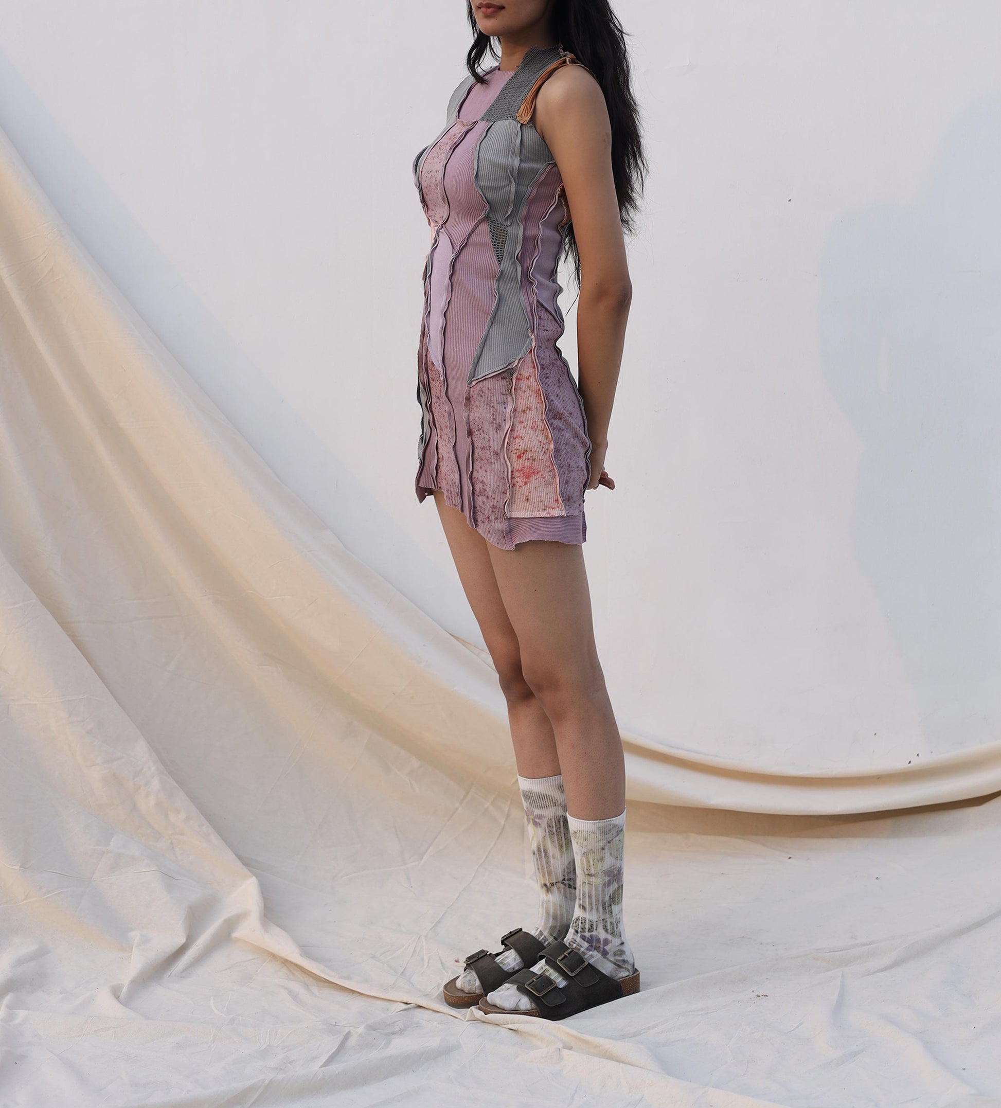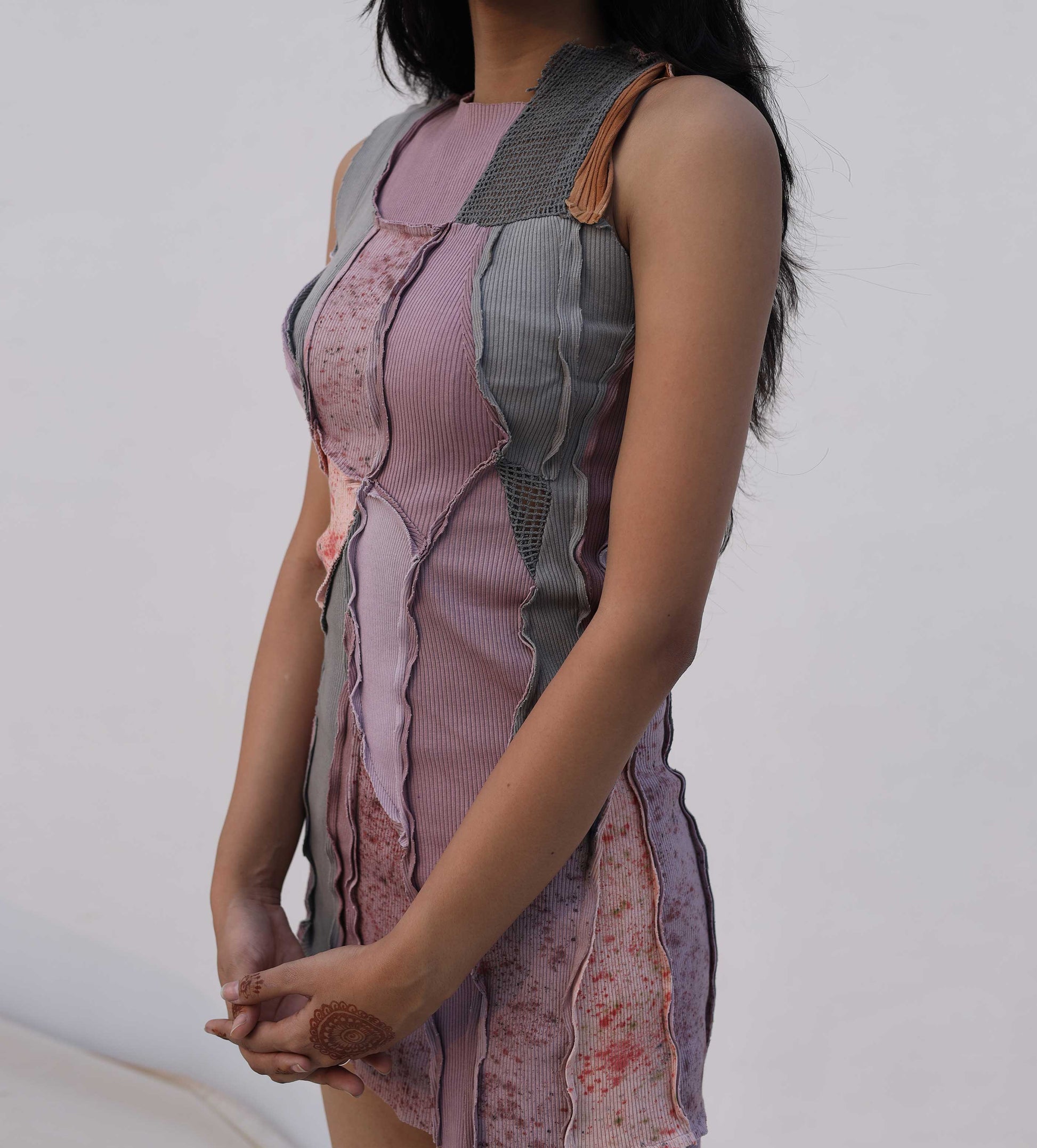 This dress combines pieces from our natural dyeing experiments. Small, big; like pieces from a puzzle - come together to make this rare collectible.