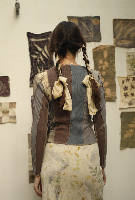 All the fabrics that give this garment a unique character are individually dyed by hand, using Indigo, rust, myrobalan, catechu, walnut, and native flowers and plant parts, to create something truly one of a kind.