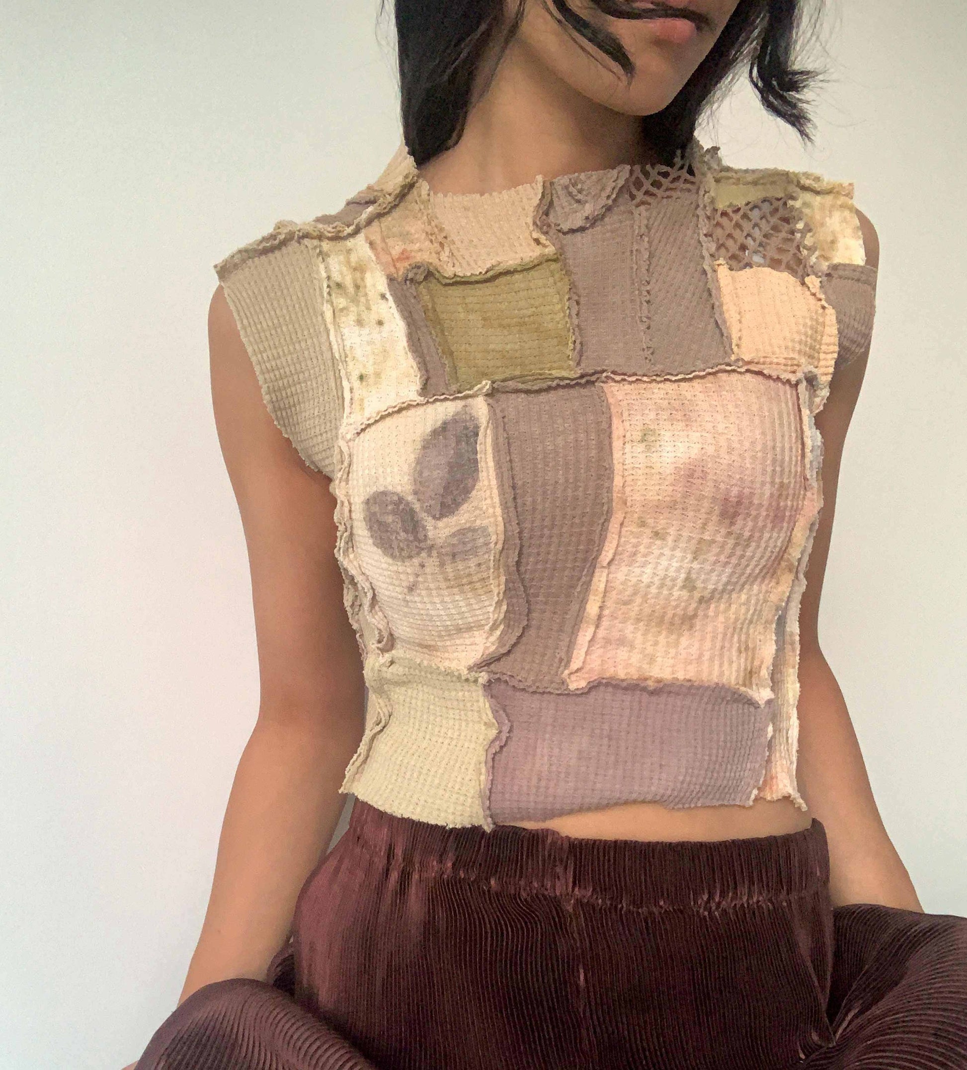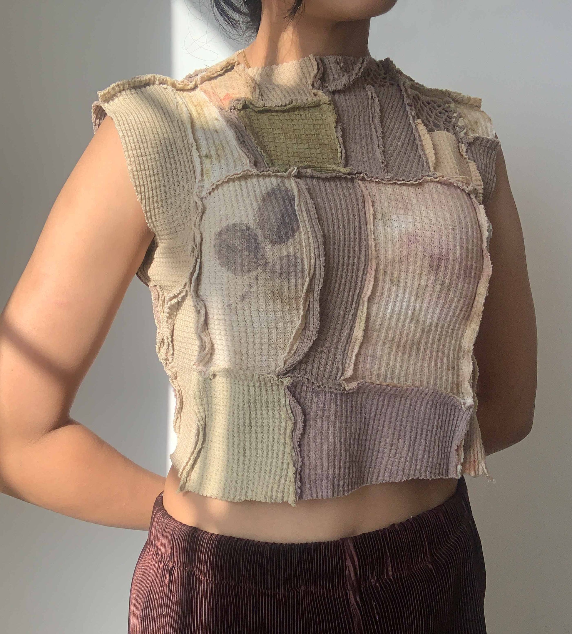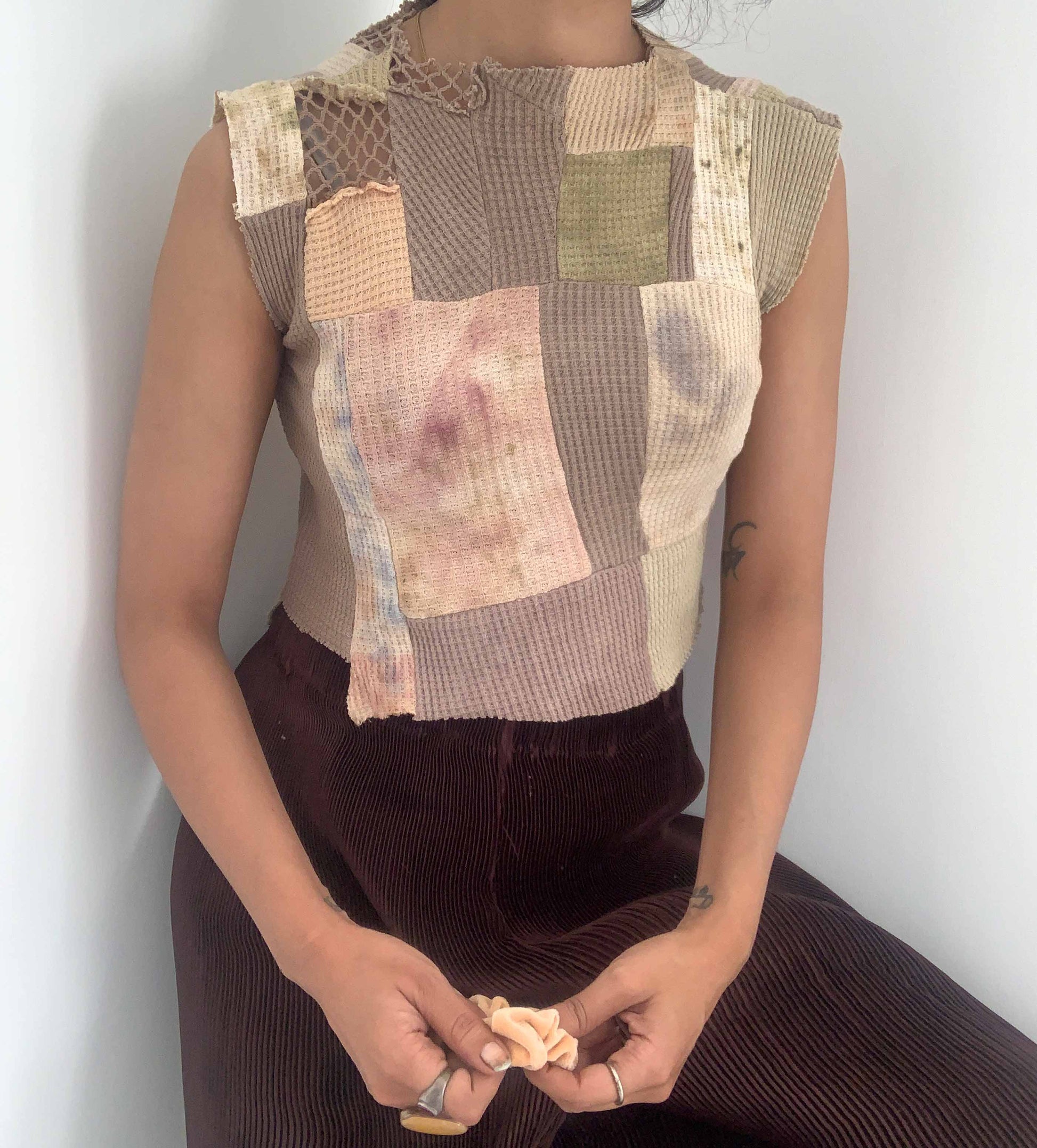 This one-off top is made by combining pieces from our natural dyeing experiments and fabric spares that are left from our designs. Small, big; like pieces of a puzzle, they come together to make this rare collectible.