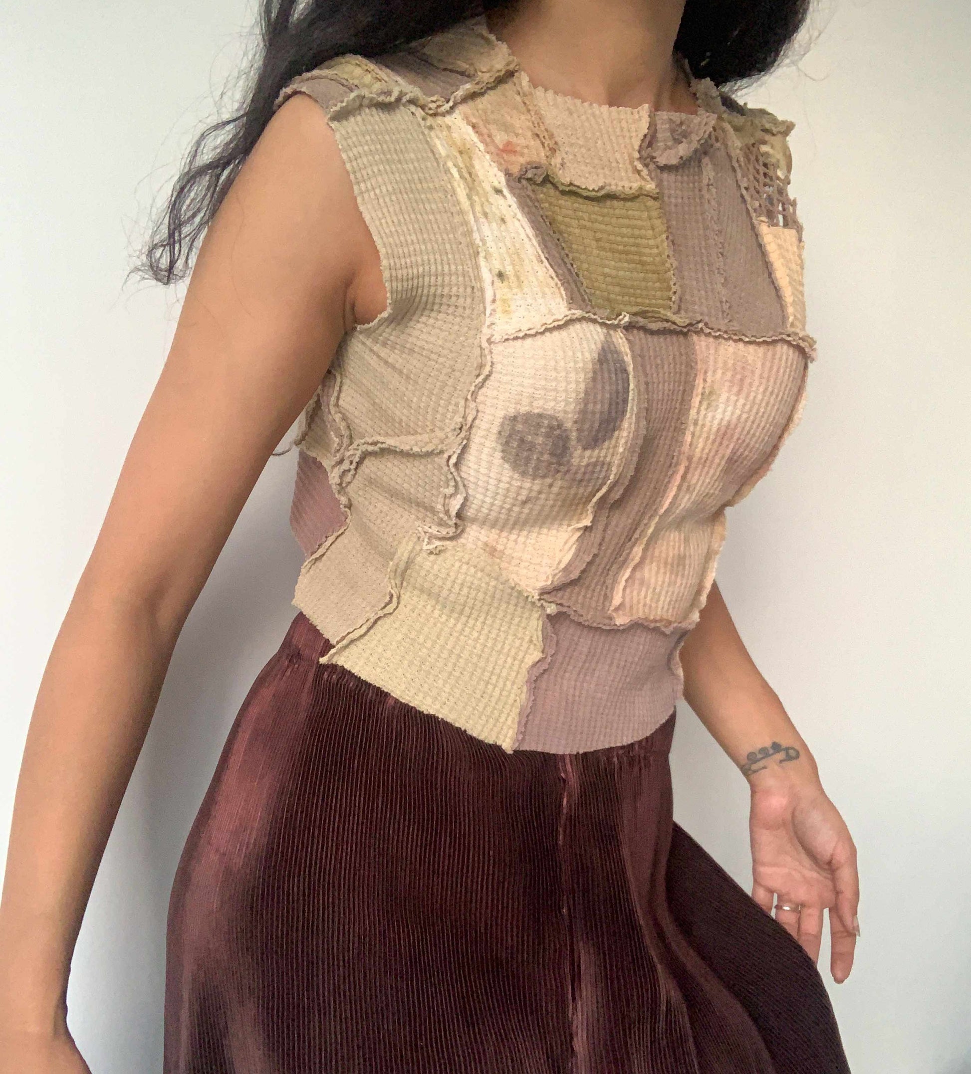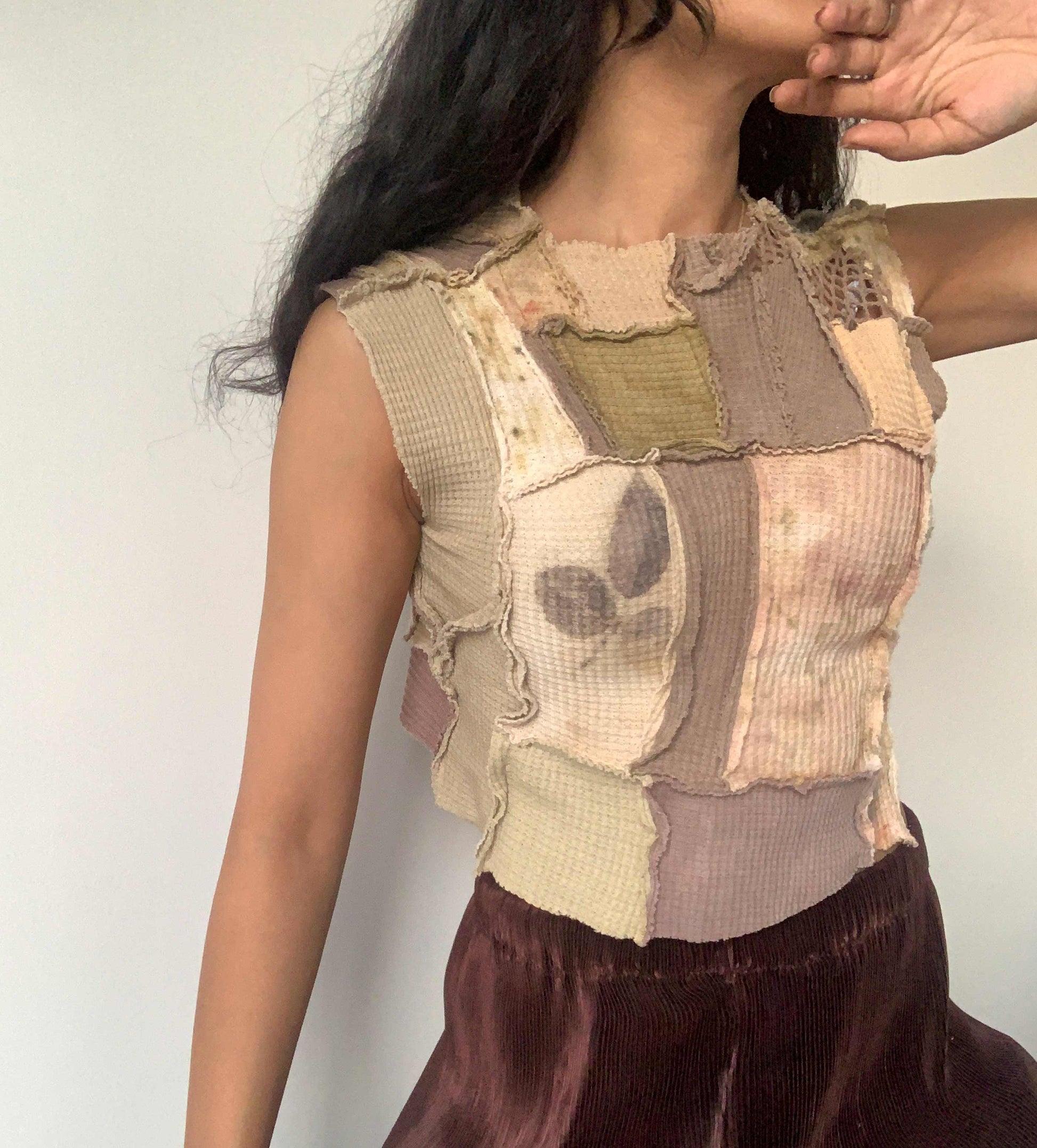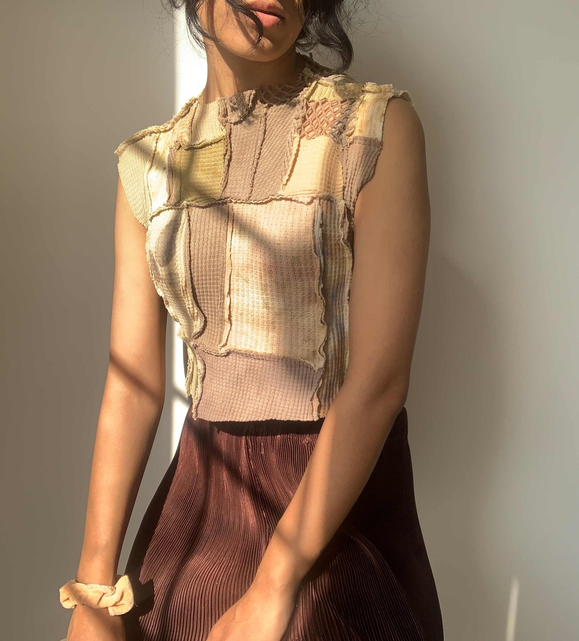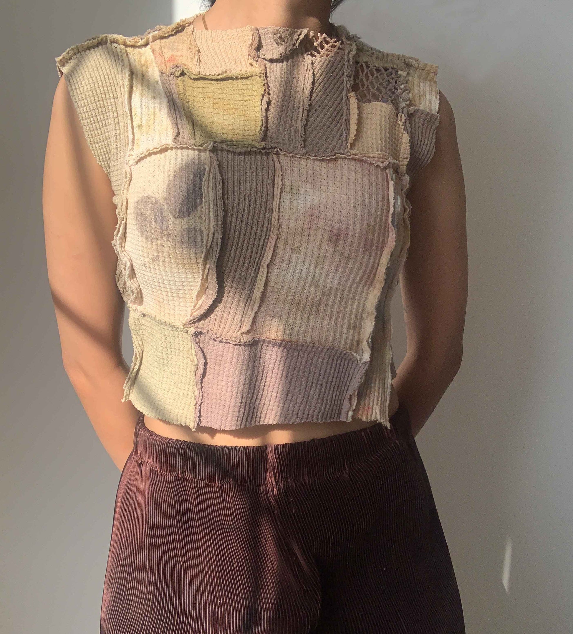 This one-off top is made by combining pieces from our natural dyeing experiments and fabric spares that are left from our designs. Small, big; like pieces of a puzzle, they come together to make this rare collectible.