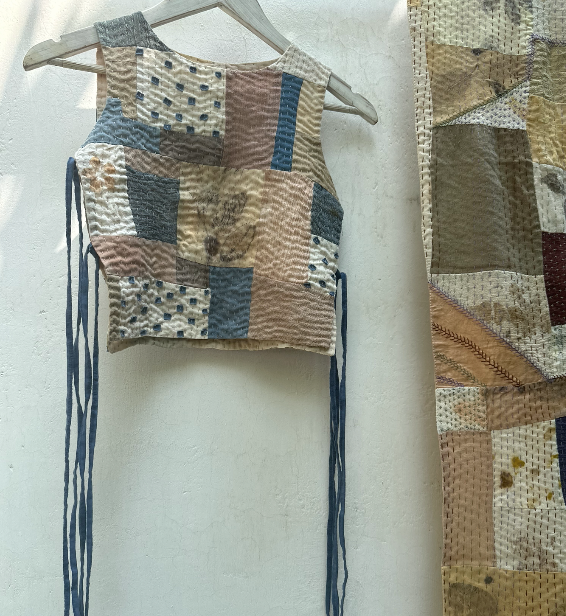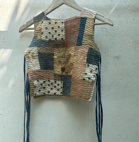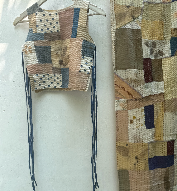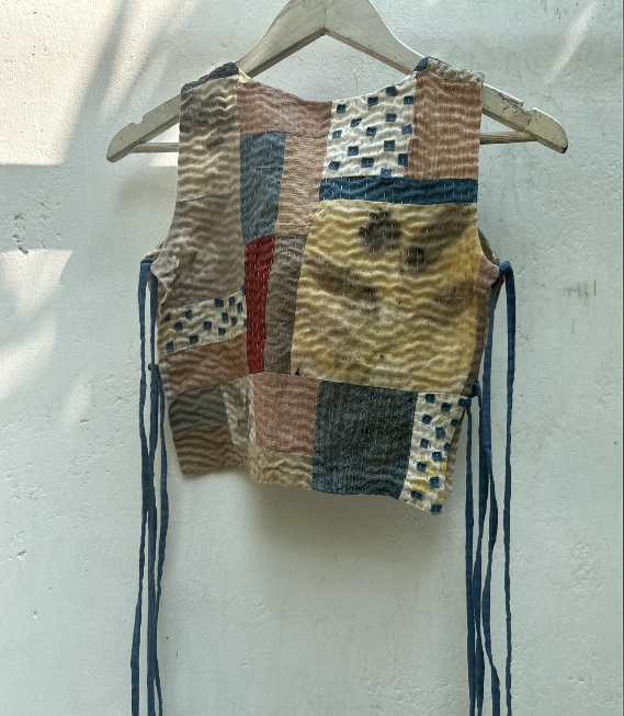 A zero-waste vest, with tie-up closure on the sides. It makes a versatile layering piece over staples. Made by combining fabric leftovers and colored using native plants, extracted by rural women. It gets its distinct texture from tiny hand-done stitches.