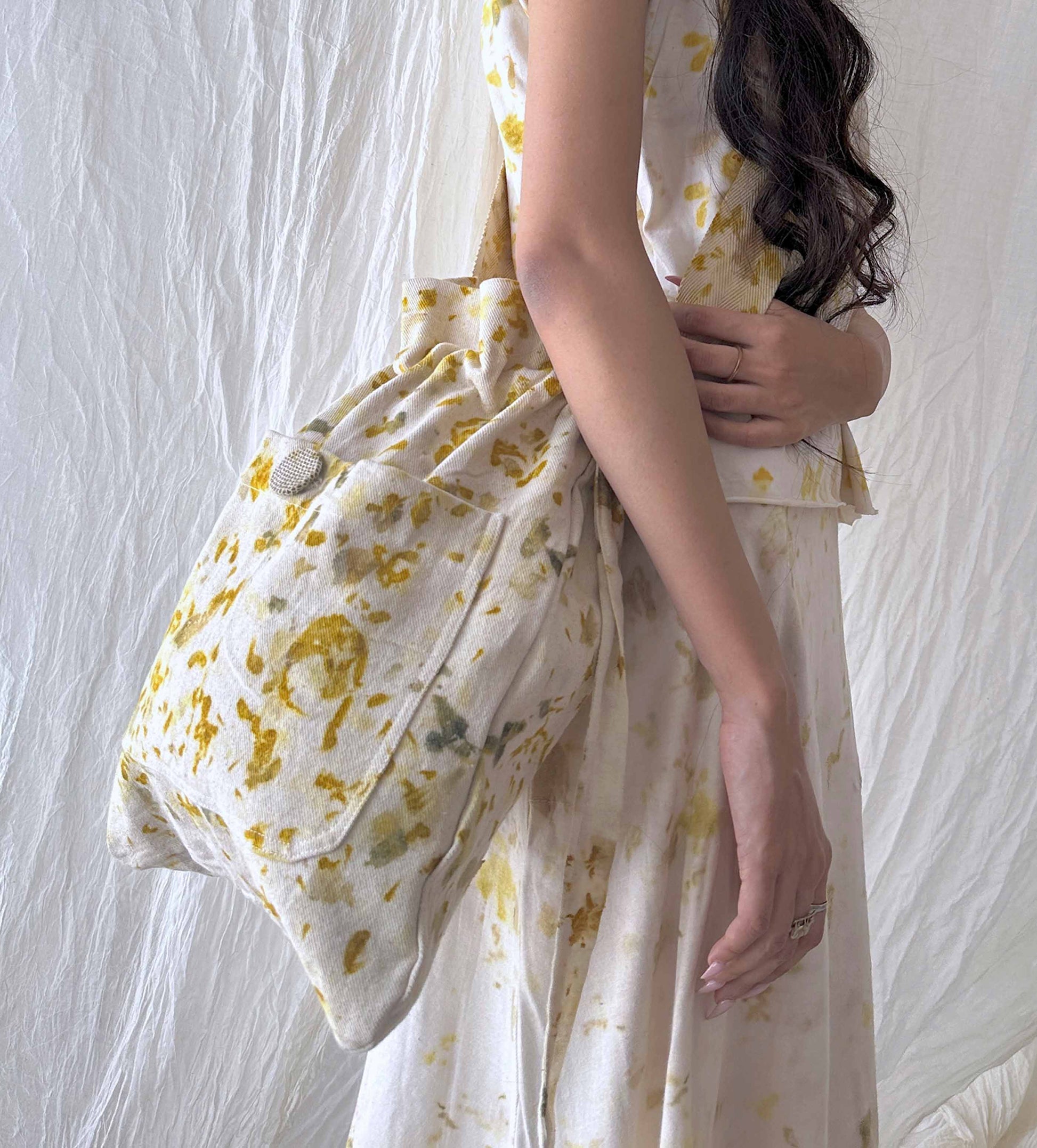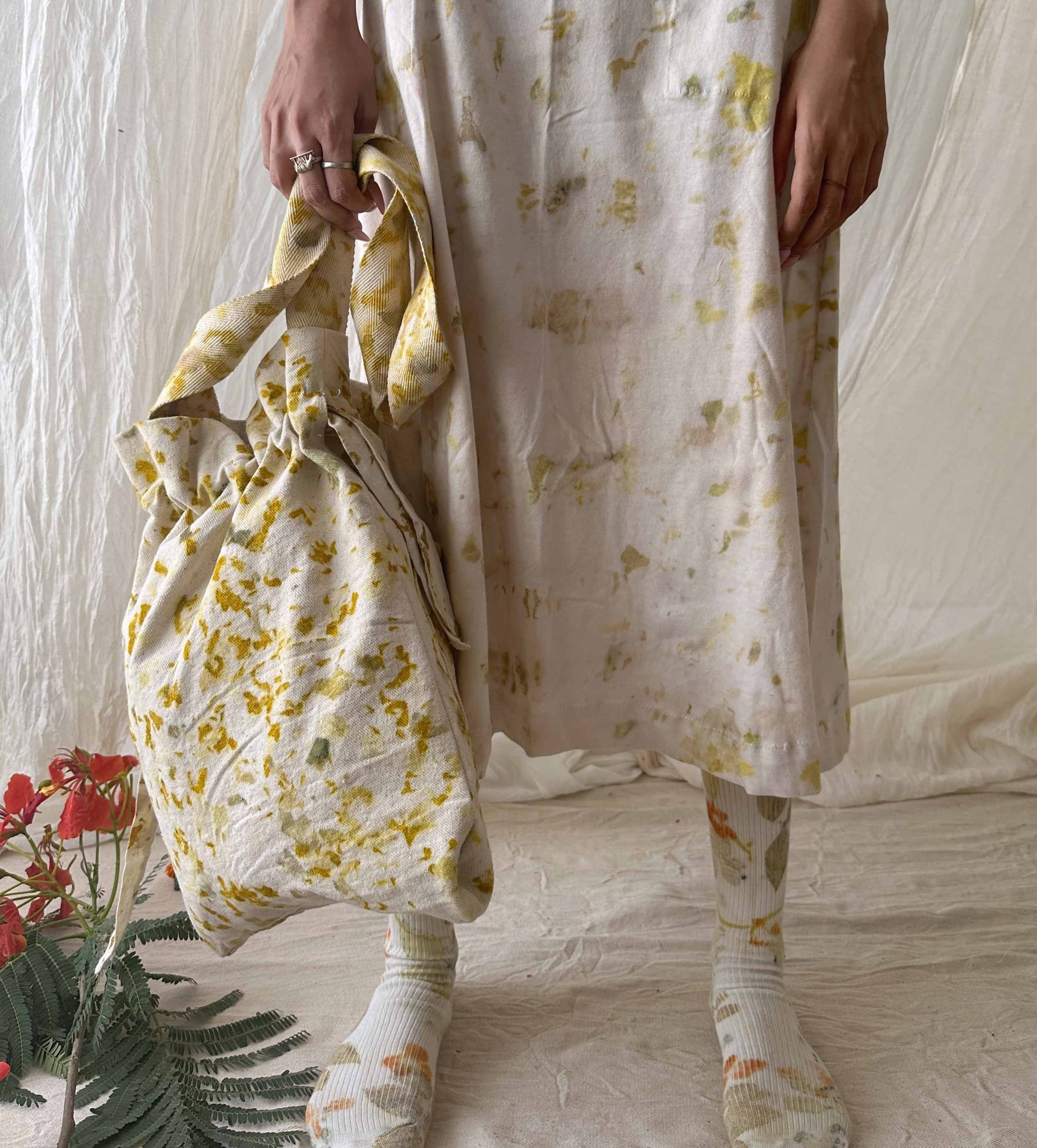 Hand-dyed using native Indian flowers from temples and homegrown gardens.