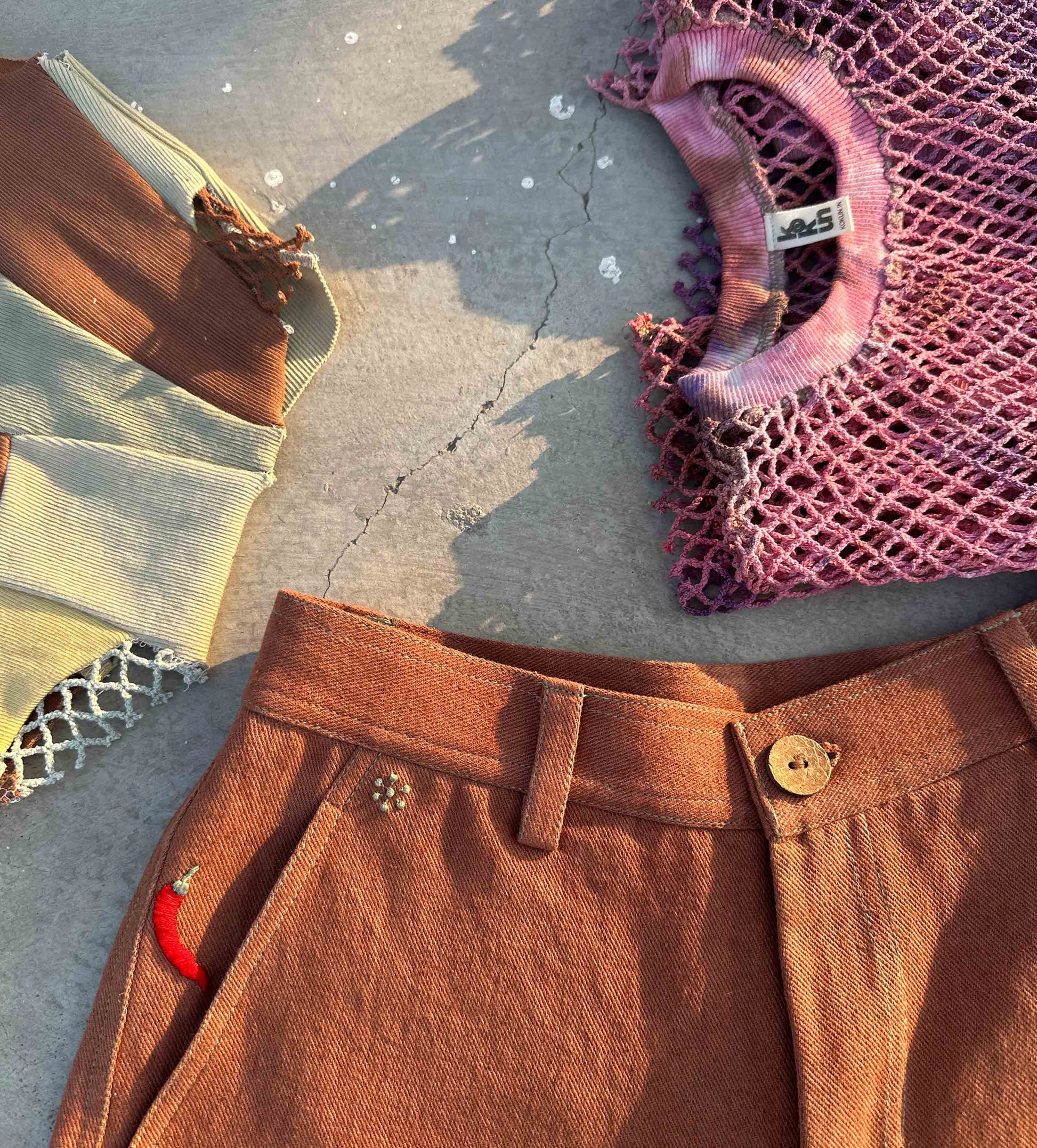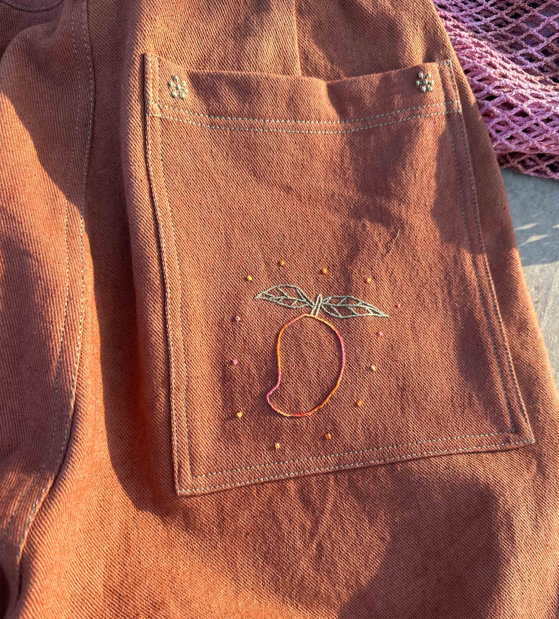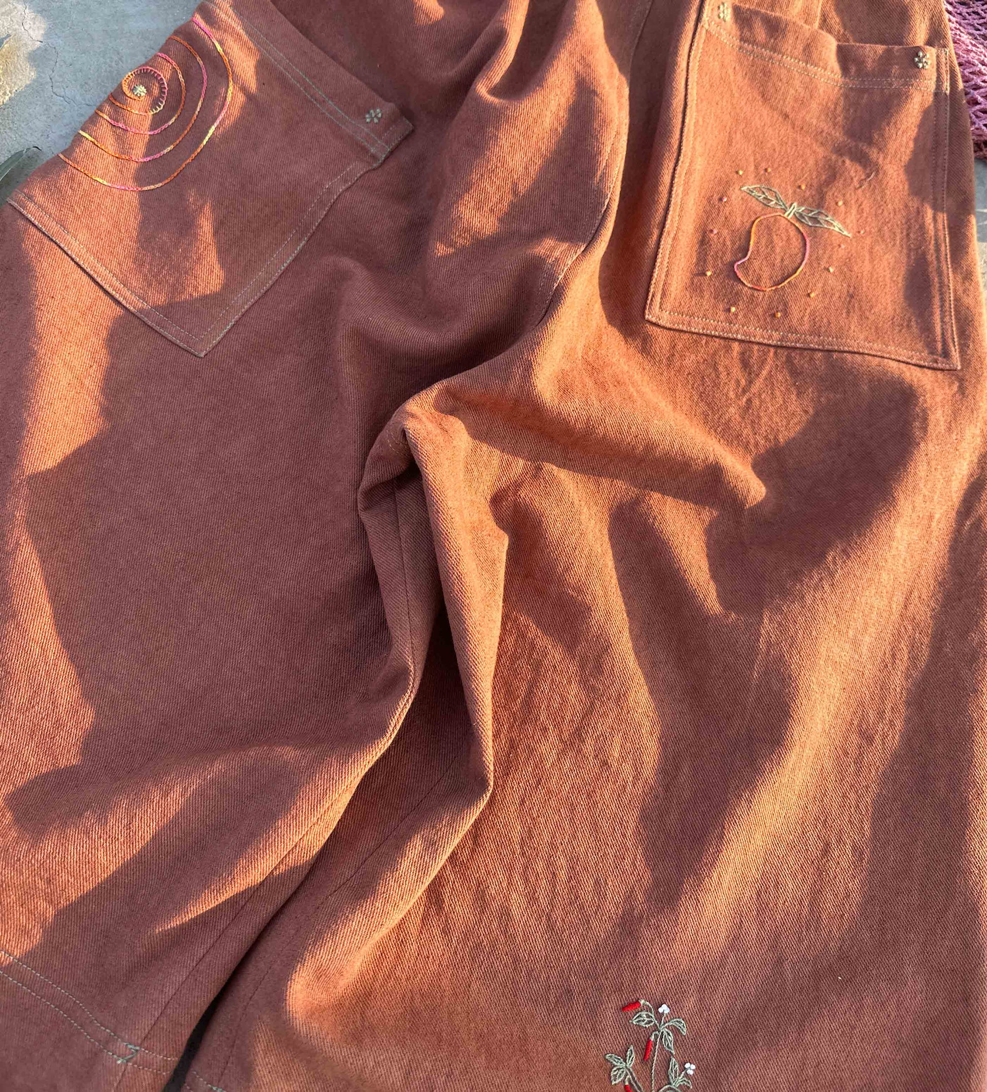 Jorts; jeans meet shorts- in an oversized, slouchy bottoms. They have nostalgic embroidered detailing handmade by rural women.