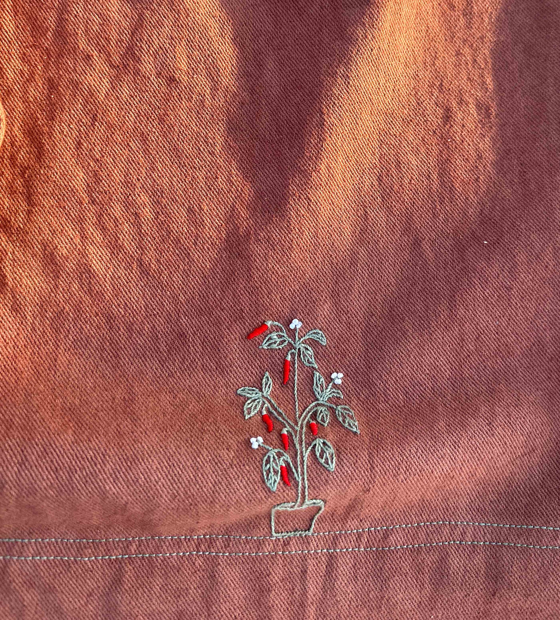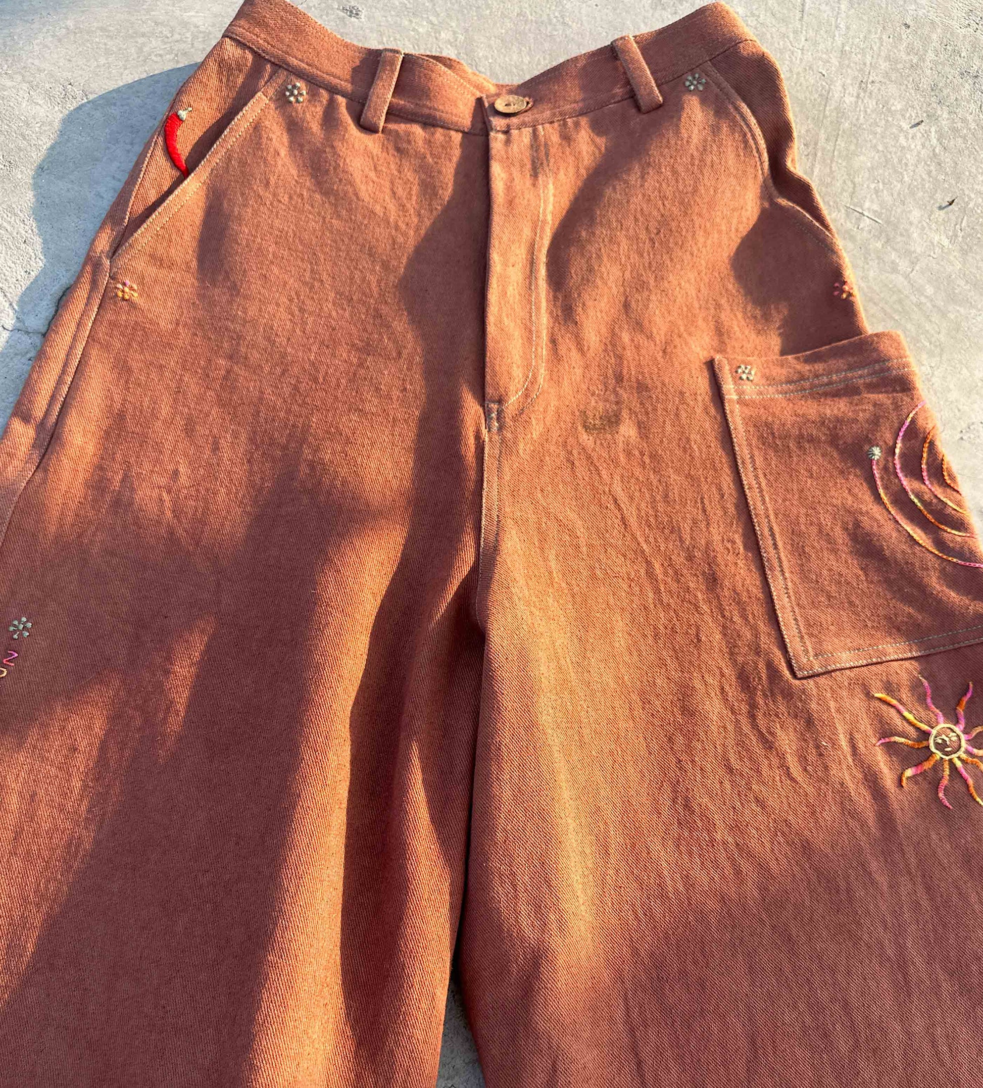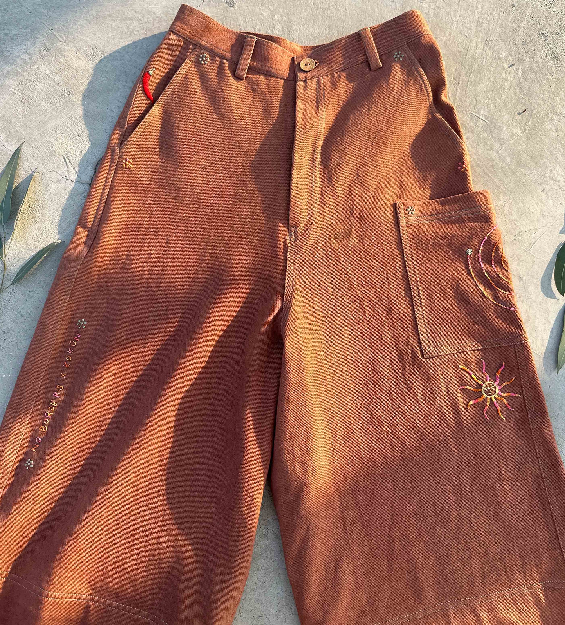 Jorts; jeans meet shorts- in an oversized, slouchy bottoms. They have nostalgic embroidered detailing handmade by rural women.