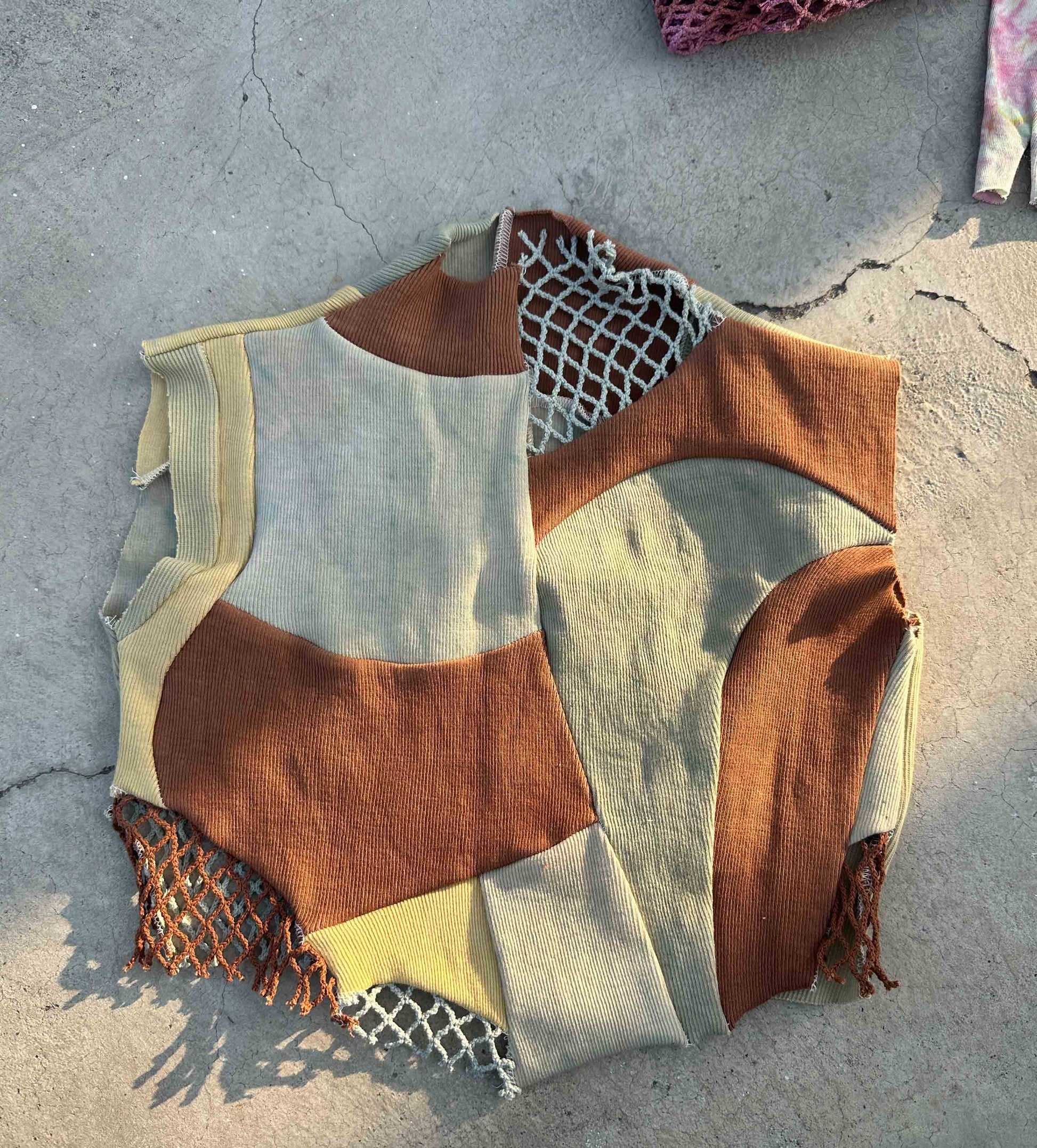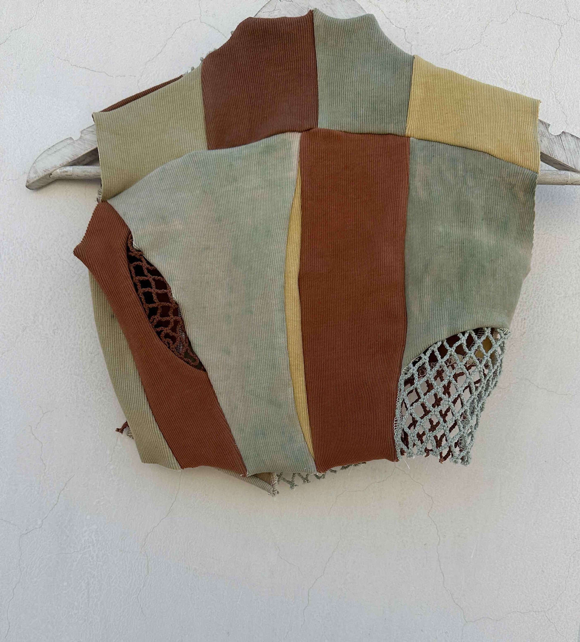 A snug, cropped top that hugs the body. It is naturally coloured with plant extracts from catechu, tea, pomegranate and hibiscus.