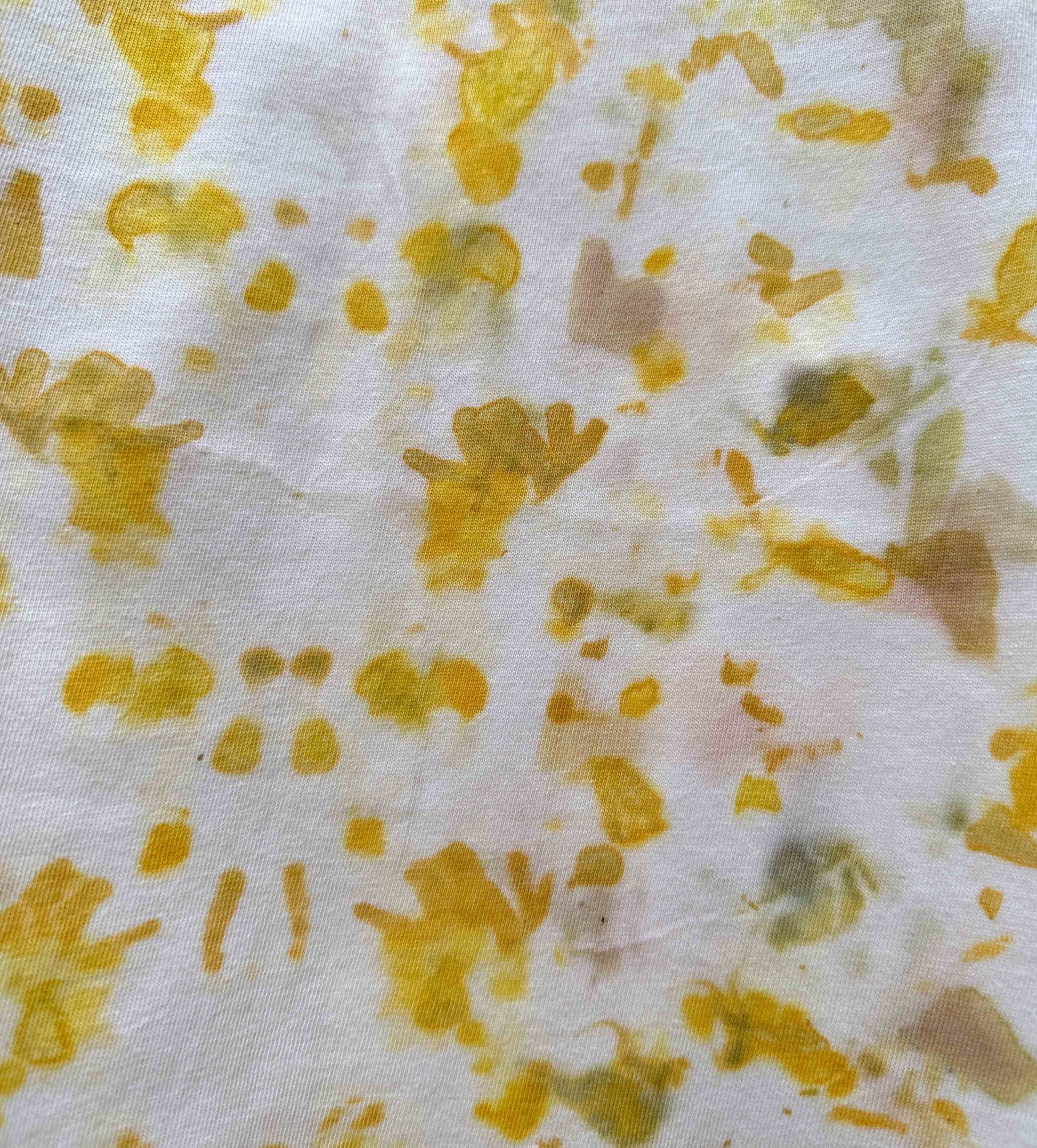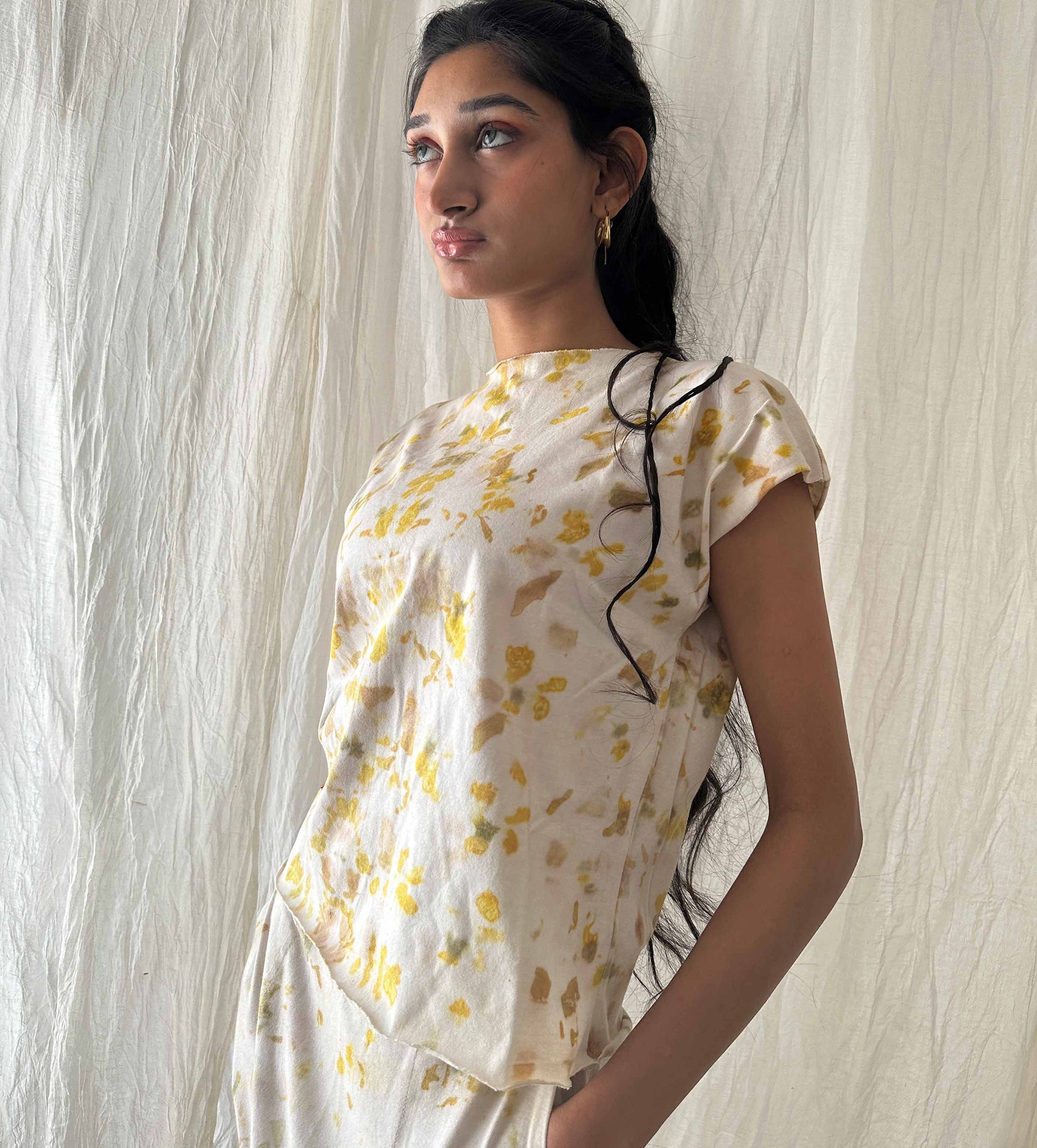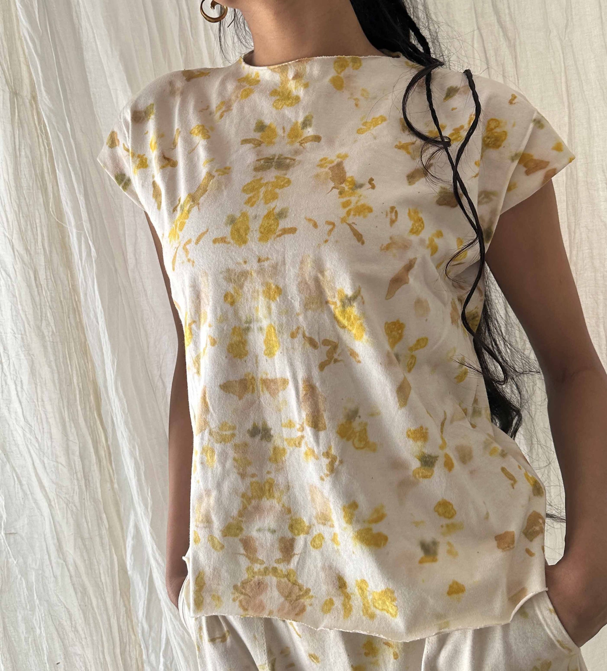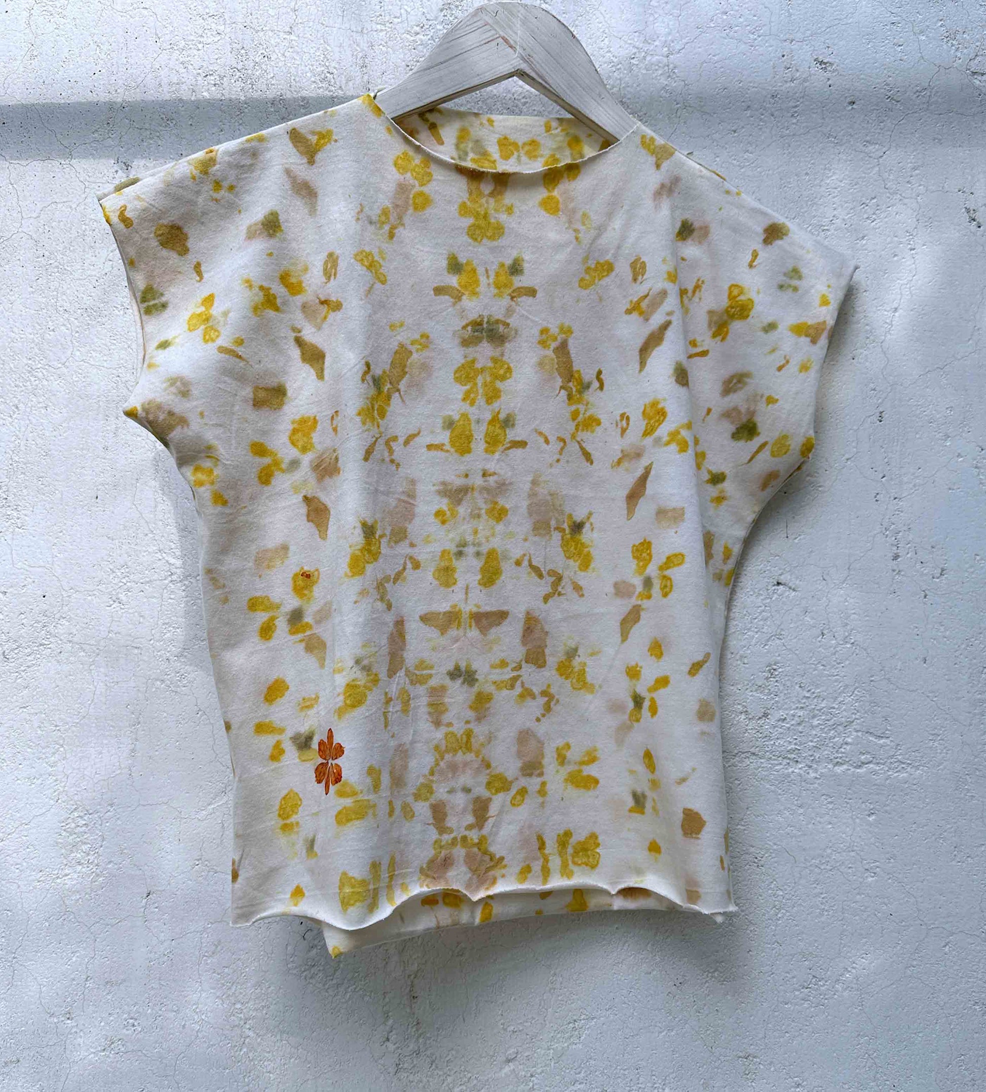 An organic stretchable cotton top, made in a regular shape, not too snug and not too big. It celebrates spring, with new and old - marigolds, which imprint the top throughout, along with a hint of cosmo