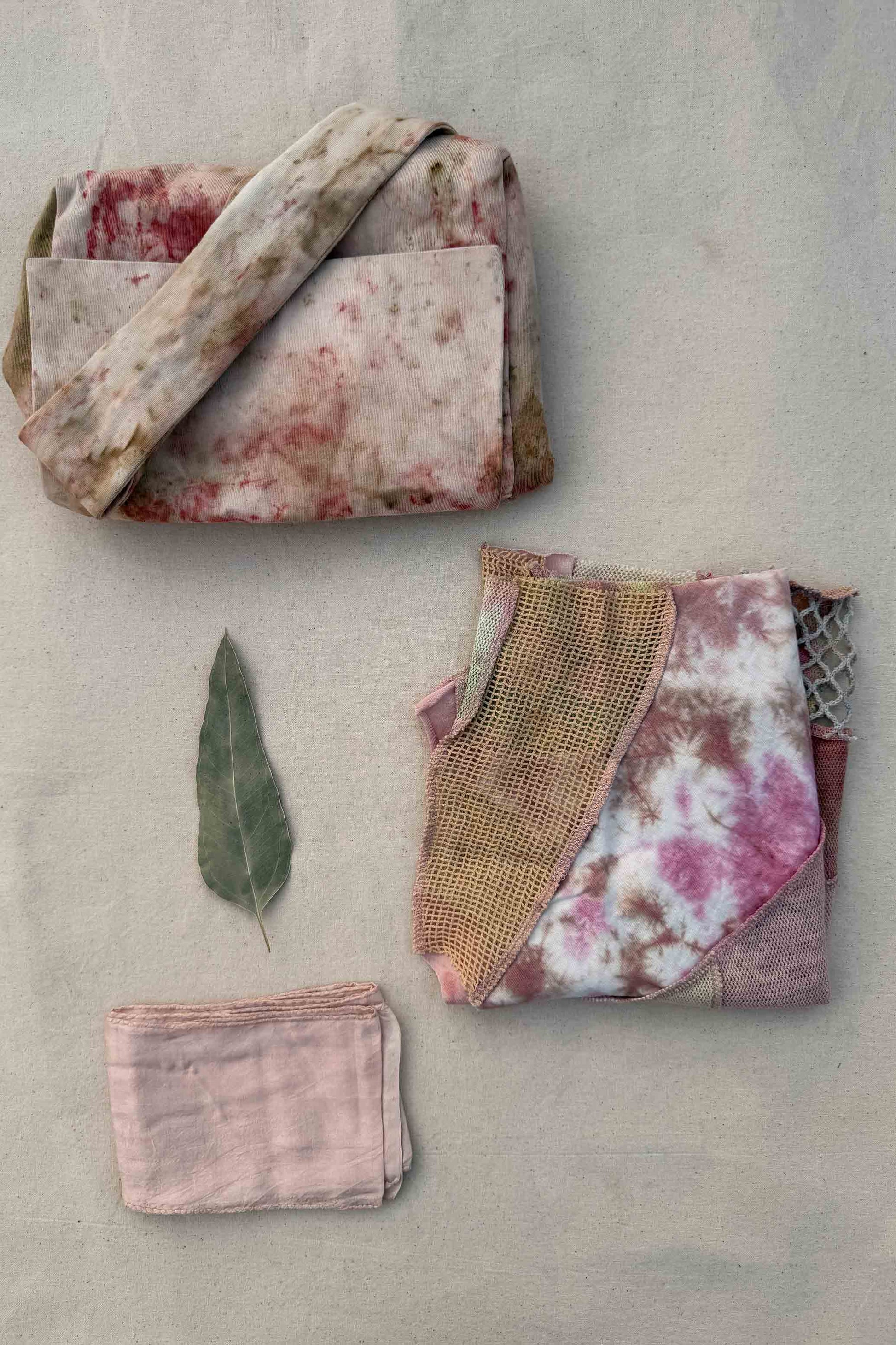 At the heart of this bundle is color: a gentle spectrum of rose, blush and petal pink coaxed from madder roots, hibiscus, roses and other botanical extracts, each leaving its own quiet imprint on the cloth.