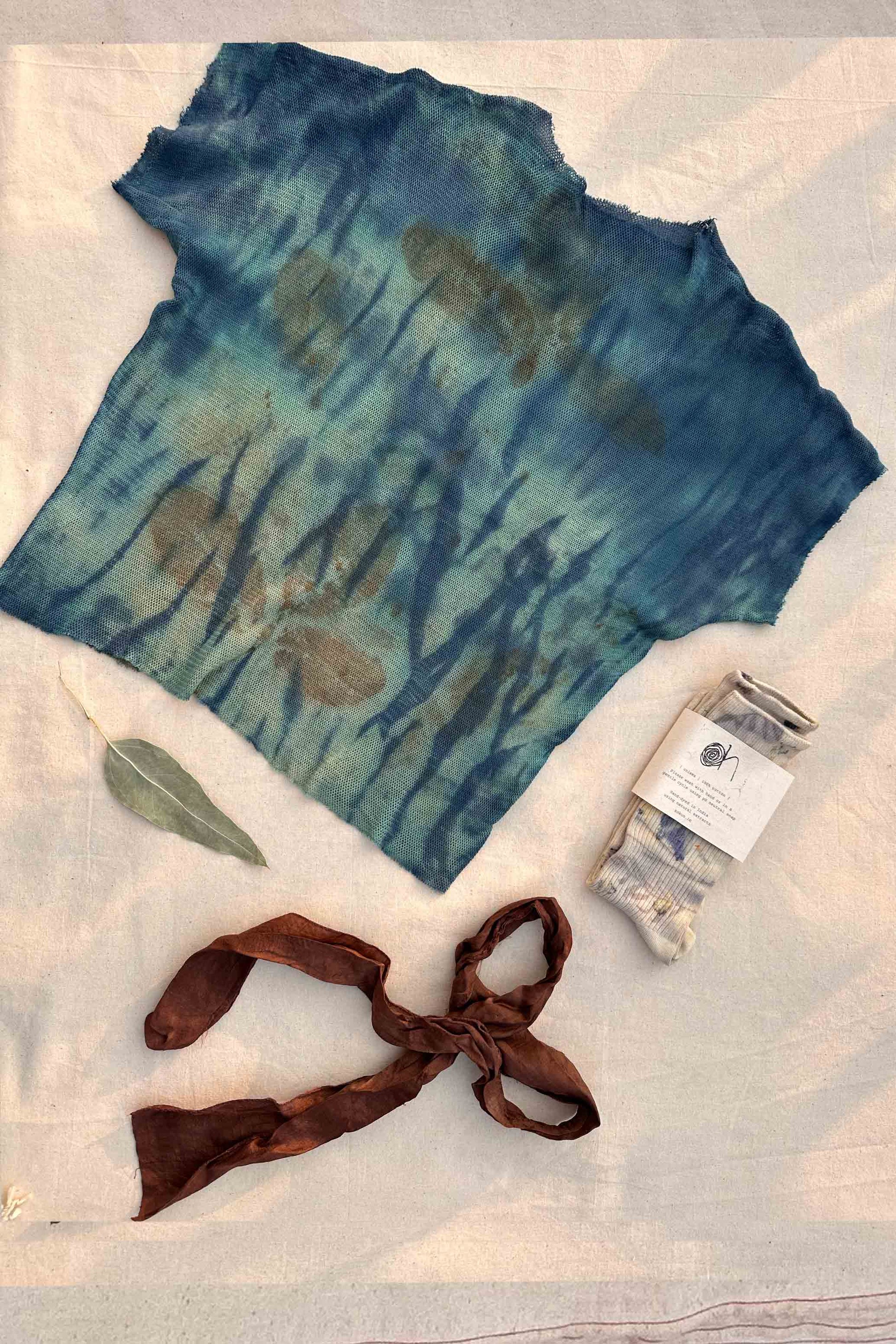 ꩜ A lightweight, stretchy top is plant dyed in deep water-greens and soft washes of Indigo, sitting close to the skin without feeling fussy—layer it under knits or wear it on its own