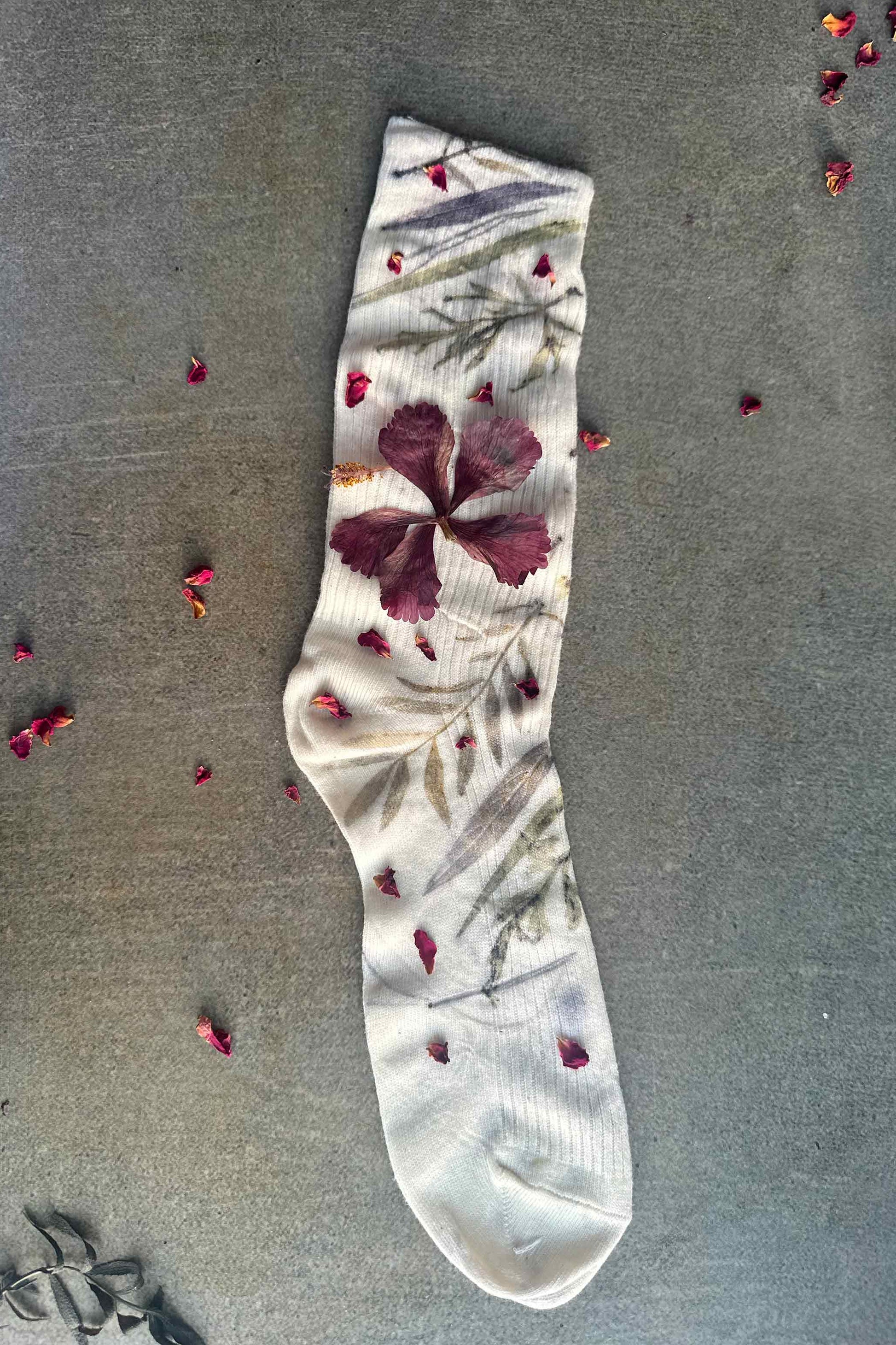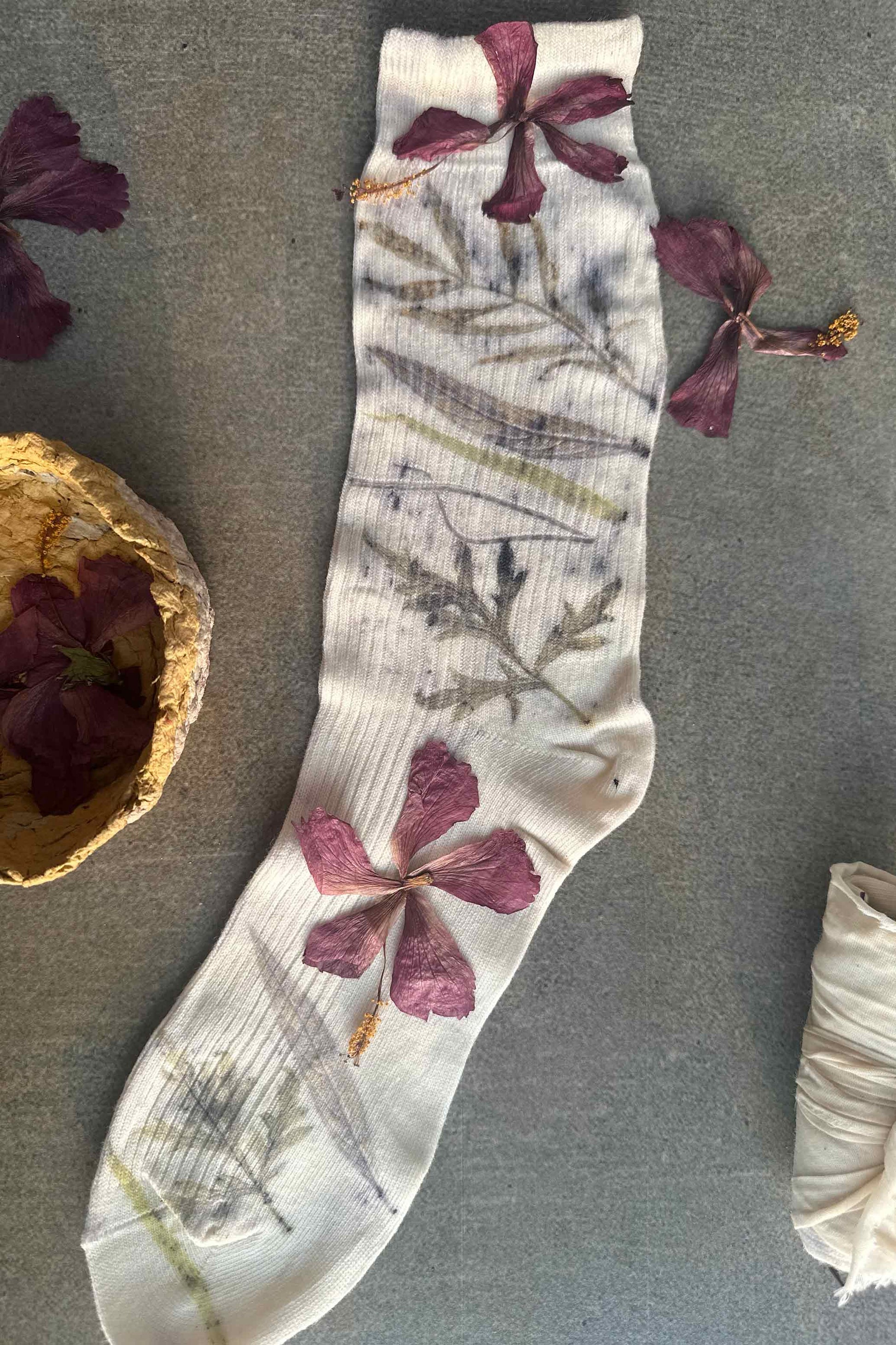 ꩜ A pair of 'Nimble', cotton socks eco-printed with hibiscus impressions in soft, inky tones.
