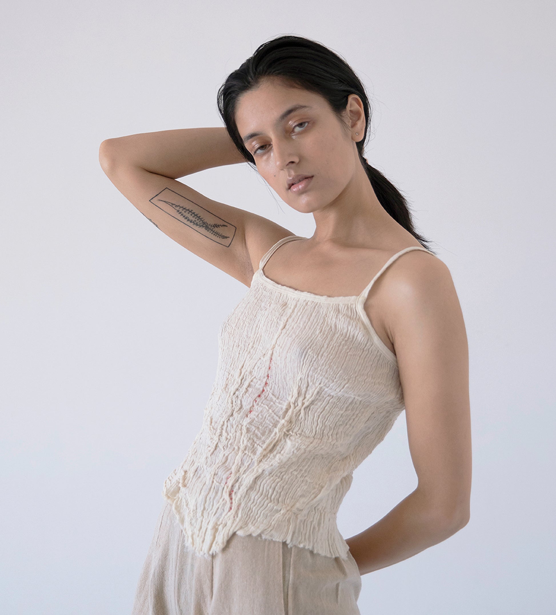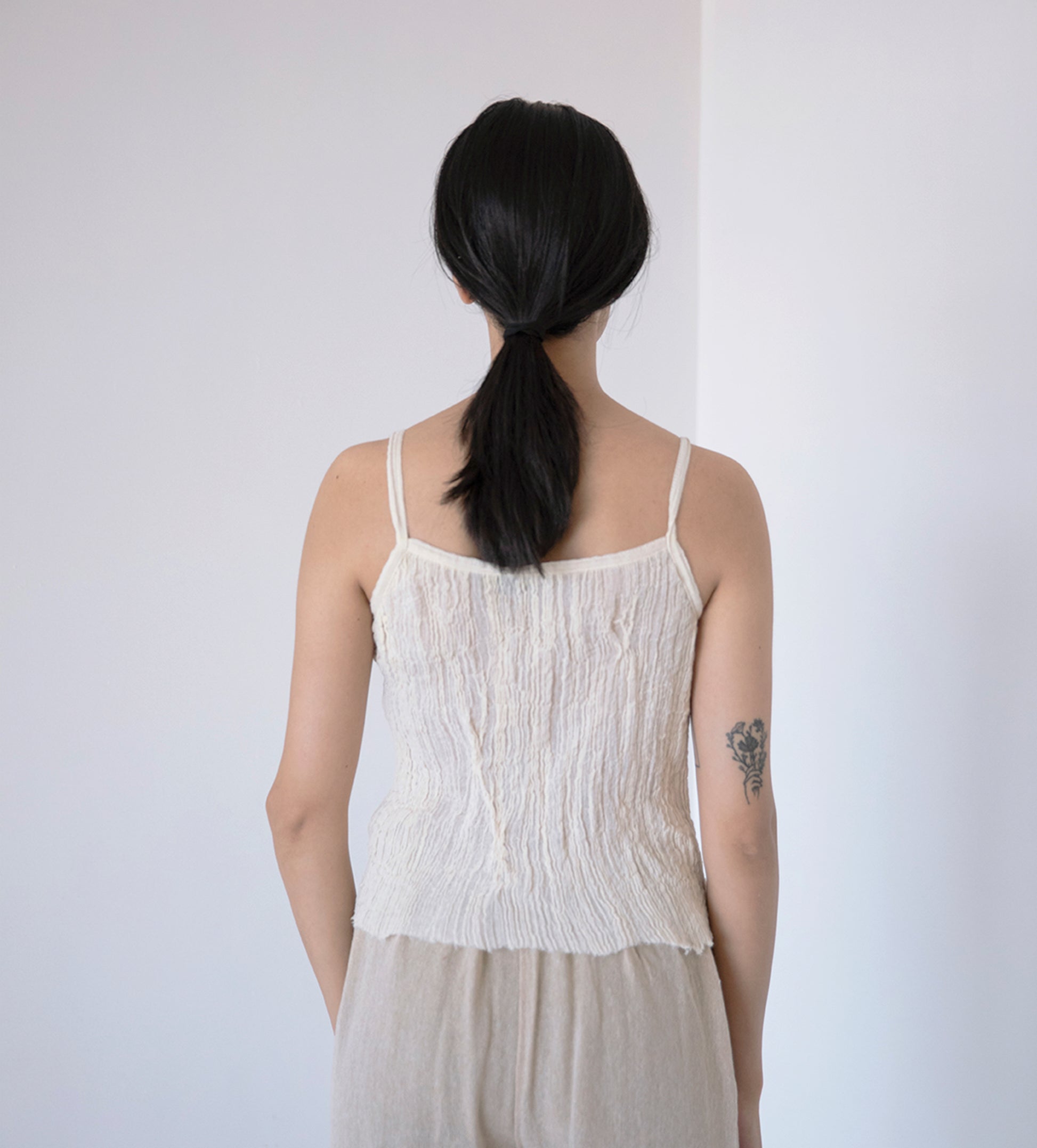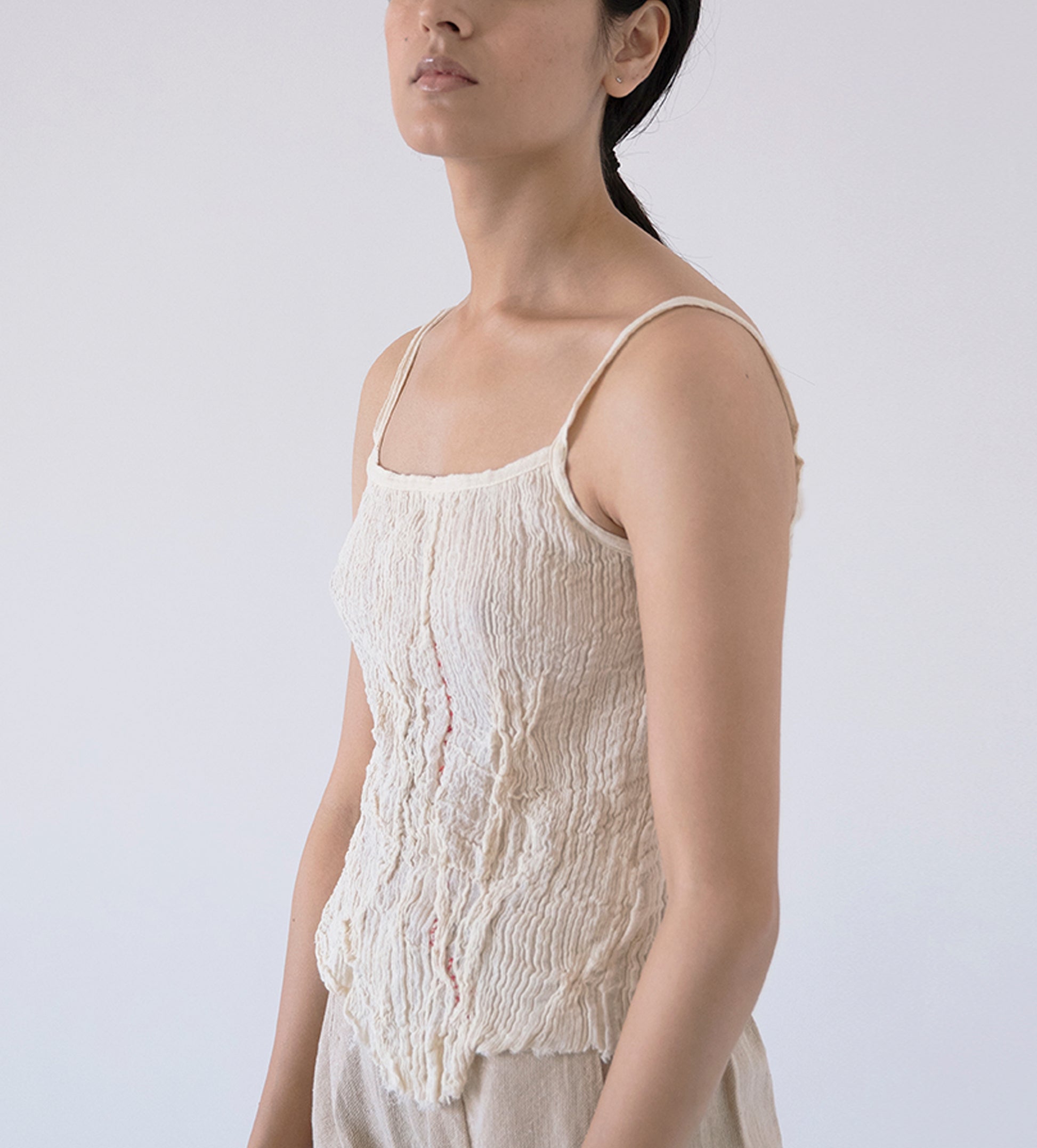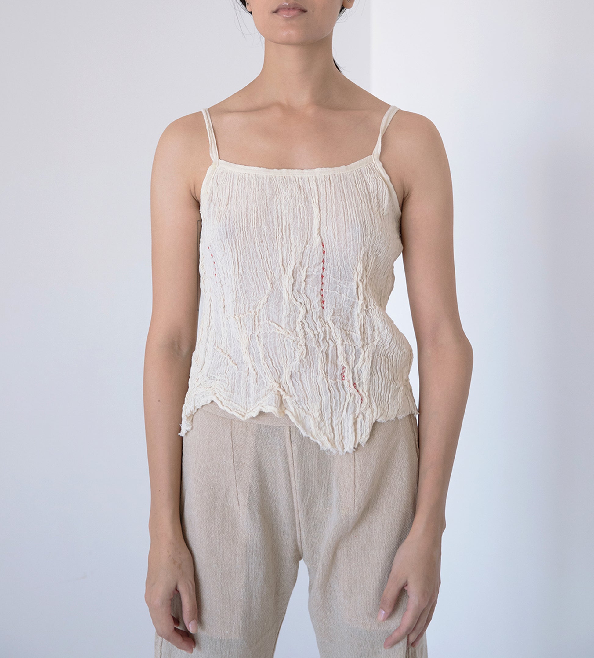 An unbleached top that gently hugs the body. Its soft, stretchable fabric acts as a second skin and is ideal for summers. It has a detailed hand made texture replicating the flow of water.
