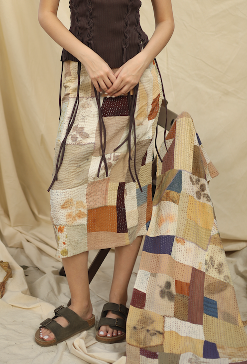 A one-of-kind skirt made by combining handwoven fabric pieces from our natural dyeing experiments. It is a piece of wearable art displaying the varied gifts of nature on textiles. This skirt is assembled by hand using tiny running stitches.